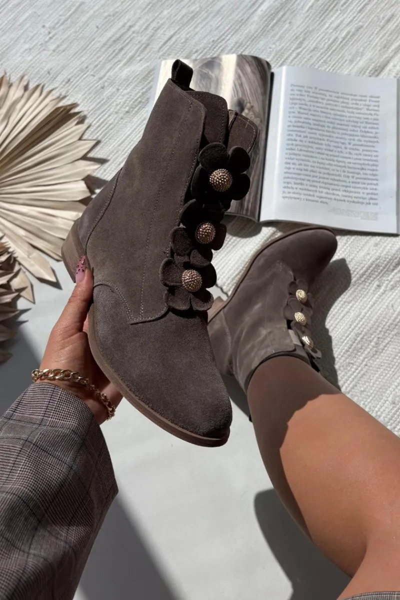 Botki damskie z naturalnego zamszu to doskonały wybór dla kobiet ceniących elegancję i subtelność. Wykonane z wysokiej jakości materiału, oferują nie tylko estetyczny wygląd, ale także komfort noszenia przez cały dzień. Zapinane na zamek błyskawiczny. Przód buta ozdobiony jest pięknymi, urokliwymi kwiatkami, które nadają im niepowtarzalnego, delikatnego charakteru. Dzięki temu stanowią doskonały dodatek do zarówno codziennych, jak i bardziej eleganckich stylizacji. Świetnie komponują się z sukienkami, spódnicami czy spodniami. Przy wyborze rozmiaru prosimy sugerować się tabelą rozmiarów.