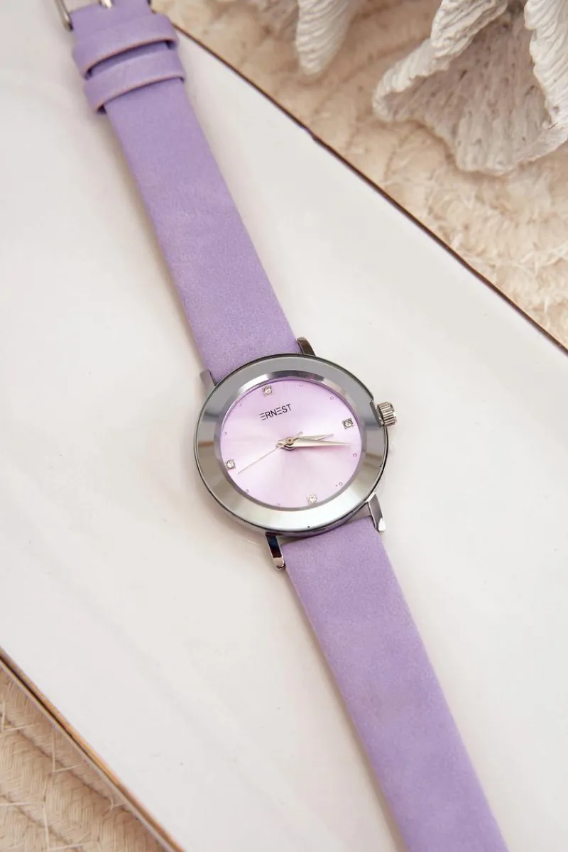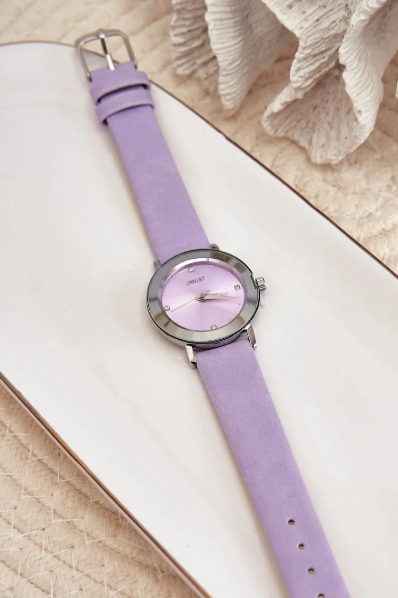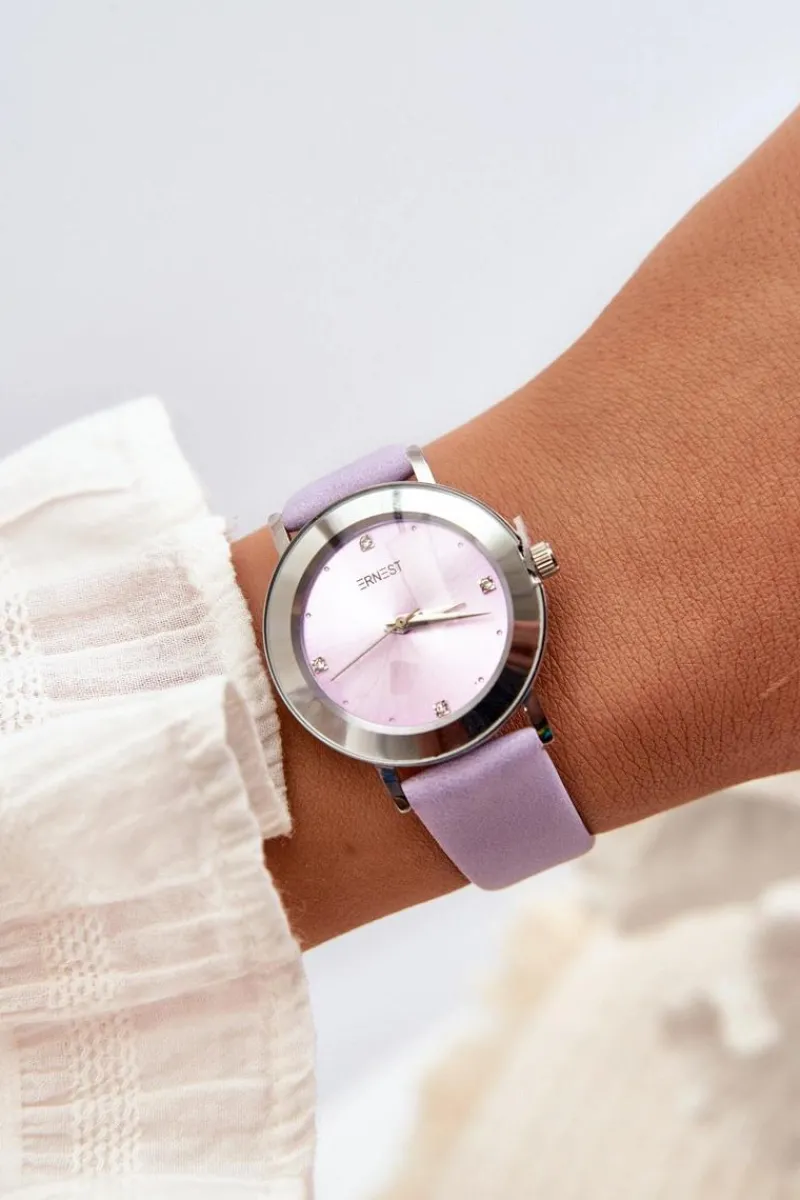 Klasyczny zegarek damski marki Ernest. Pasek wykonany z eko skóry. Minimalistyczny design sprawia, że doskonale komponuje się z różnymi stylizacjami, dodając im subtelnej elegancji.