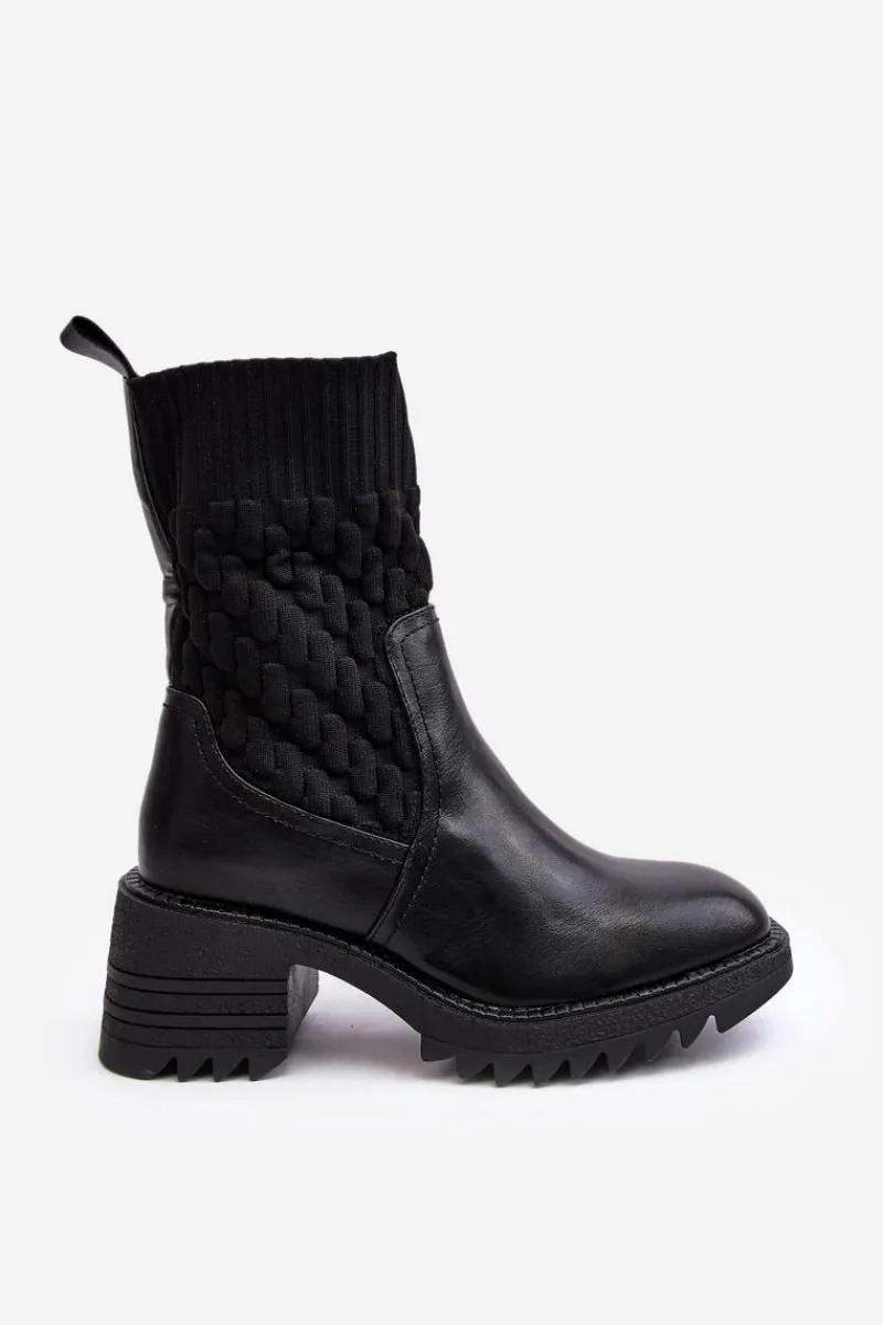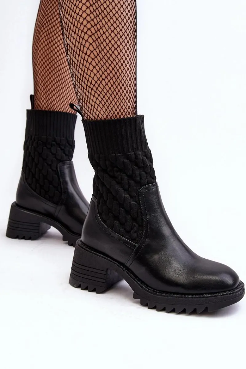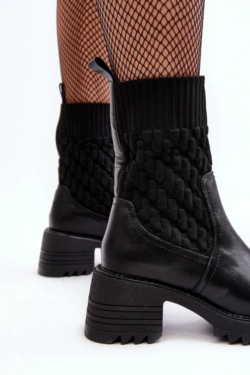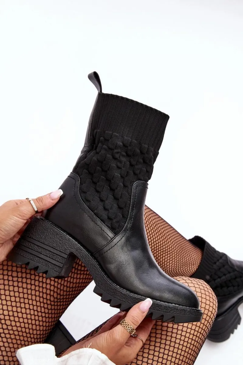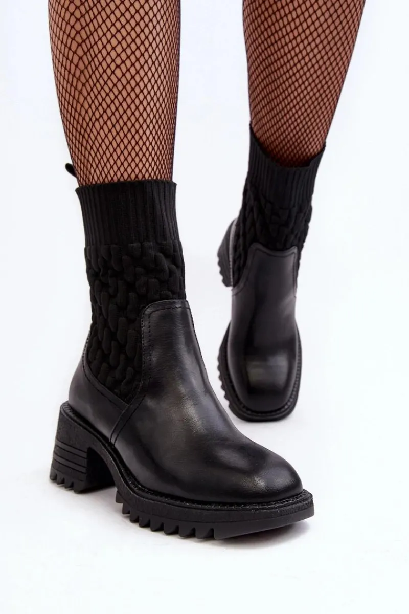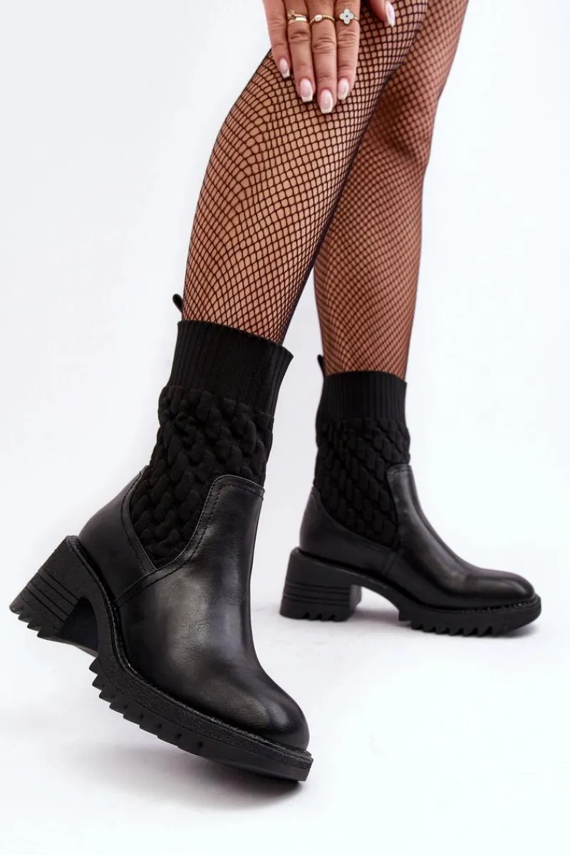 Botki damskie wykonane z połączenia eko skóry i tkaniny. Niski, masywny obcas oraz platforma zapewnią stabilność na każdym kroku. Noski w kwadrat. Usztywniony zapiętek. Środek ocieplony kocem obuwniczym wyłącznie na wysokości stopy. Przy wyborze rozmiaru prosimy sugerować się tabelą rozmiarów.