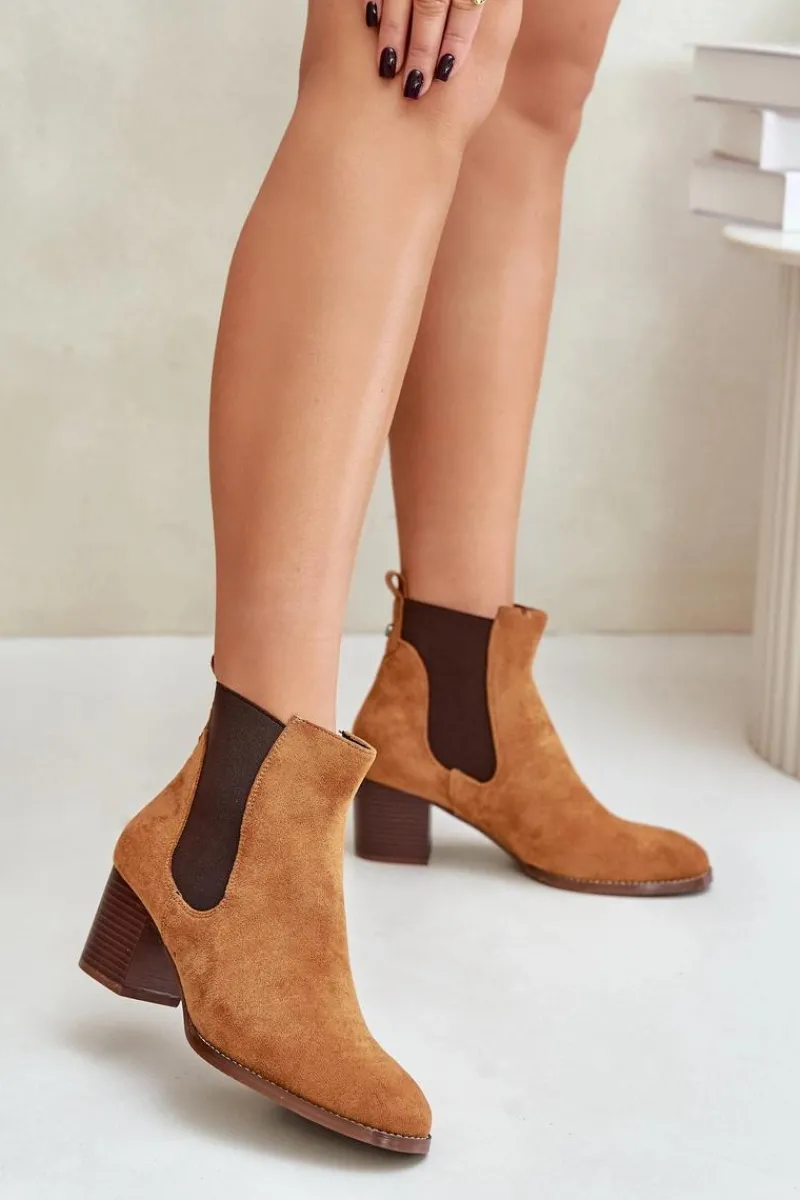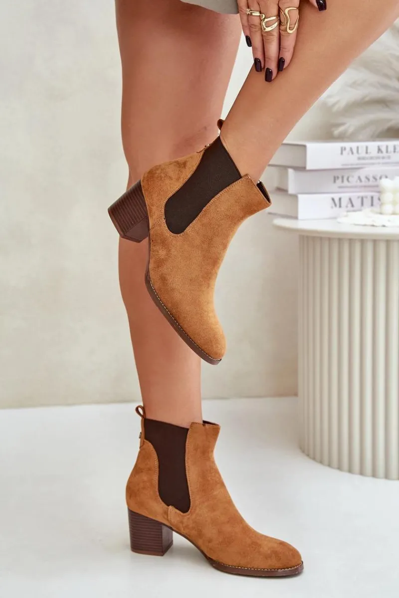 Botki wykonane z eko zamszu to elegancka opcja na każdą okazję. Osadzone na stabilnym obcasie typu słupek, z zaokrąglonymi noskami, łączą w sobie styl i wygodę. Na cholewce elastyczne wstawki. Wnętrze delikatnie ocieplane kocem obuwniczym zapewnia komfort w chłodniejsze dni. Idealne do codziennych stylizacji! Przy wyborze rozmiaru prosimy sugerować się tabelą rozmiarów.