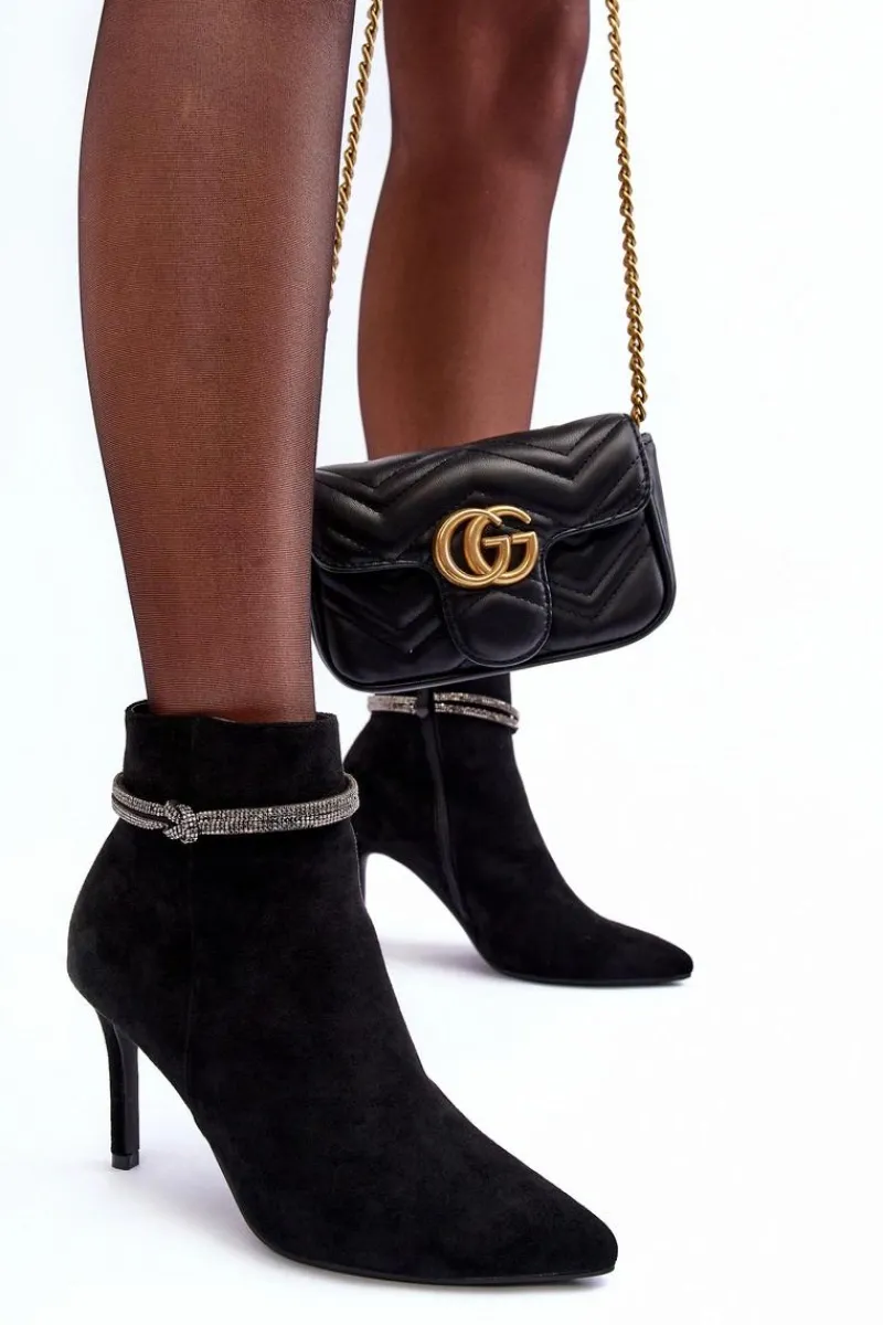 Botki damskie wykonane z eko zamszu. Osadzone na obcasie w postaci szpilki. Na cholewce dwa splecione paseczki, które posiadają liczne, błyszczące dżety. Model zapinany na suwak z boku. Noski w szpic optycznie wysmuklą nogi. Dodatkowo zapiętek jest usztywniony. Botki świetnie sprawdzą się w wielu stylizacjach np.: do sukienek, spódnic czy spodni. Koniecznie powinny znaleźć się w Twojej szafie! Przy wyborze rozmiaru prosimy sugerować się tabelą rozmiarów.