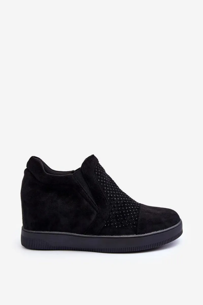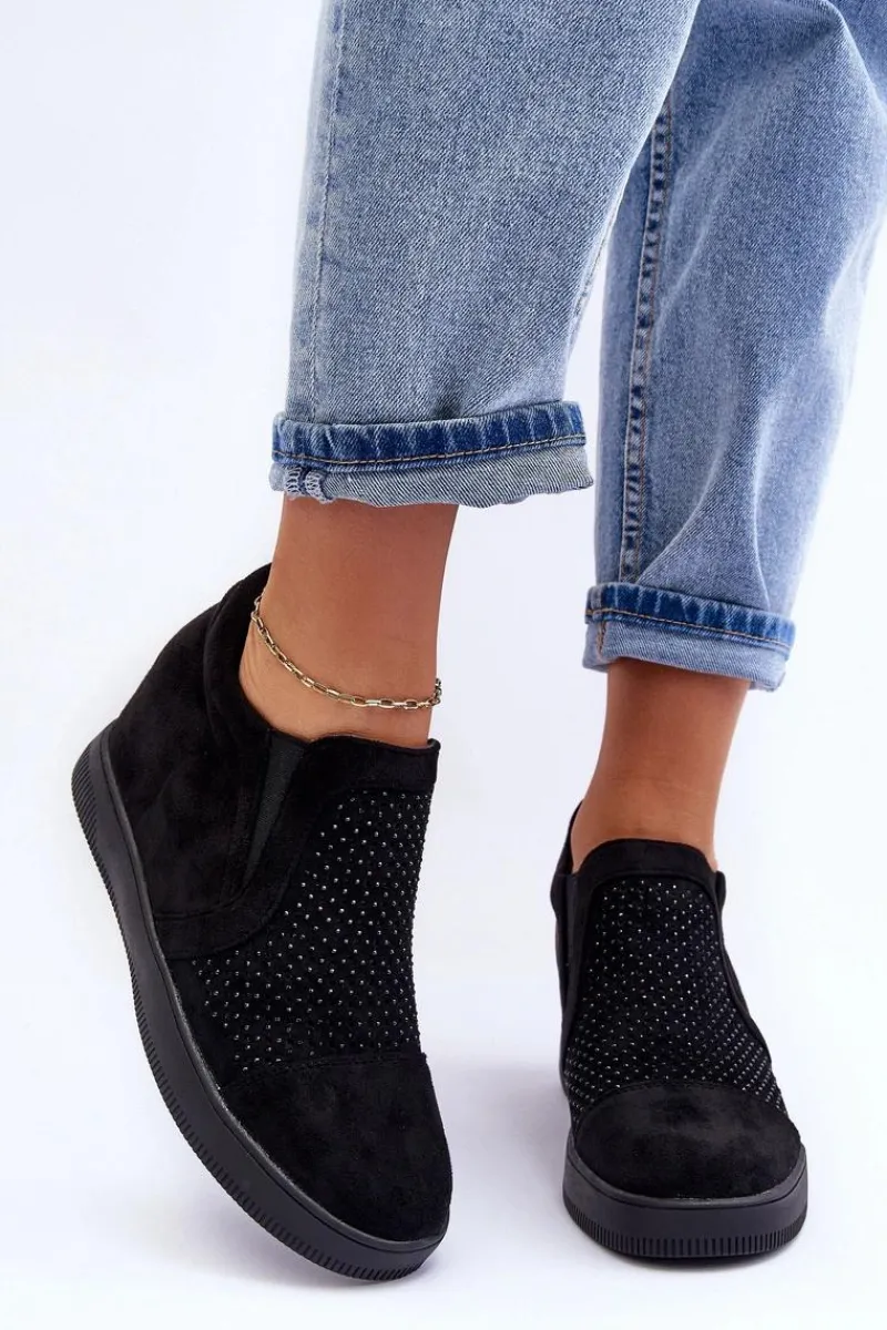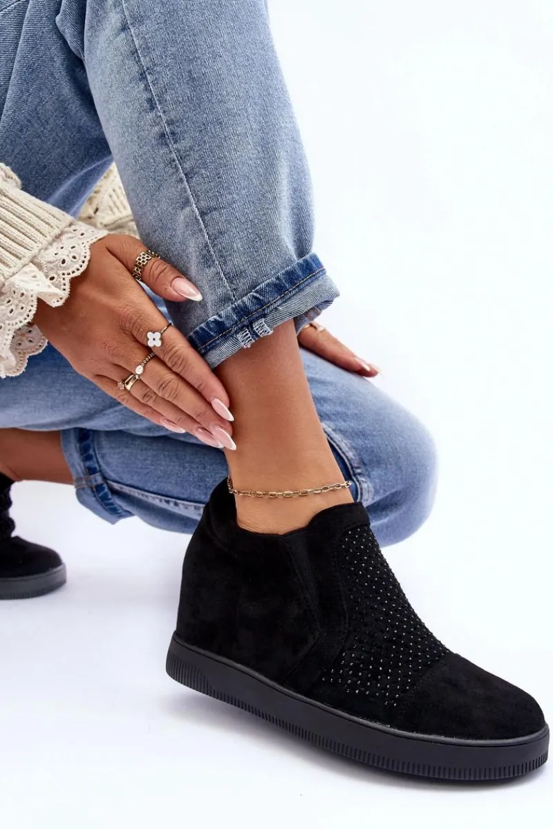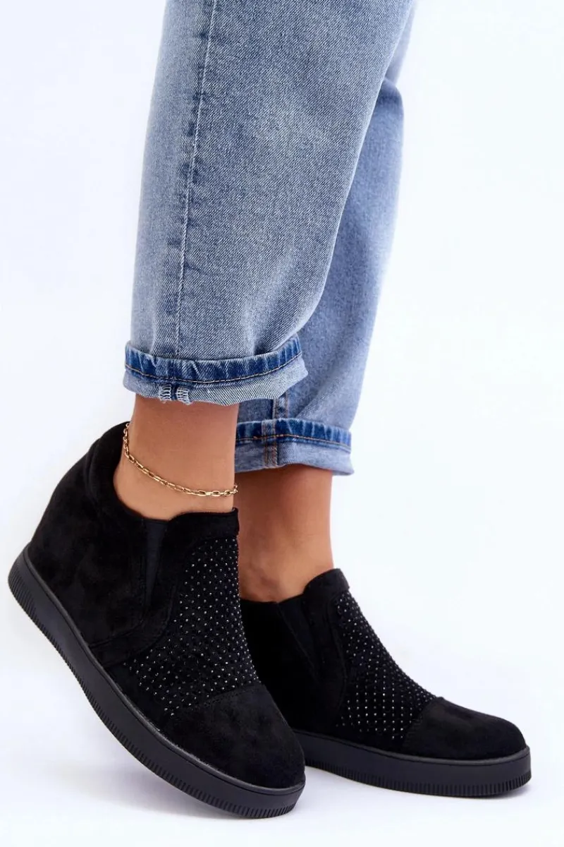 Niskie botki damskie osadzone na płaskiej podeszwie. Wykonane z eko zamszu. Przód ozdobiony małymi dżetami. Noski zaokrąglone, zapiętek usztywniony. Model wsuwany. Miękka eko skórzana wkładka zapewni komfortowe użytkowanie obuwia.
