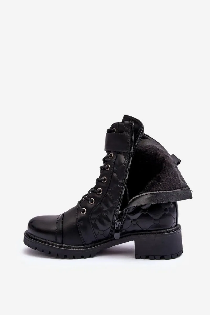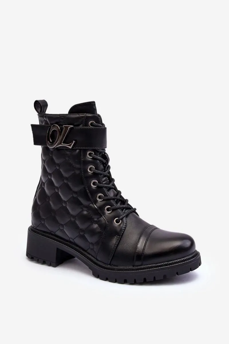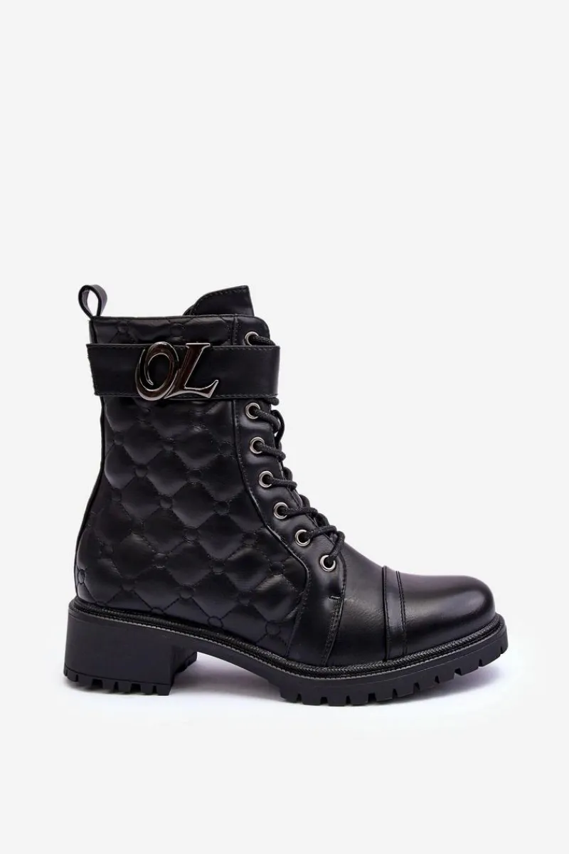Modne damskie botki wykonane z eko skóry. Osadzone na platformie i płaskim, stabilnym obcasie. Na cholewce znajdują się liczne przeszycia oraz ozdoba na pasku. Zapinane na suwak po wewnętrznej stronie oraz dodatkowo sznurowane. Środek ocieplony kocem obuwniczym. Idealny model do jesiennych stylizacji! Przy wyborze rozmiaru prosimy sugerować się tabelą rozmiarów.