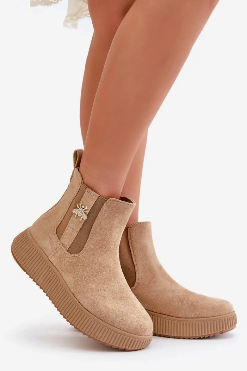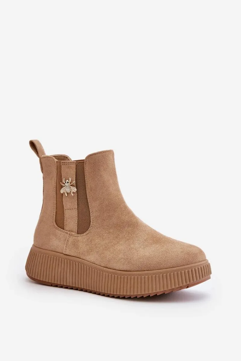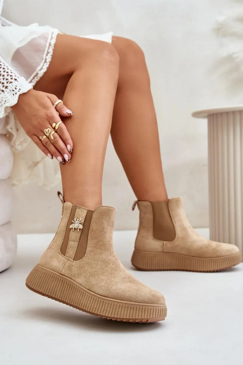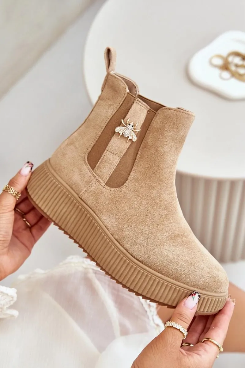 Damskie botki wykonane z miękkiego eko zamszu, które doskonale łączą styl z funkcjonalnością. Osadzone na wygodnej platformie, zapewniają dodatkową wysokość i stabilność, idealne na co dzień. Zaokrąglone noski nadają im klasycznego wyglądu, a elastyczne wstawki po bokach cholewki gwarantują łatwość zakładania i zdejmowania. Dodatkowym atutem jest urocza przypinka, która dodaje subtelnego uroku i wyjątkowości temu modelowi. Wsuwane botki to świetny wybór na różne okazje!