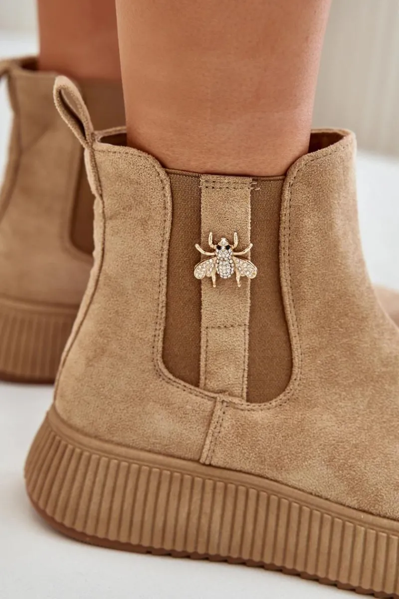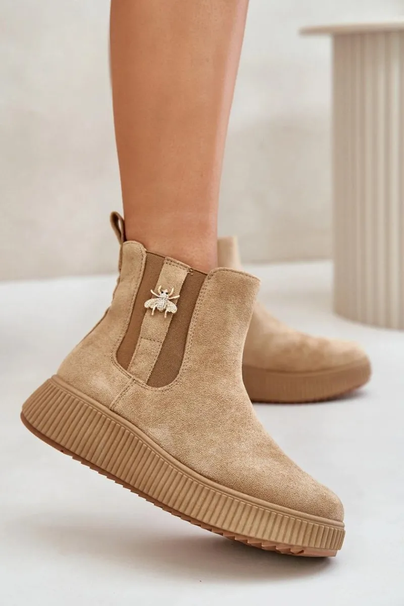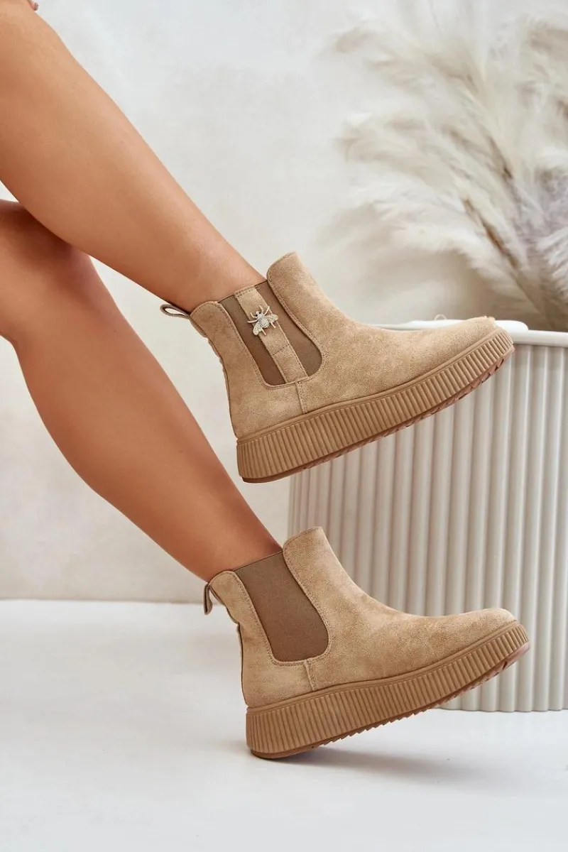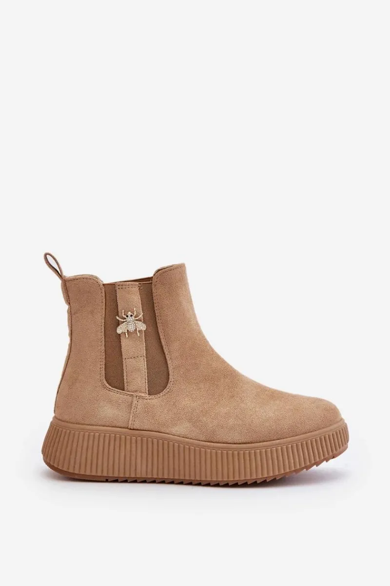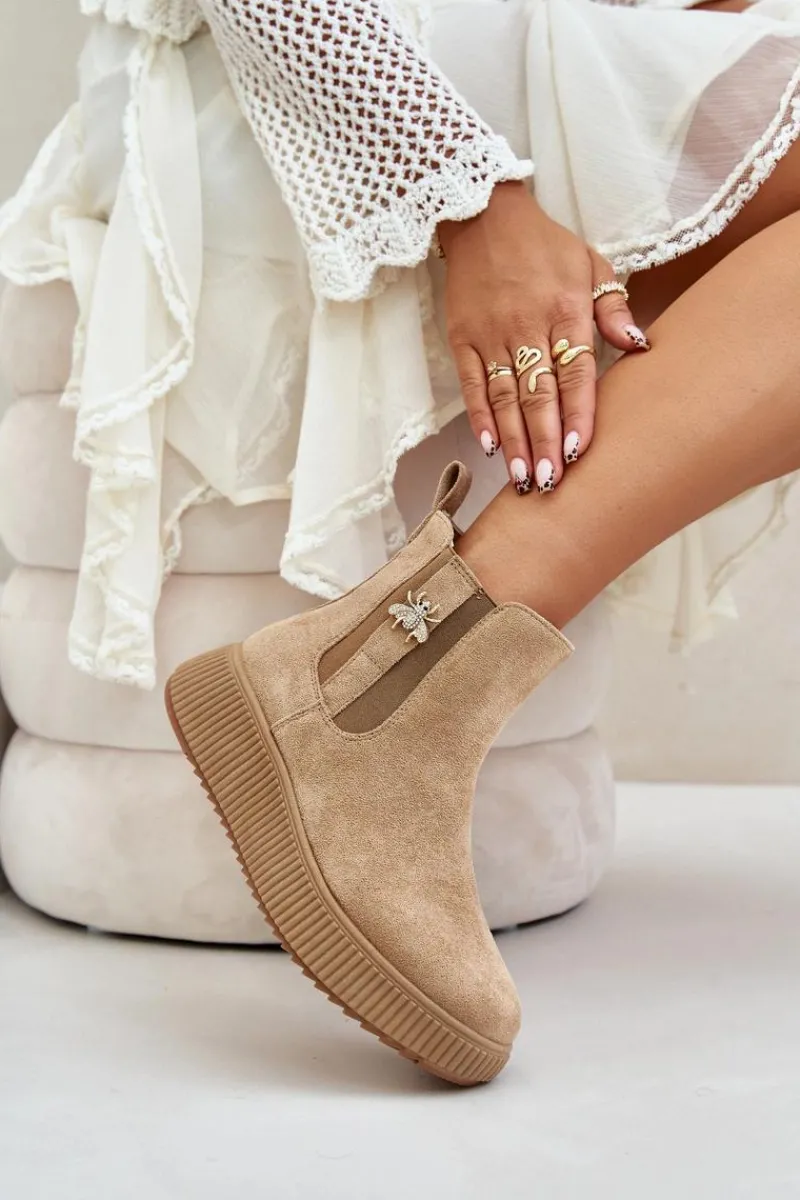 Damskie botki wykonane z miękkiego eko zamszu, które doskonale łączą styl z funkcjonalnością. Osadzone na wygodnej platformie, zapewniają dodatkową wysokość i stabilność, idealne na co dzień. Zaokrąglone noski nadają im klasycznego wyglądu, a elastyczne wstawki po bokach cholewki gwarantują łatwość zakładania i zdejmowania. Dodatkowym atutem jest urocza przypinka, która dodaje subtelnego uroku i wyjątkowości temu modelowi. Wsuwane botki to świetny wybór na różne okazje!