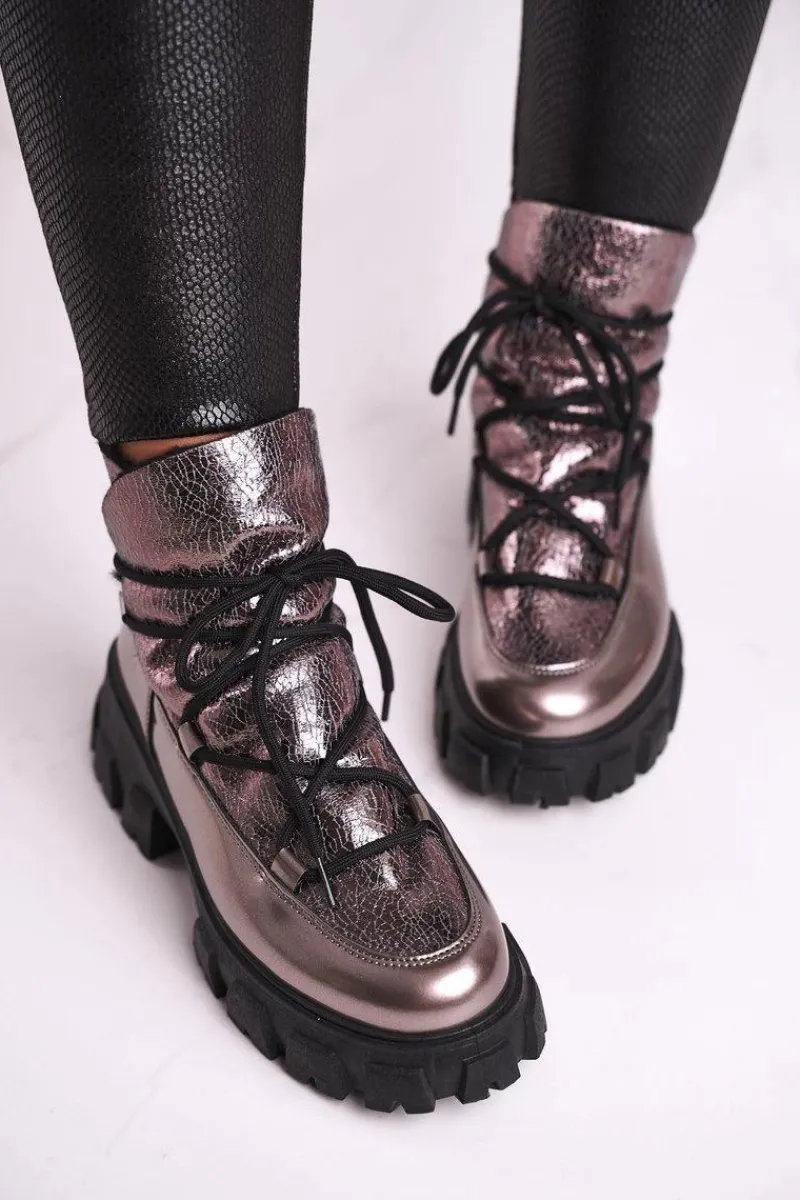 Czy może nas coś jeszcze zaskoczyć? Oczywiście! Spójrz na te przepiękne botki! Botki wykonane ze skóry ekologicznej, wewnątrz ocieplone ciepłym kocem obuwniczym, więc o ciepło w chłodnie dni nie musisz się martwić. Masywna podeszwa, wysoka miękka cholewka – botki świetnie wpiszą się w stylizacje glam rock lub grunge. Przy wyborze rozmiaru prosimy sugerować się tabelą rozmiarów.