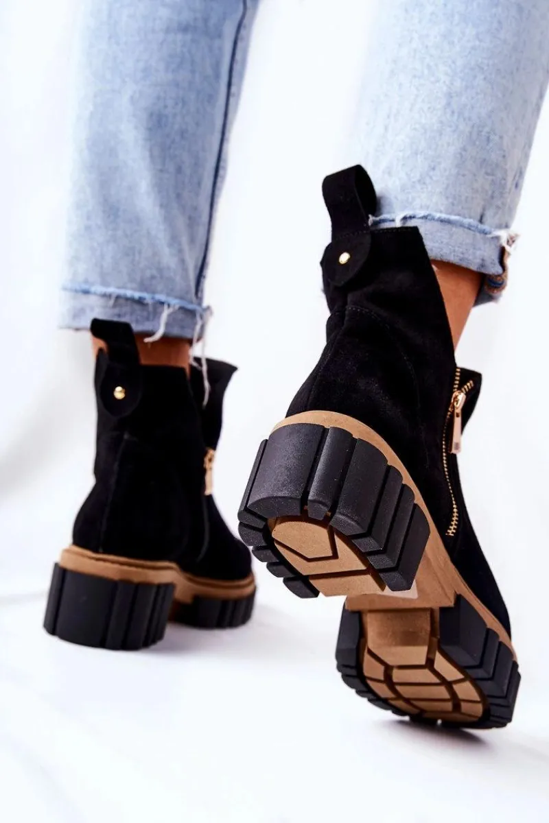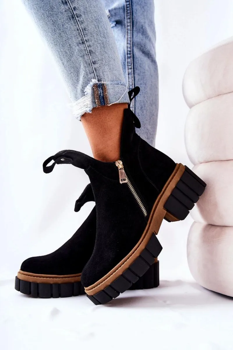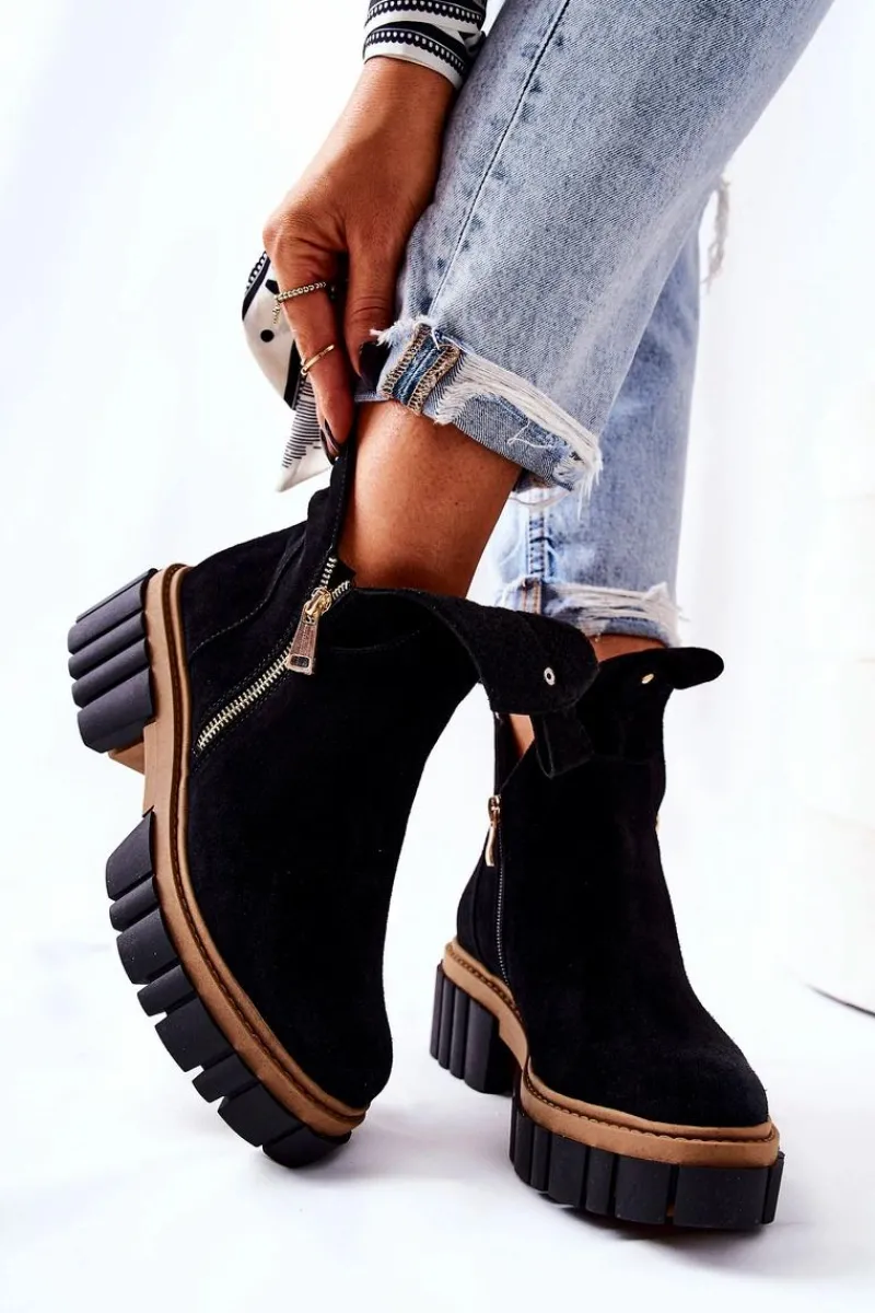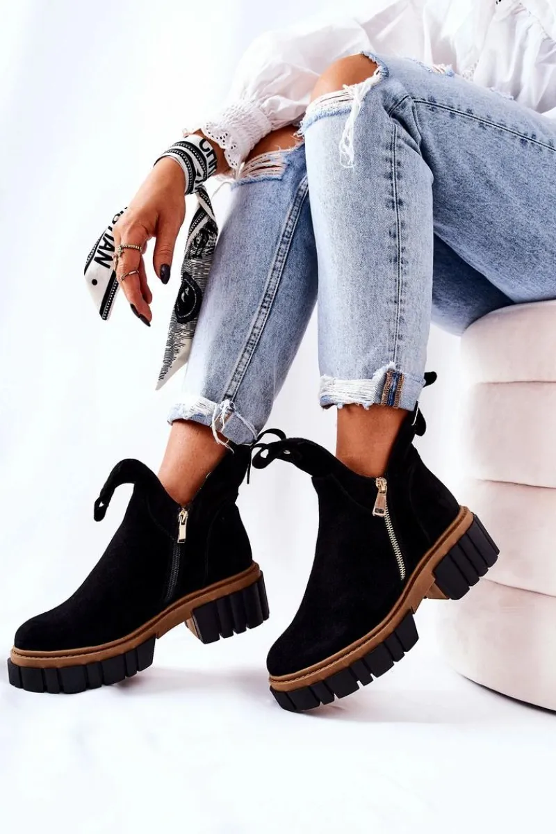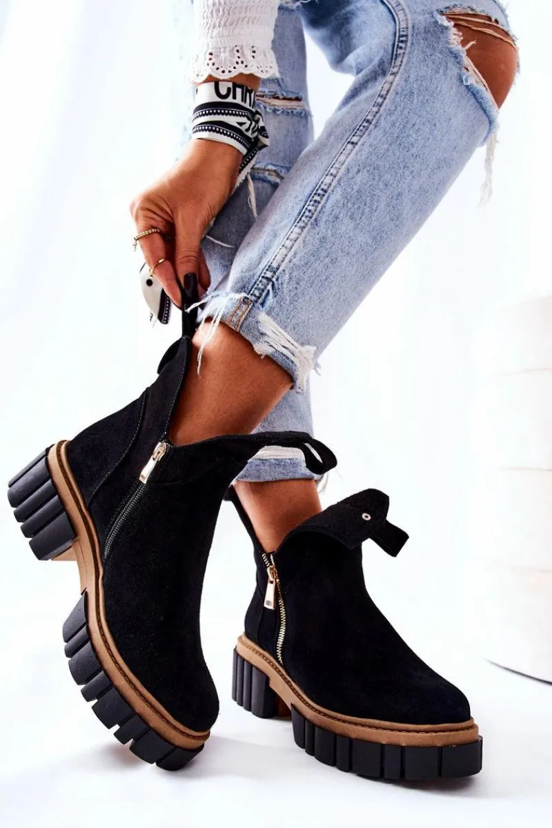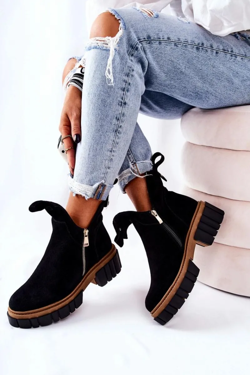 Botki z wycięciem wyglądają niezwykle modnie i stylowo. Wykonane zostały z naturalnego zamszu. Środek jest ocieplany kocem obuwniczym. Zapinane z obu stron na dwa suwaki. Botki będą pasować na wiele okazji. Podeszwa oraz masywny obcas zapewnią stabilność. Koniecznie musisz je mieć! Nie czekaj aż znikną!Przy wyborze rozmiaru prosimy sugerować się tabelą rozmiarów.