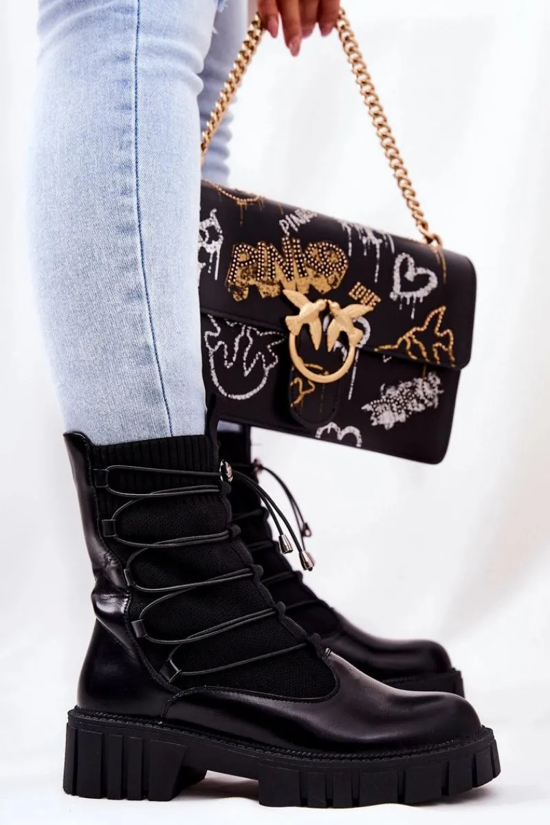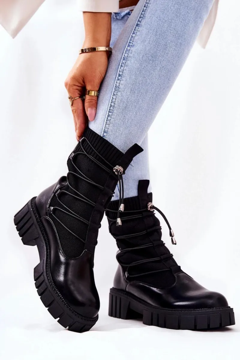 Świetne botki, które spełnią Twoje wymagania! Miękka skarpetowa cholewka oraz masywna podeszwa – ten model wyrazi Twój charakter! Modny fason z gumką ze ściągaczem u góry cholewki. Wykonane z eko skóry oraz tkaniny. Delikatne ocieplenie w postaci futerka zapewni ochronę przed zimnem. Koniecznie musisz je mieć! Przy wyborze rozmiaru prosimy sugerować się tabelą rozmiarów.