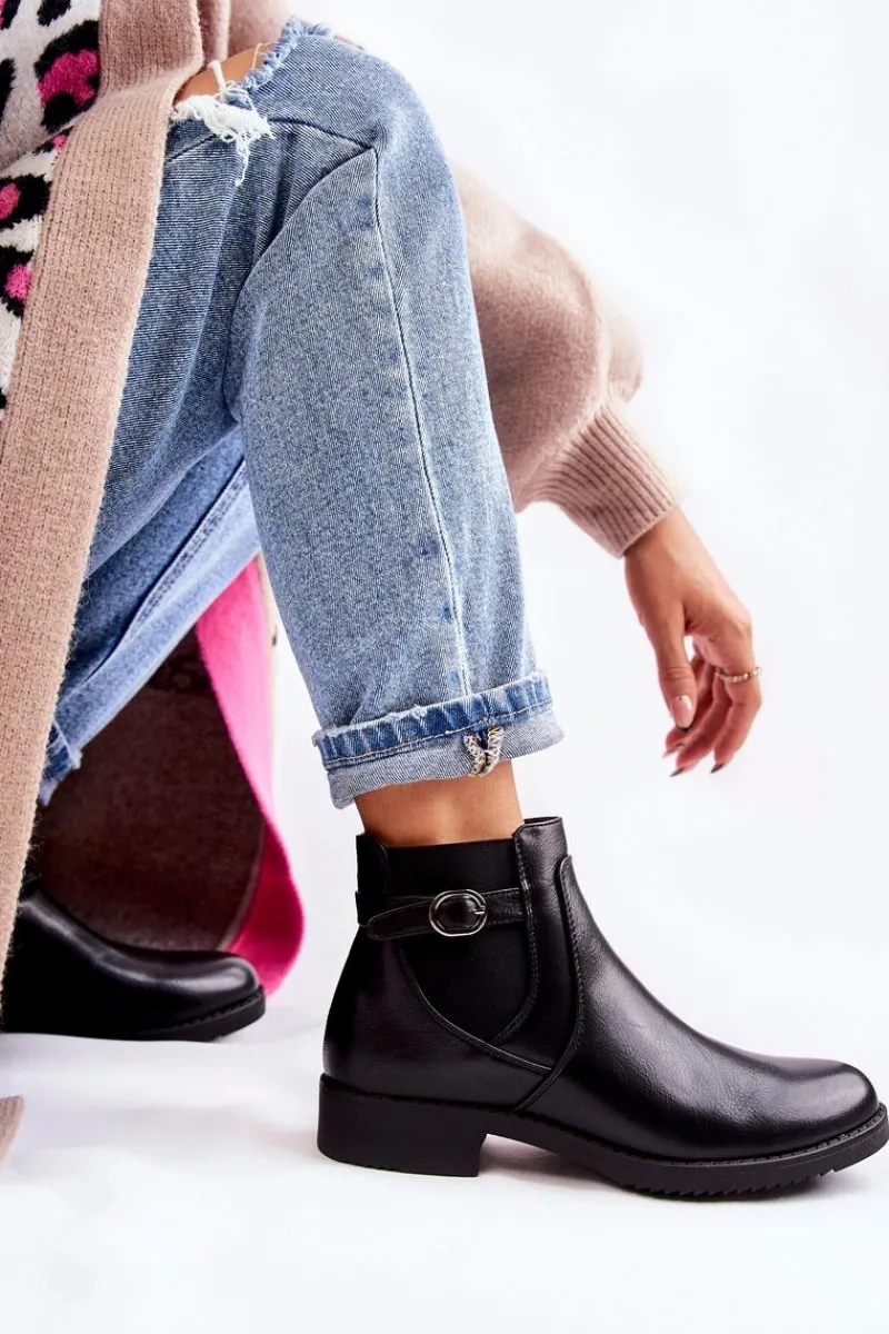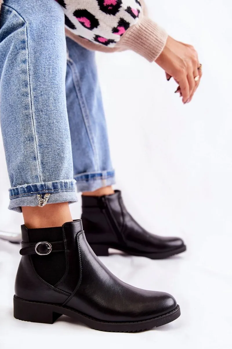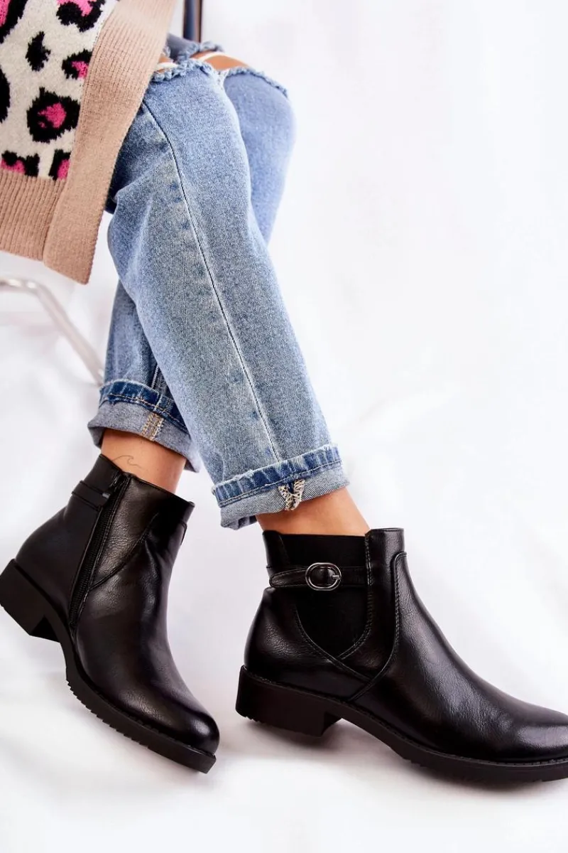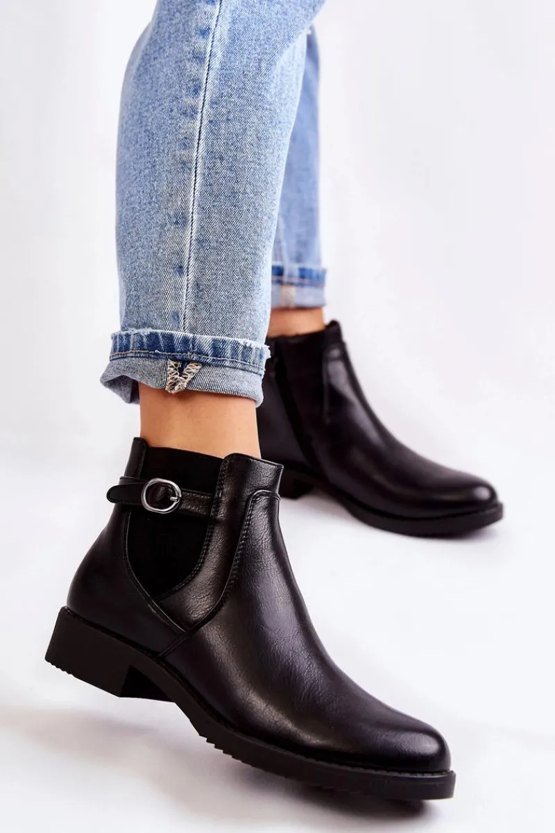 Damskie botki zostały wykonane z eko skóry. Posiadają ozdobną klamrę na cholewce oraz suwak ułatwiający zakładanie obuwia. Dodatkowo zapiętek w tych butach jest usztywniany. Osadzone na płaskim obcasie, co sprawia, że są niezwykle stabilne podczas użytkowania. Wnętrze botków zostało ocieplone miłym w dotyku kocem obuwniczym. Świetny model do wielu stylizacji! Przy wyborze rozmiaru prosimy sugerować się tabelą rozmiarów.