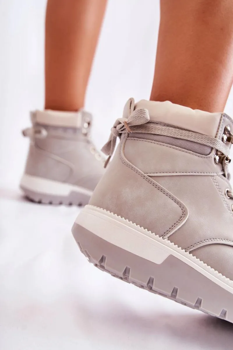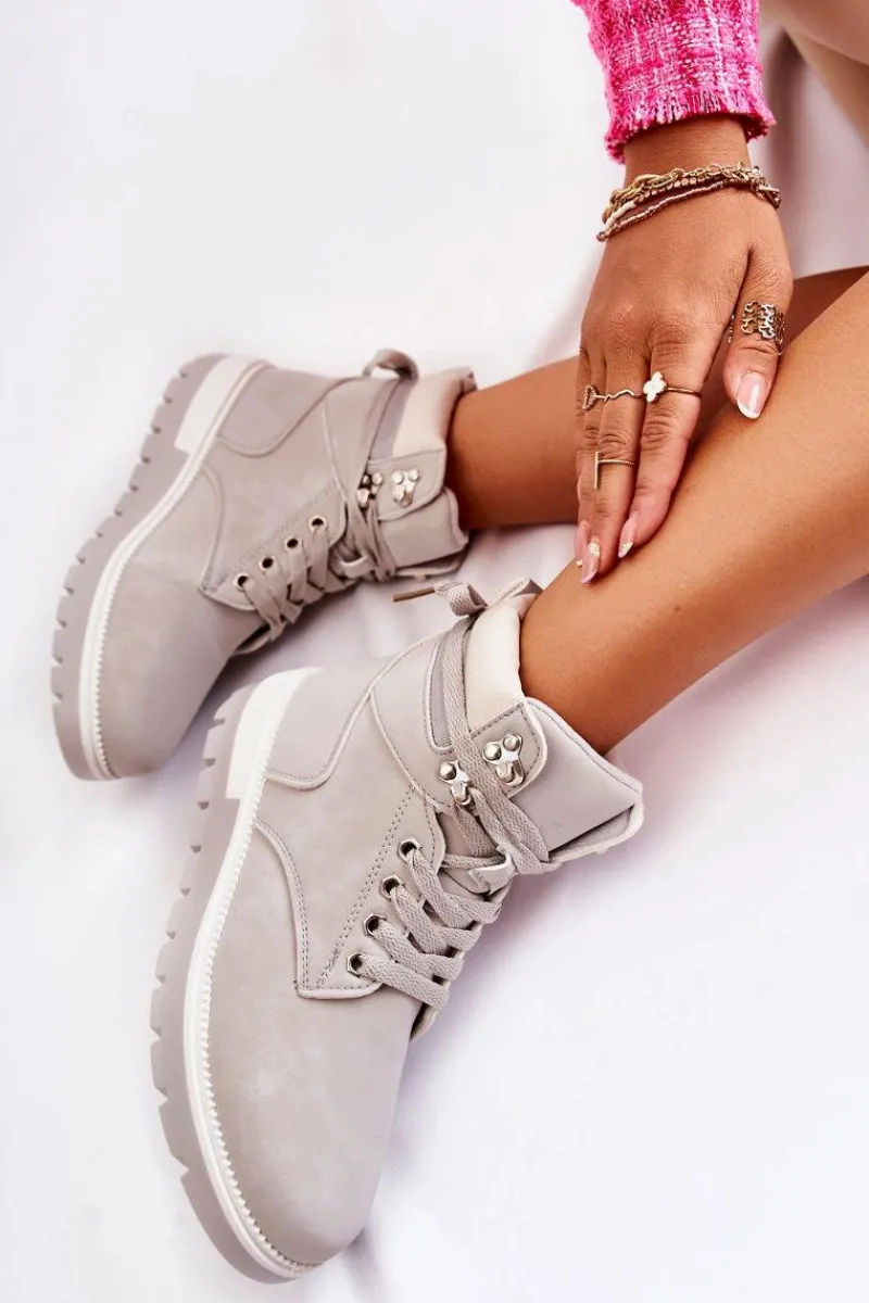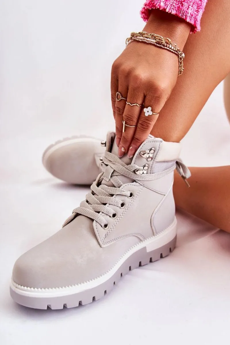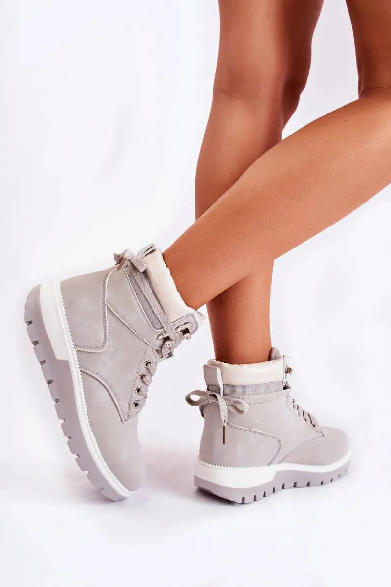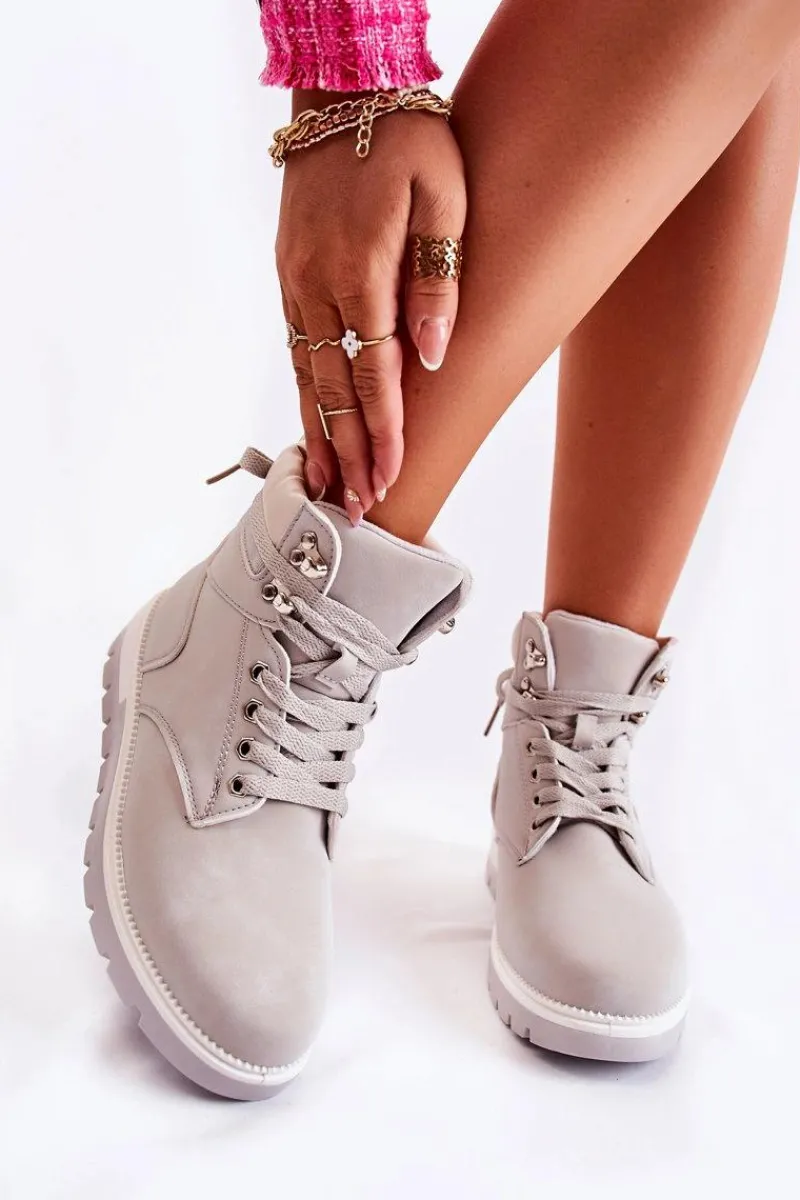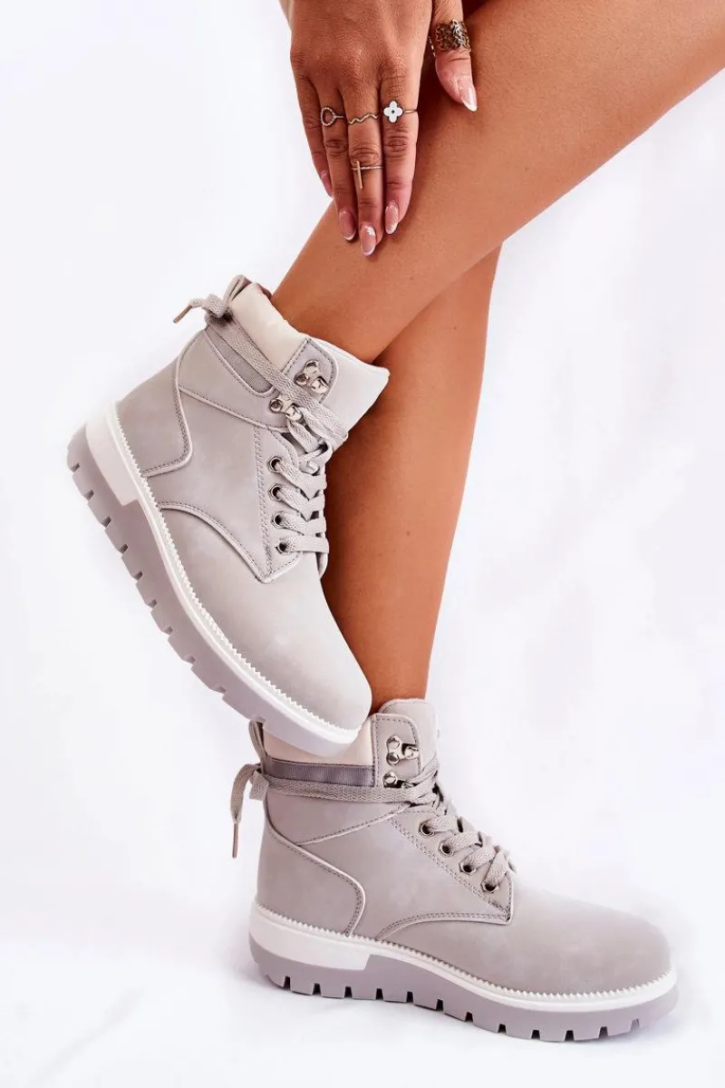 Botki damskie zostały wykonane z eko skóry. Model osadzony jest na platformie z charakterystycznymi żłobieniami. Posiadają zaokrąglony nosek. Cholewka zakrywająca kostkę z małą pętelką z tyłu ułatwiającą zakładanie obuwia. Wkładka oraz wyściółka ocieplone kocem obuwniczym. Klasyczne wiązanie na płaskie sznurowadła pozwoli na odpowiednie dopasowanie obuwia do tęgości nogi. Przy wyborze rozmiaru prosimy sugerować się tabelą rozmiarów.