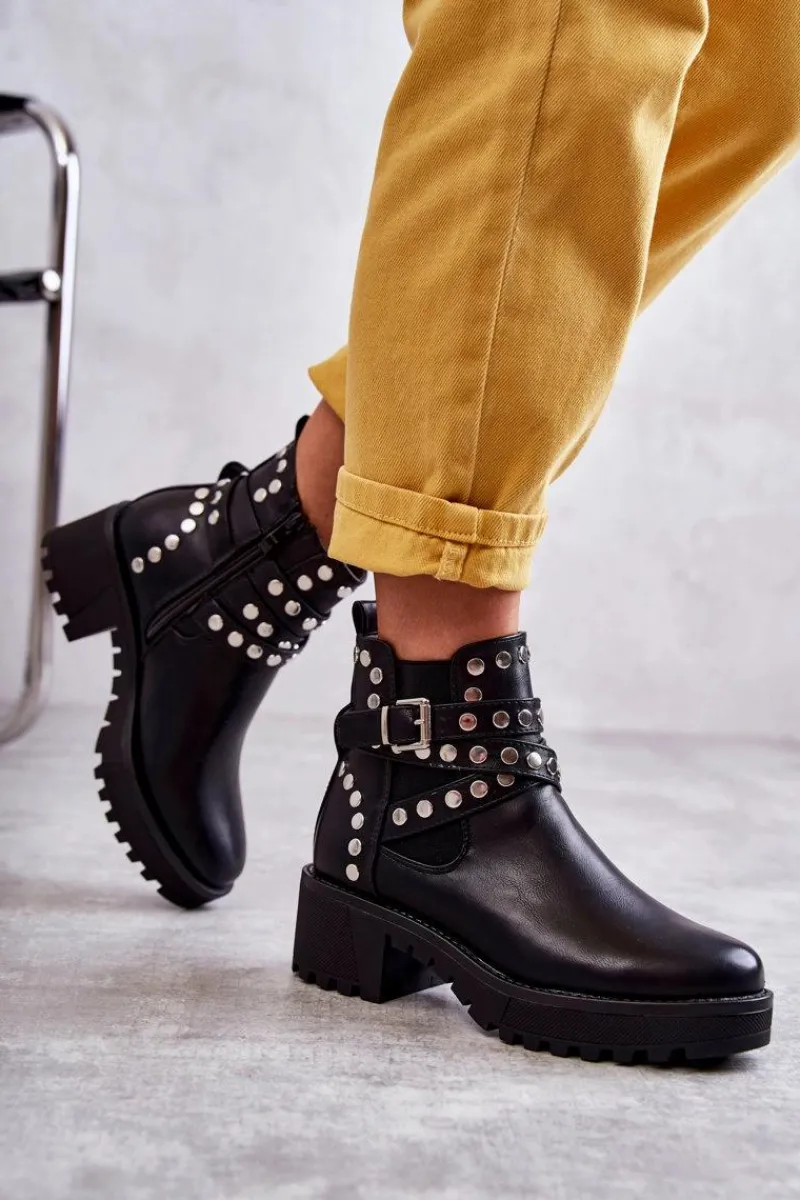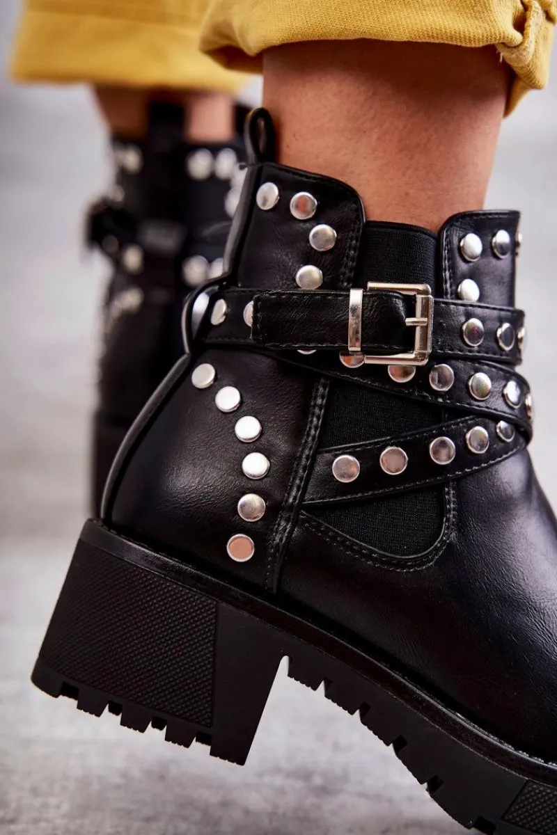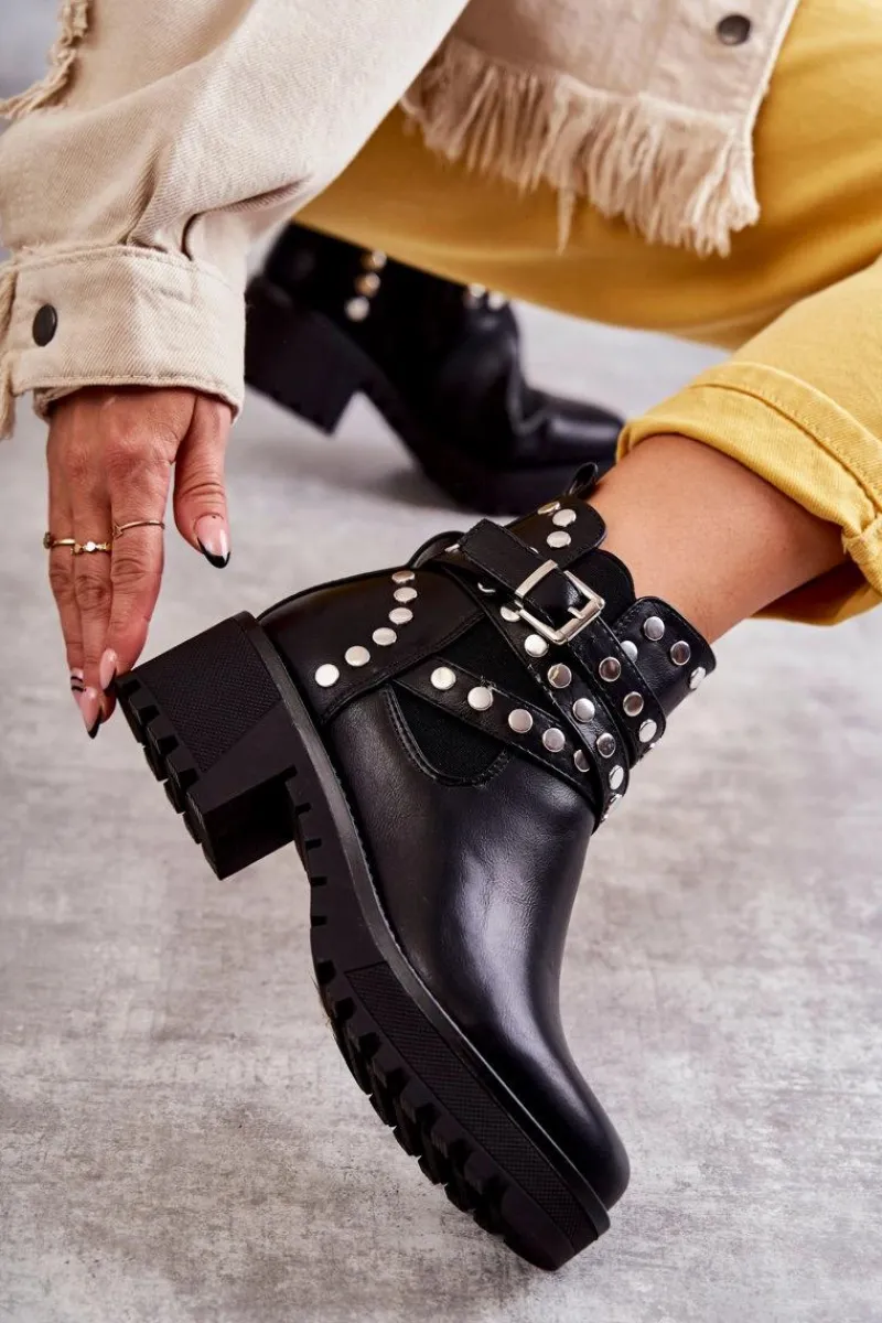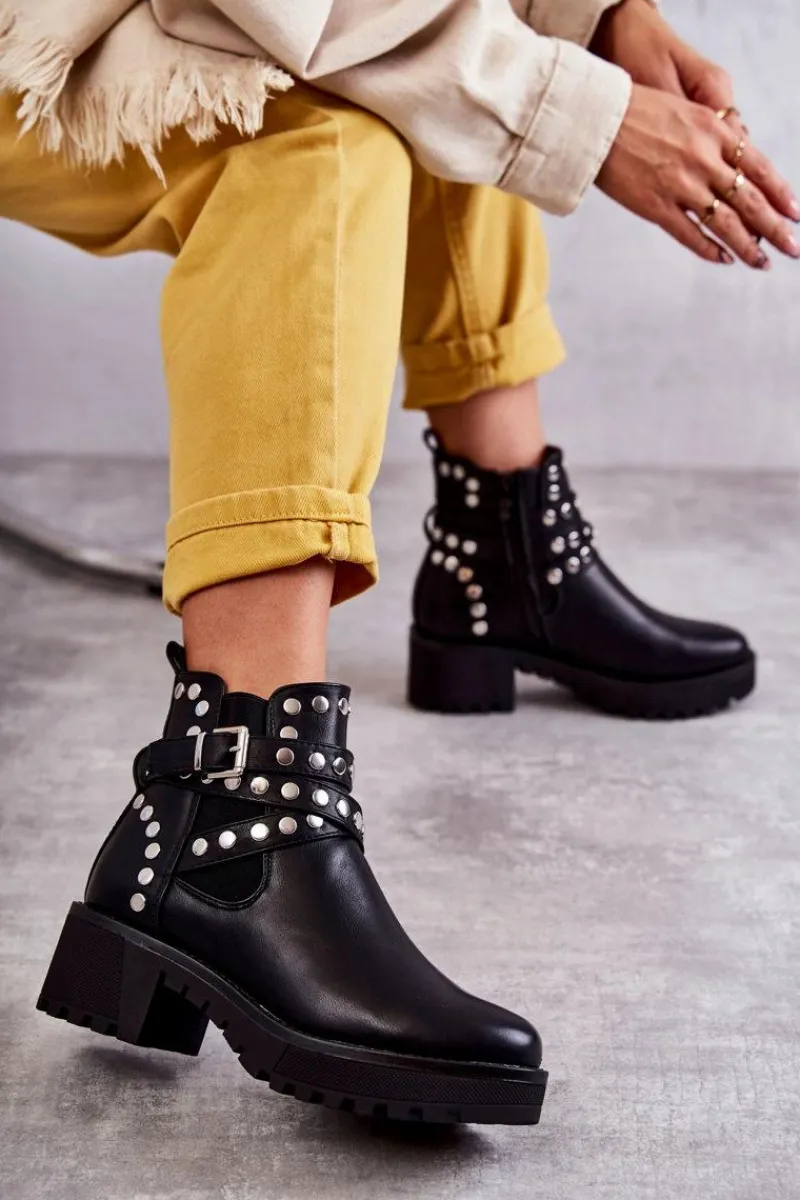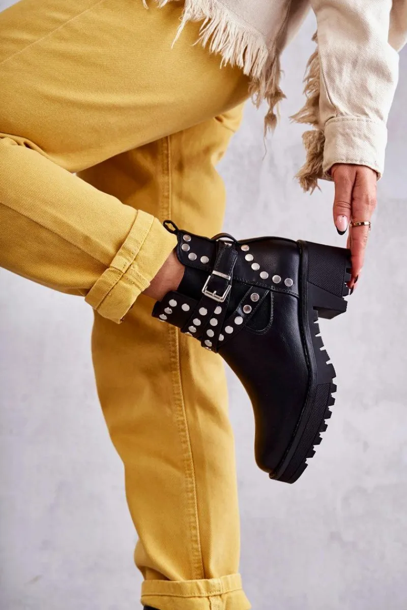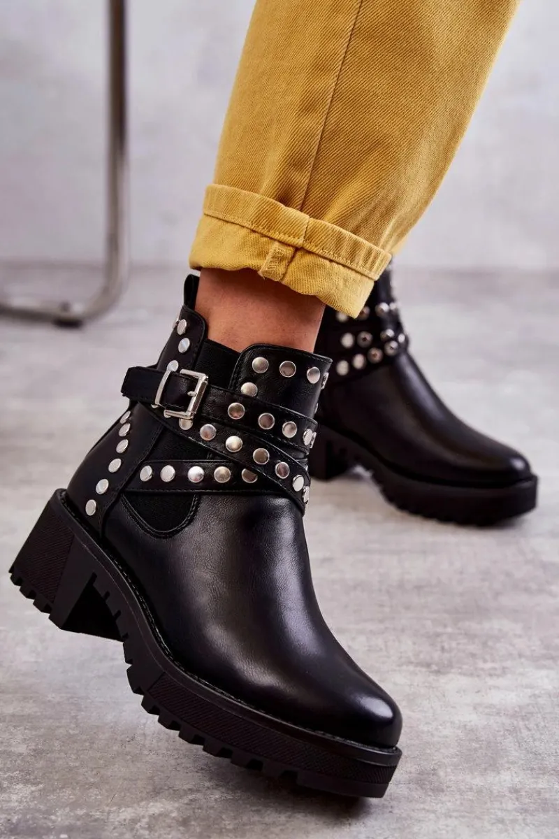 Klasyczne damskie botki to idealny wybór na chłodniejsze dni! Wykonane z eko skóry, z wszytą elastyczną gumą umożliwiającą odpowiednie dopasowanie obuwia do tęgości nogi. Dodatkowo botki zostały przyozdobione ćwiekami. Buty te posiadają pasek zapinany na sprzączkę oraz suwak. W środku znajduje się ocieplenie w postaci koca obuwniczego. Osadzone na płaskim obcasie oraz platformie. Przy wyborze rozmiaru prosimy sugerować się tabelą rozmiarów.