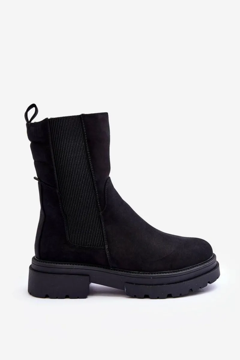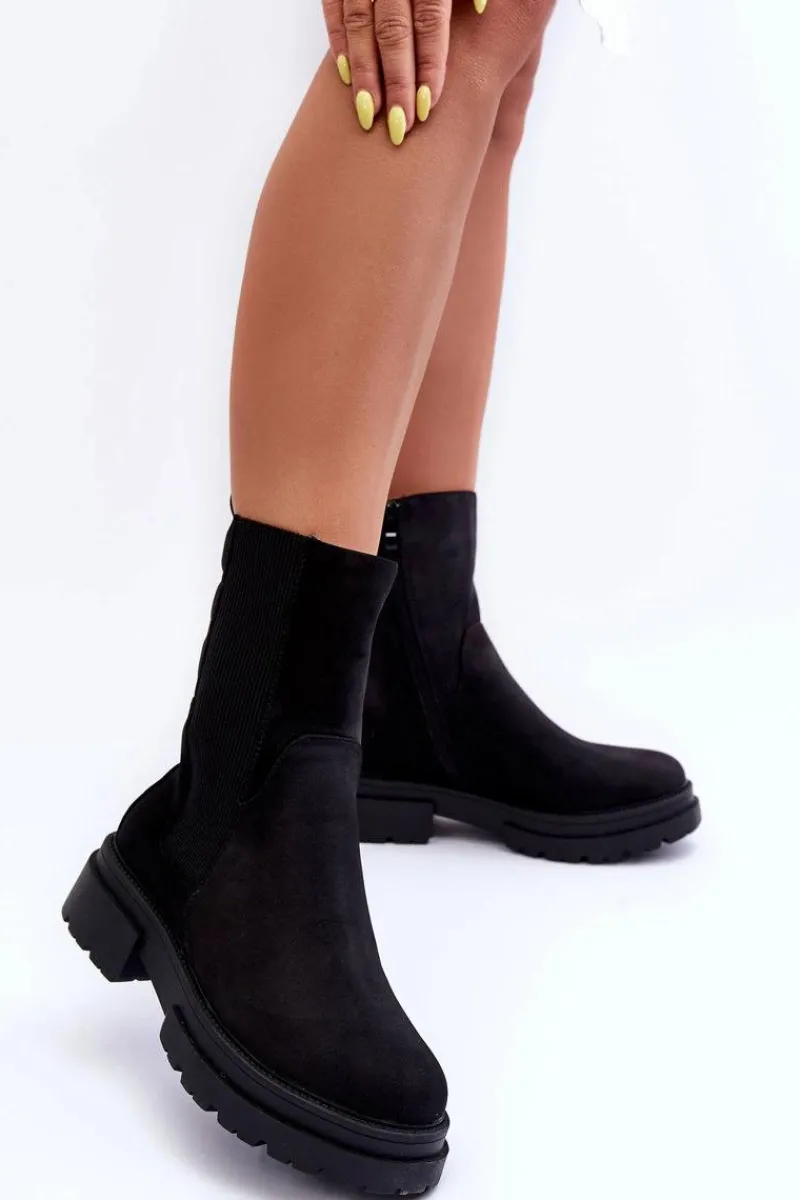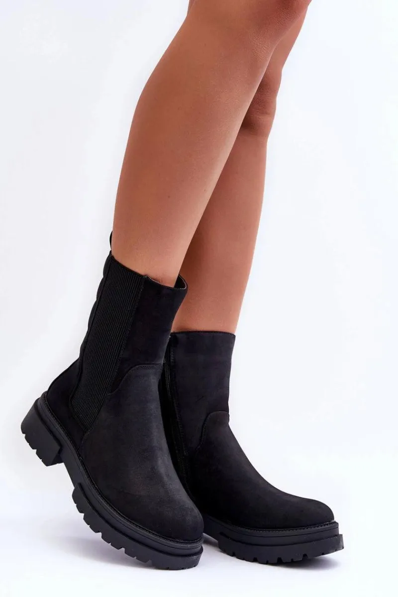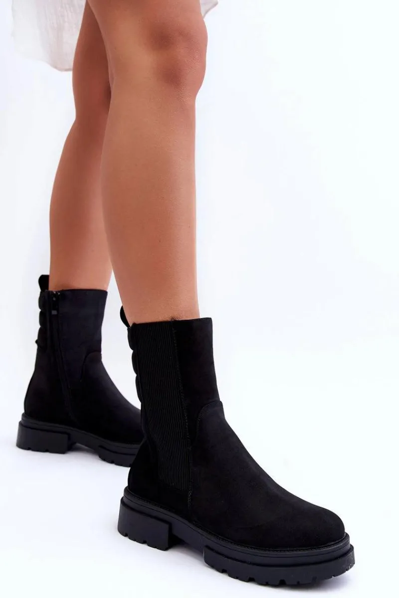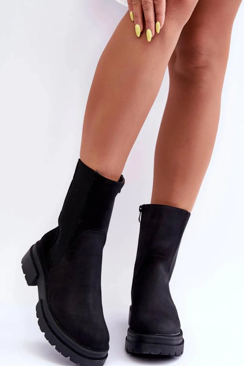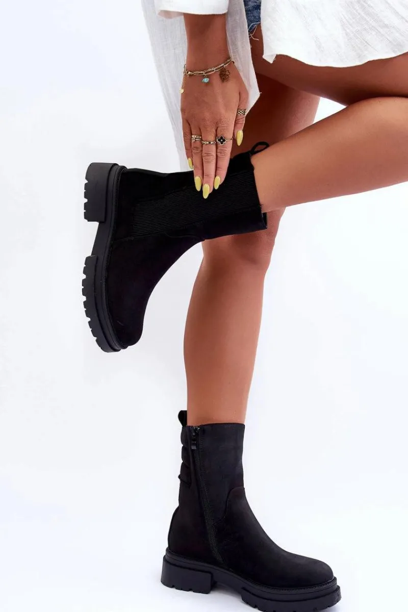 Botki zostały wykonane z nubuku. Osadzone na masywnej platformie i płaskim obcasie. Nosek zaokrąglony. Elastyczna, wysoka cholewka pozwoli na odpowiednie dopasowanie obuwia. Zapinane na suwak po wewnętrznej stronie buta. Model ten posiada dodatkowo usztywniany zapiętek. Ocieplone kocem obuwniczym. Przy wyborze rozmiaru prosimy sugerować się tabelą rozmiarów.
