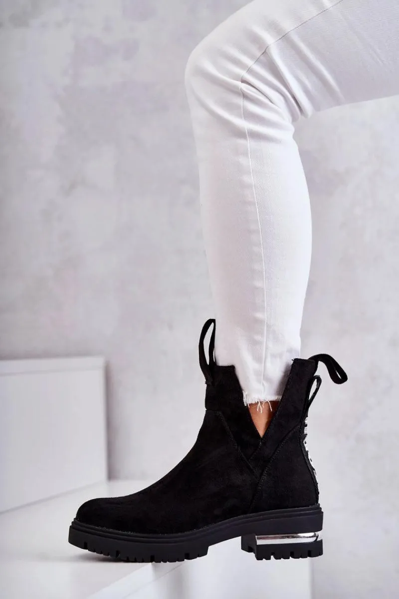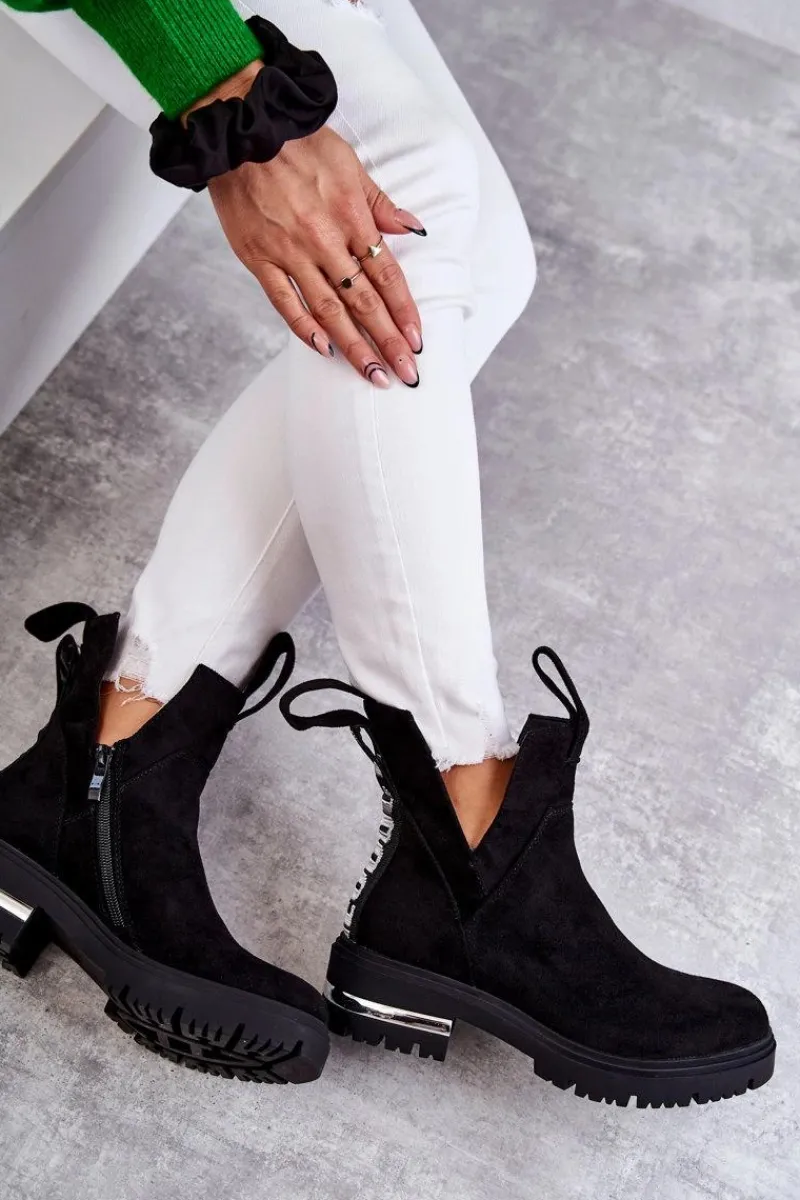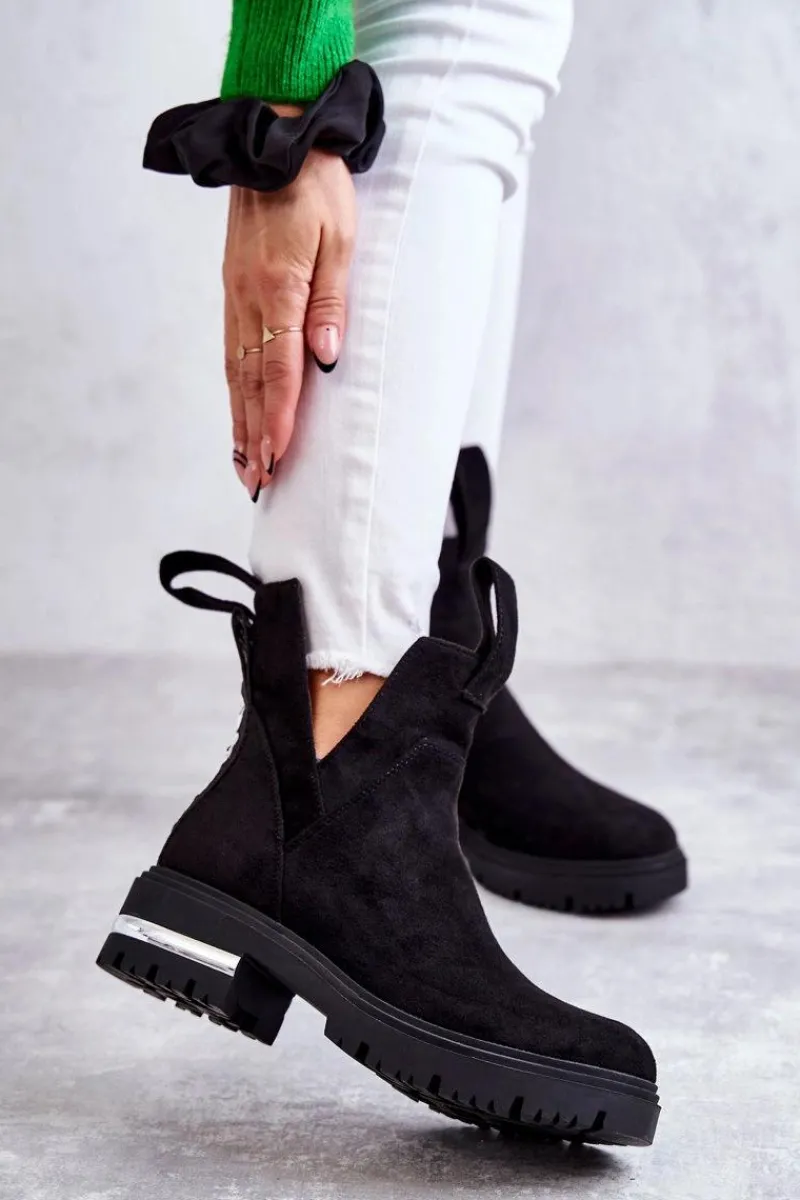 Damskie botki posiadają efektowne wycięcia po bokach cholewki. Z przodu oraz z tyłu posiadają pętelki ułatwiające zakładanie obuwia. Dodatkowo z boku cholewki znajduje się suwak. Botki zostały wykonane z miłego w dotyku eko zamszu. Posiadają usztywniany zapiętek. W środku ocieplone kocem obuwniczym. Osadzone na płaskim obcasie i niewysokiej platformie.Przy wyborze rozmiaru prosimy sugerować się tabelą rozmiarów.