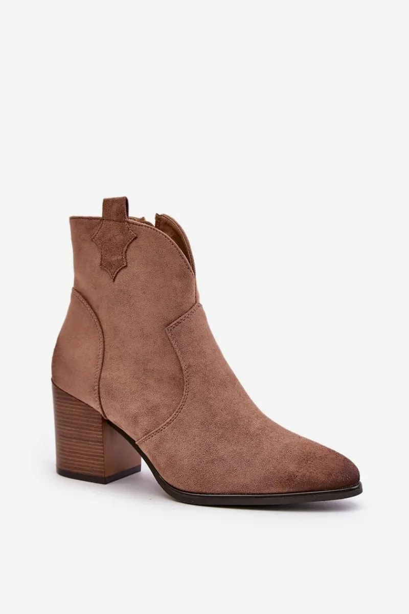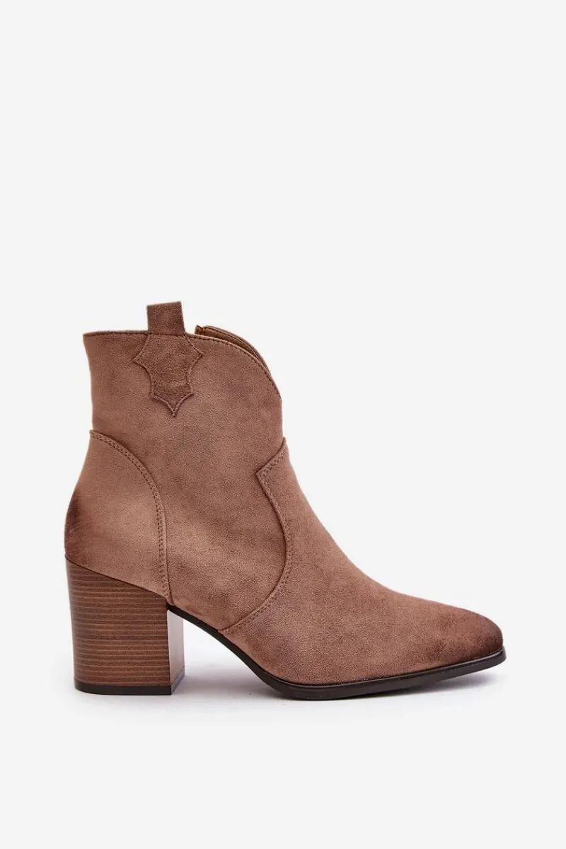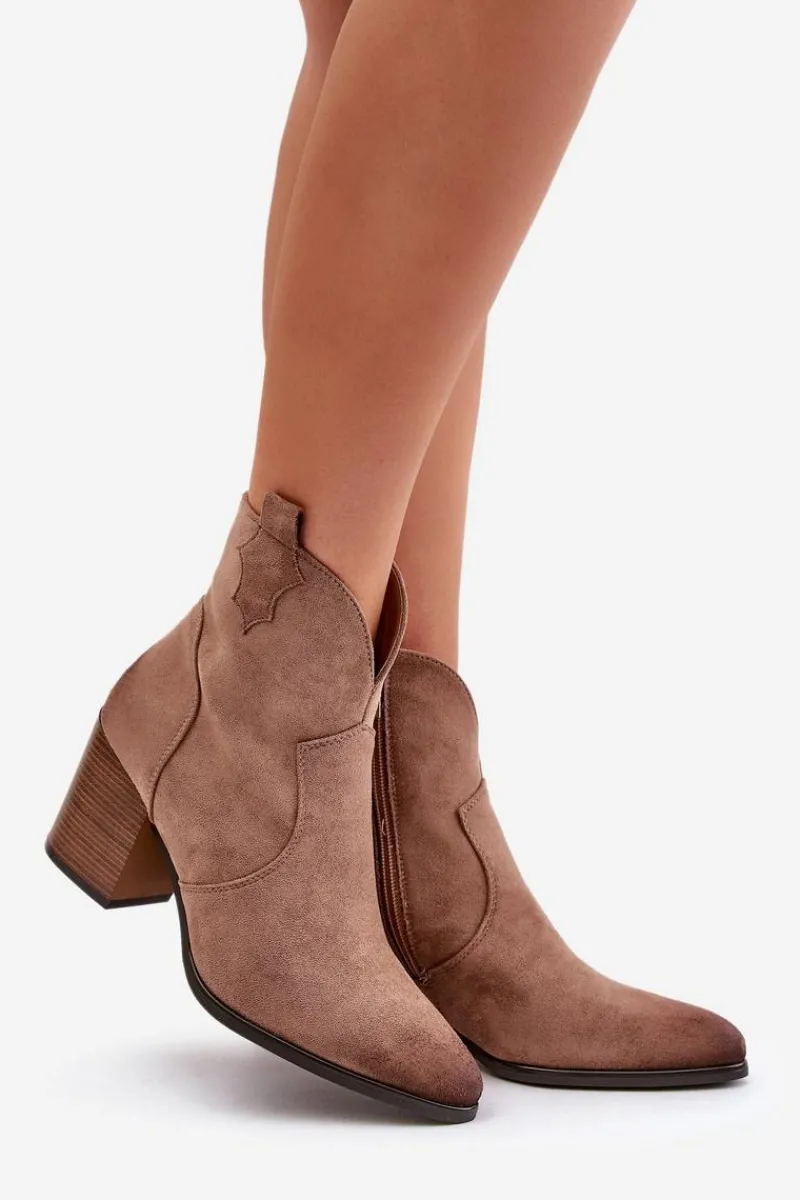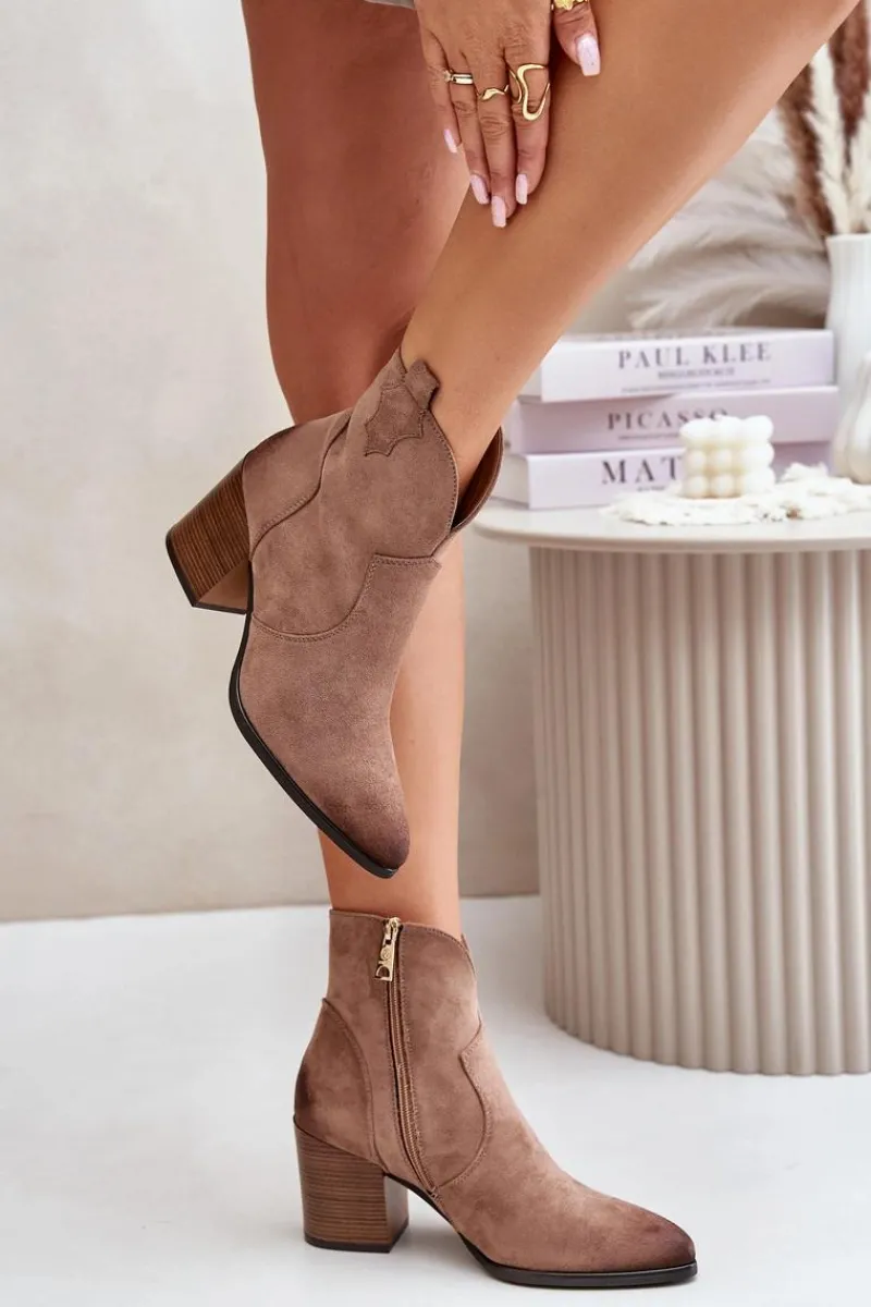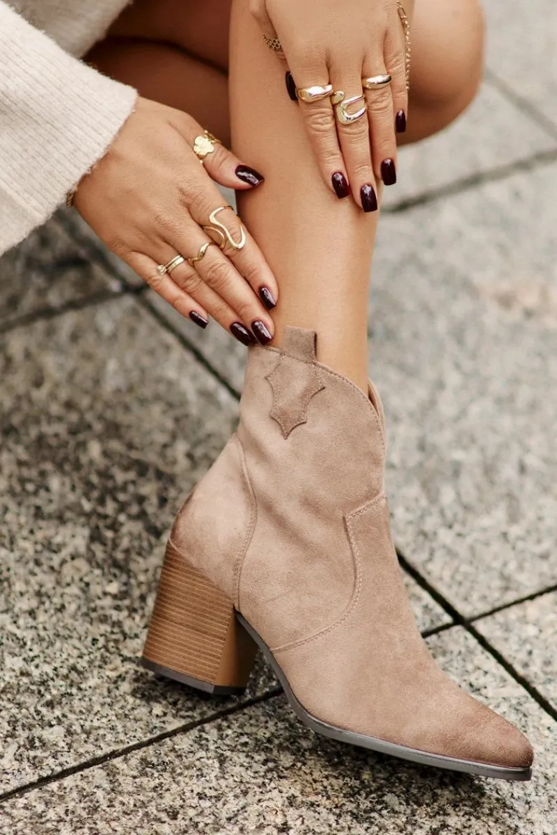 Czarne Botki|Botki Zimowe Damskie>Buty damskie Vinceza Botki Kowbojki Na Słupku Ocieplane Z Eko Zamszu Vinceza 58345 Ciemnobeżowe