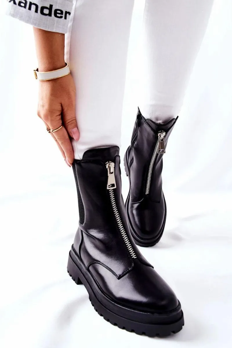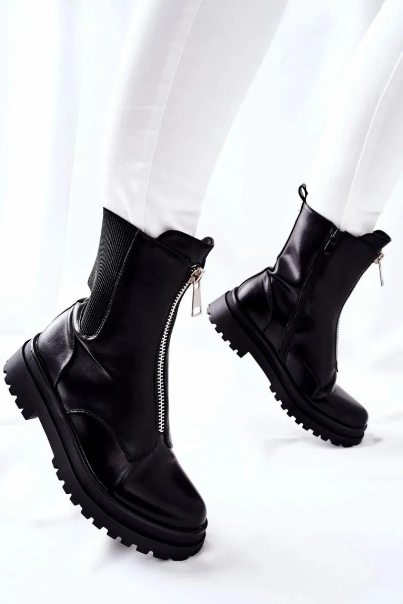 Botki damskie wykonane ze skóry ekologicznej. Wnętrze ocieplone jest miłym w dotyku kocem obuwniczym. Zakładanie ułatwi wszyty suwak, a idealne dopasowanie zapewni wszyta gumka na boku. Przy wyborze rozmiaru prosimy sugerować się tabelą rozmiarów.