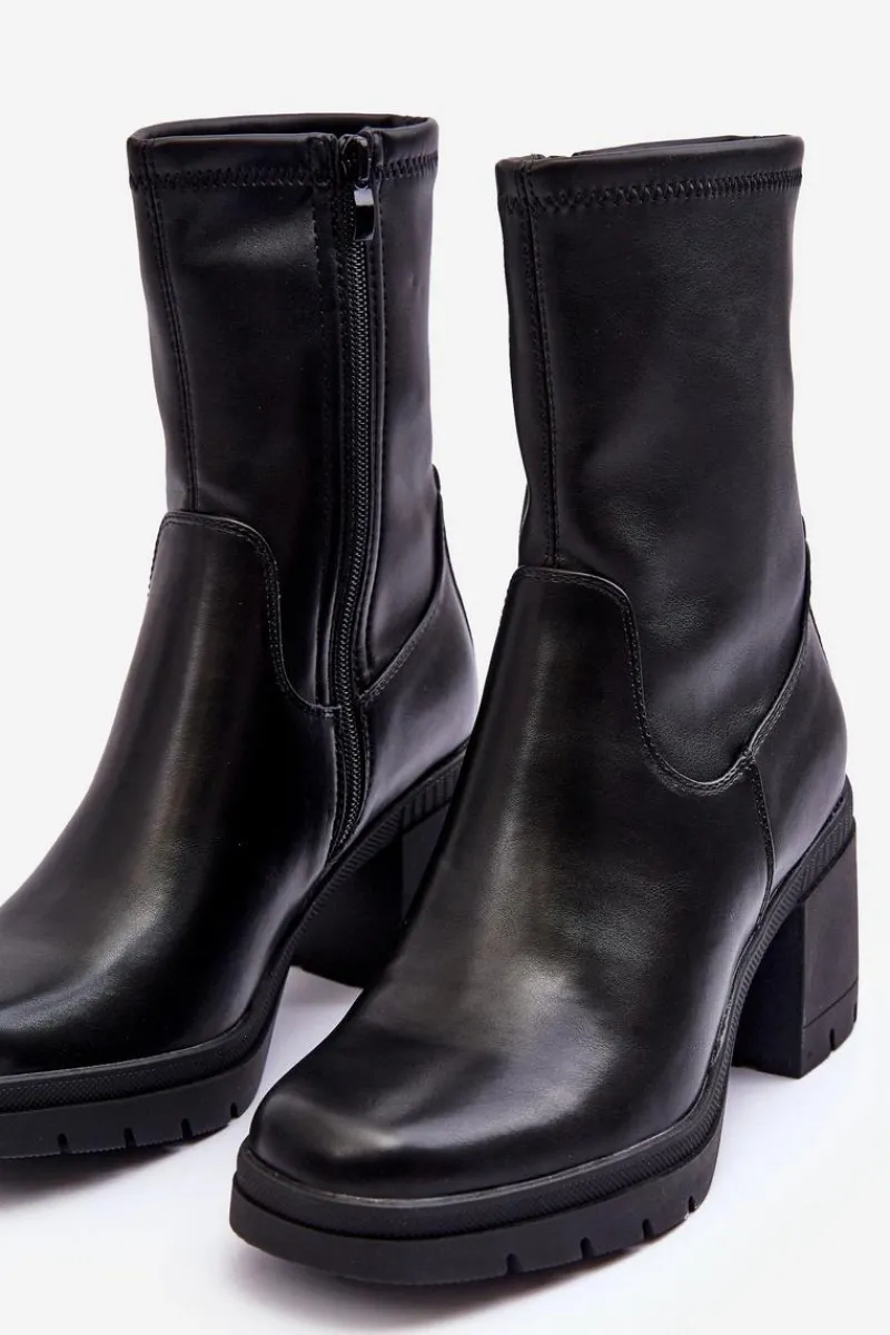 Botki damskie wykonane z eko skóry. Osadzone na masywnym obcasie i platformie. Usztywniony zapiętek. Noski zaokrąglone. Model ten zapinany jest na suwak z boku. Środek ocieplony na wysokości stopy kocem obuwniczym. Botki doskonale sprawdzą się w jesiennych stylizacjach. Przy wyborze rozmiaru prosimy kierować się tabelą rozmiarów