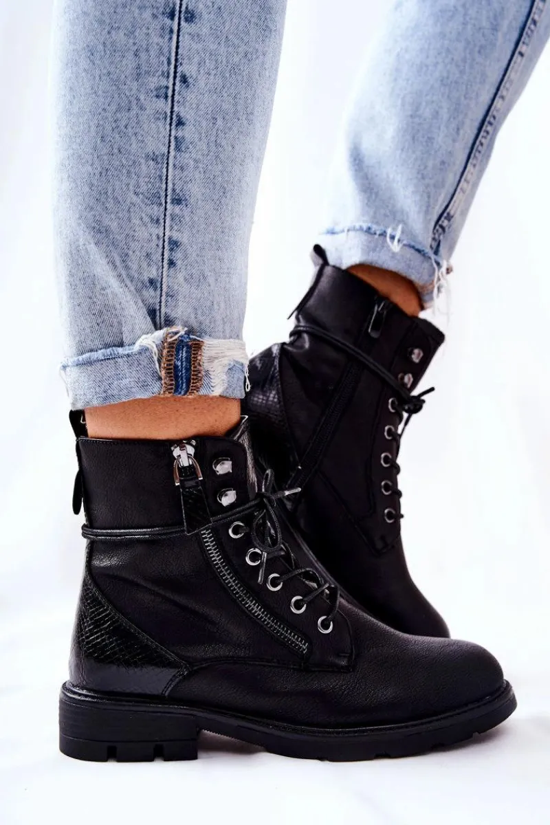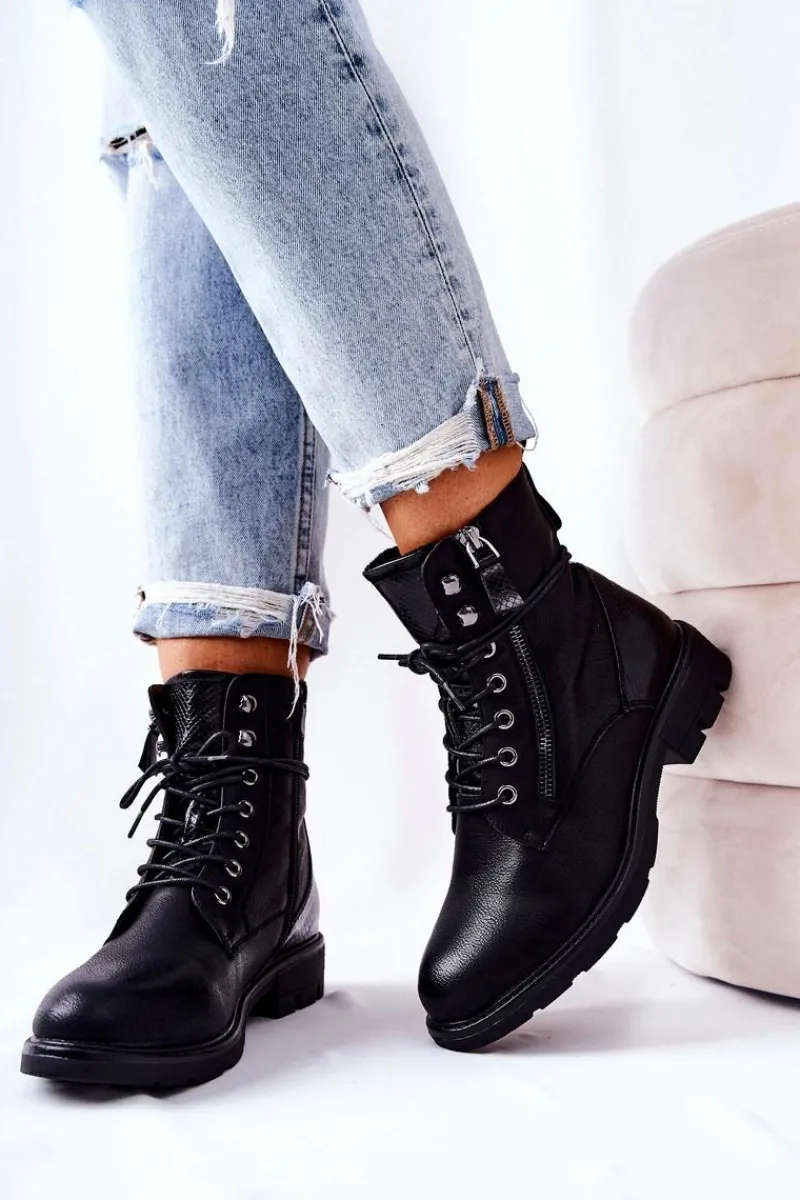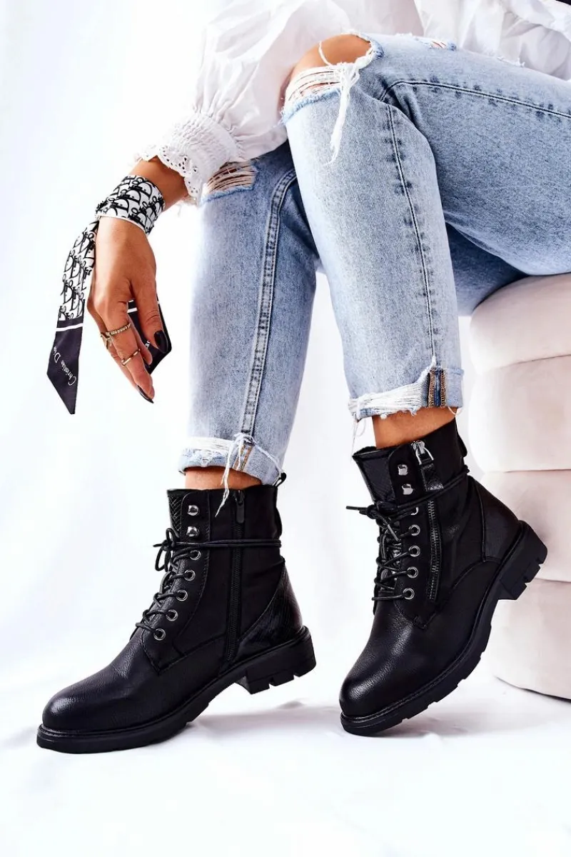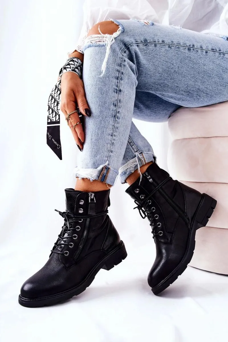 Botki wykonane zostały z eko skóry. Posiadają wiązanie oraz dwa zamki błyskawiczne – jeden ozdobny, drugi ułatwiający zakładanie obuwia. W środku posiadają ocieplenie w postaci miłego w dotyku koca obuwniczego. Świetnie sprawdzą się podczas jesiennych stylizacji z woskowanymi spodniami bądź spódniczkami. Koniecznie musisz je mieć! Przy wyborze rozmiaru prosimy sugerować się tabelą rozmiarów.