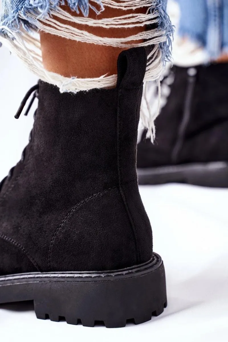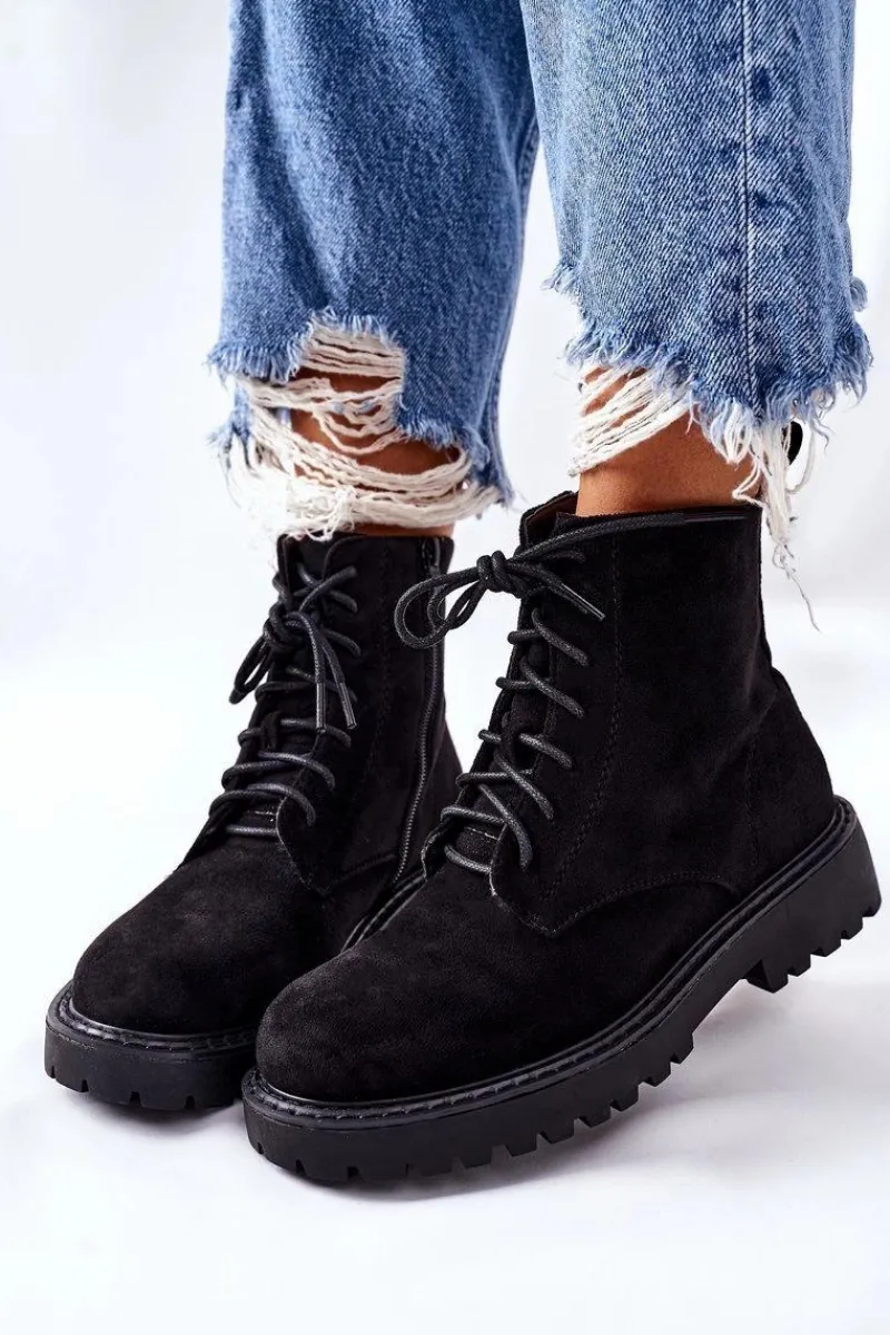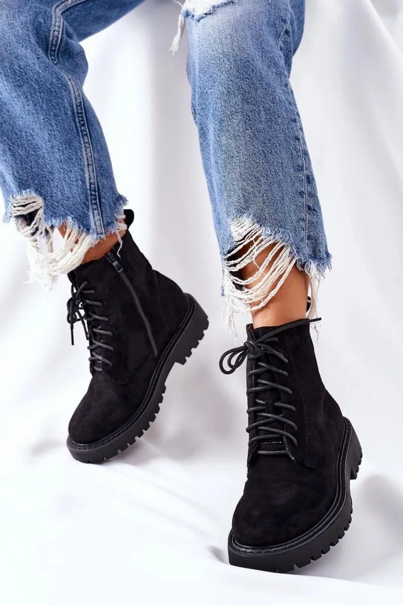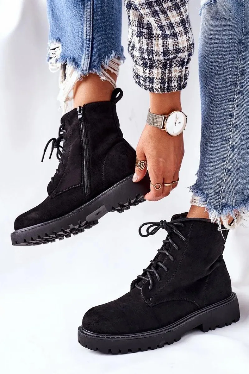 Botki damskie wykonane z zamszowej skóry ekologicznej. Posiadają zapinanie na zamek z boku. Przy wyborze rozmiaru prosimy sugerować się tabelą rozmiarów.