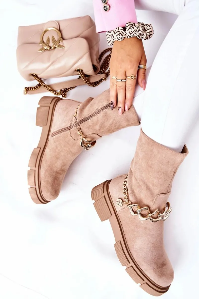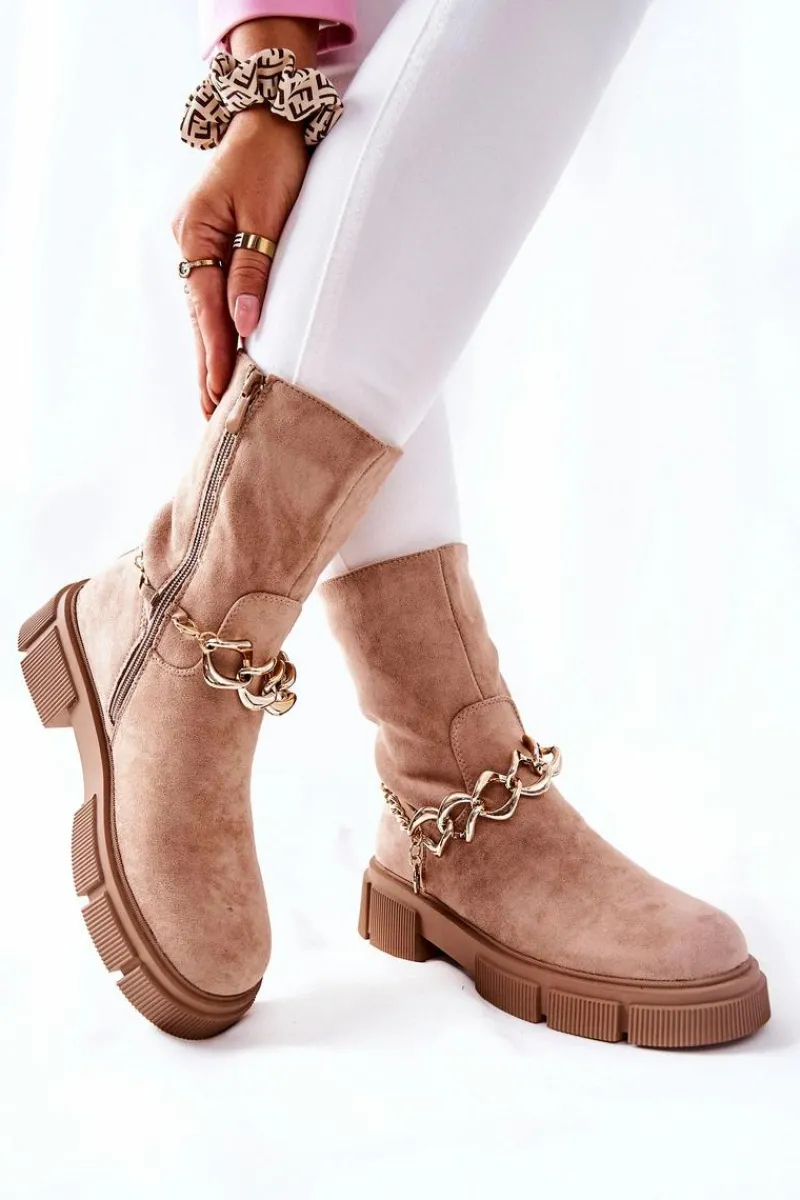 Piękne botki wykonane z eko zamszu będą idealne do wielu stylizacji. Gruba podeszwa sprawia, że botki są stabilne. Ozdobny łańcuch sprawia, że wyglądają bardzo stylowo. Zapinane na suwak. Środek ocieplany delikatnym futerkiem. Nie przegap okazji i kup je już dziś!Przy wyborze rozmiaru prosimy sugerować się tabelą rozmiarów.