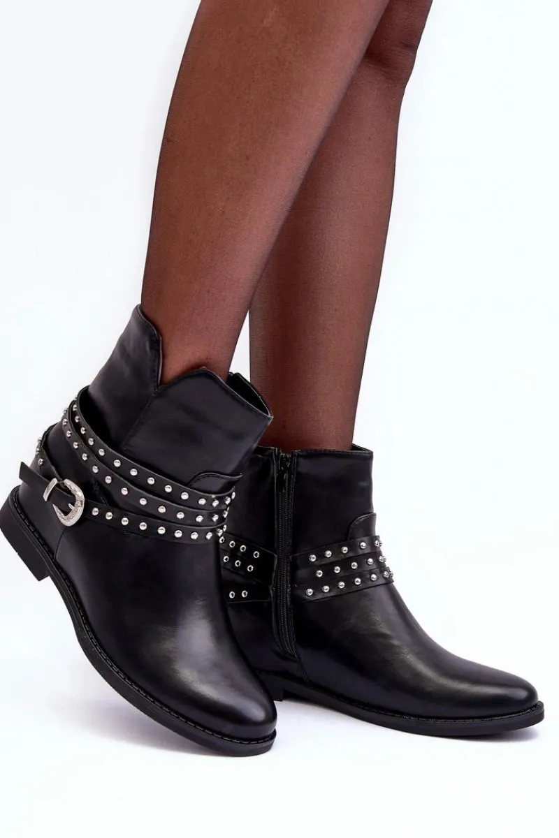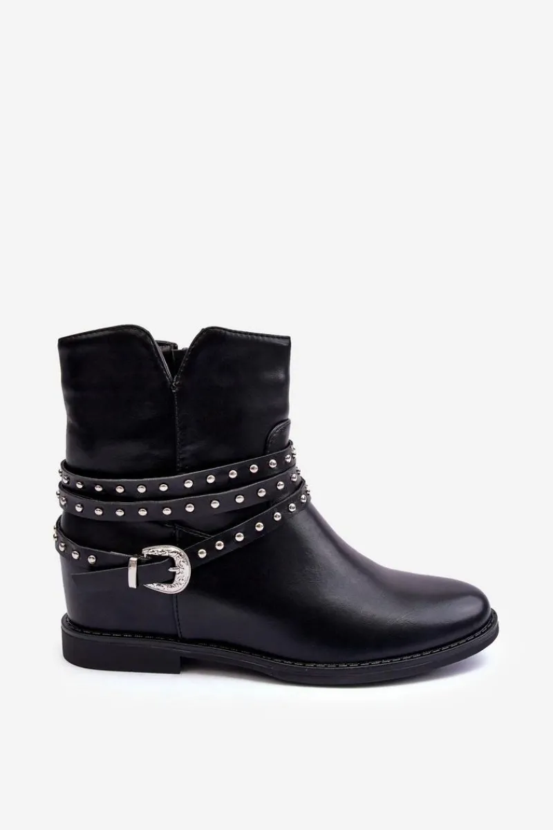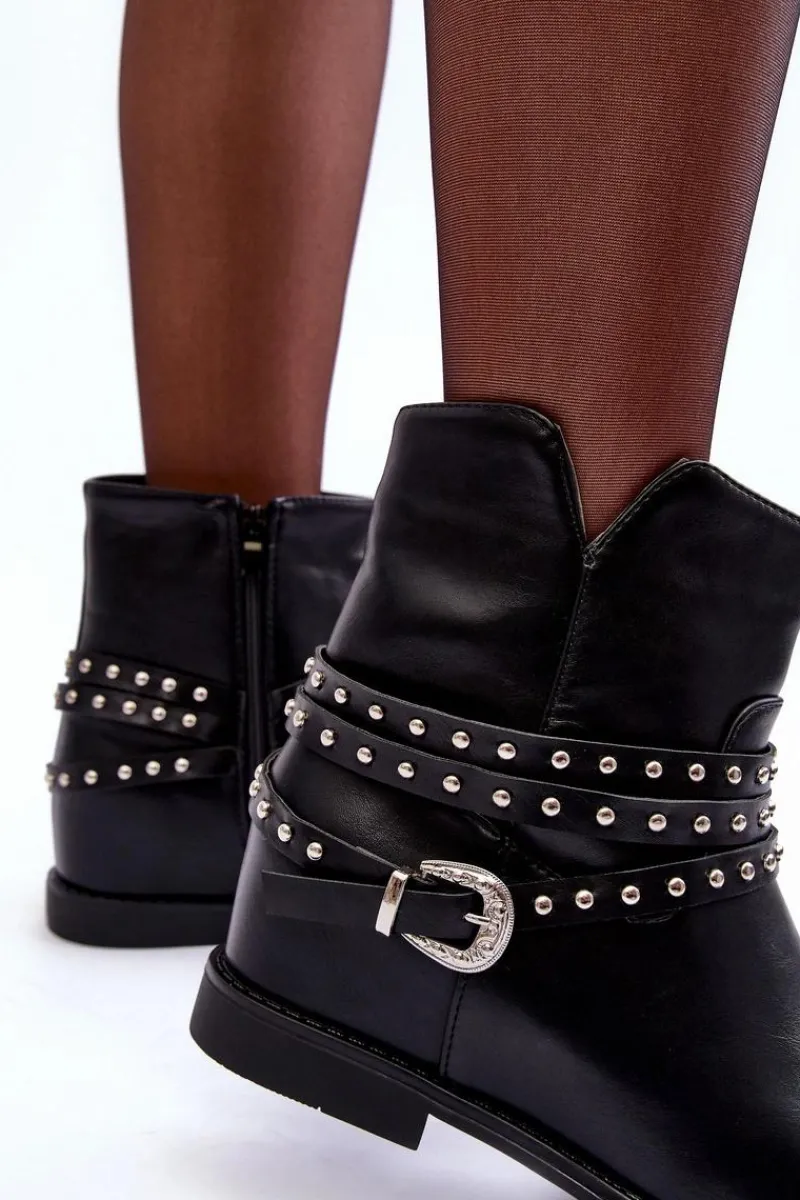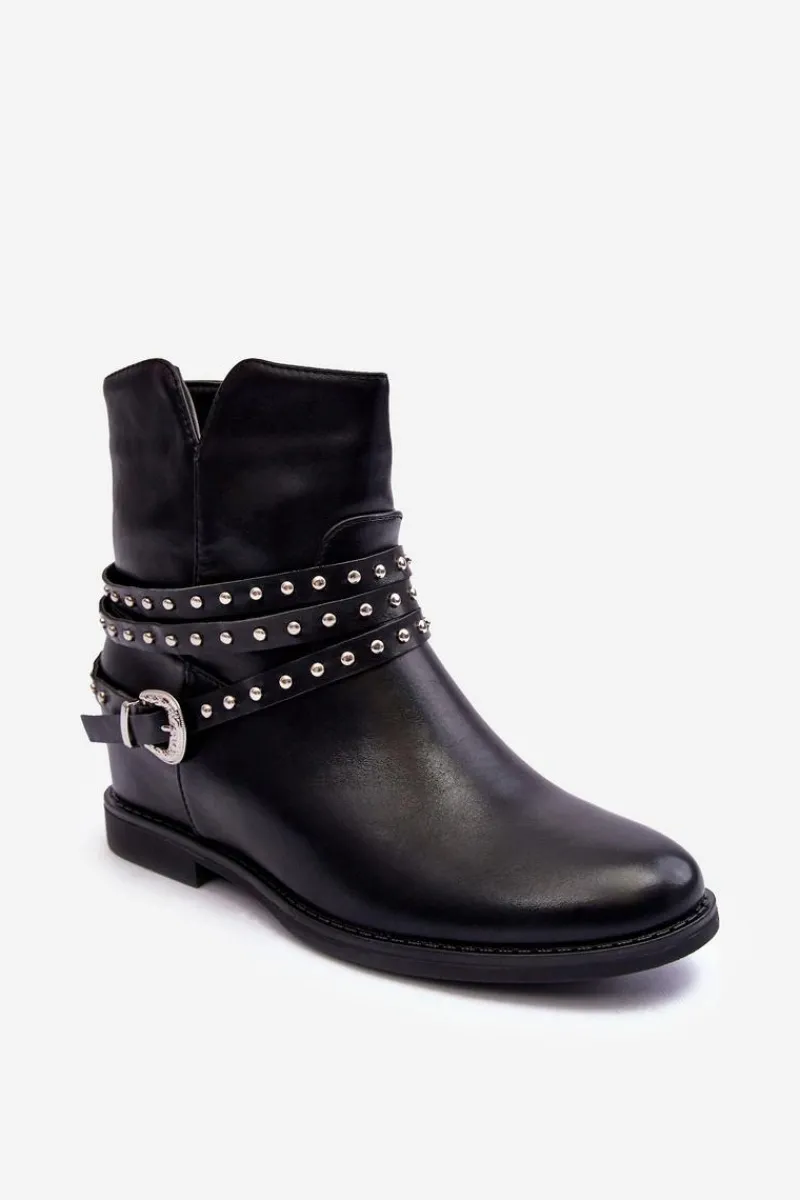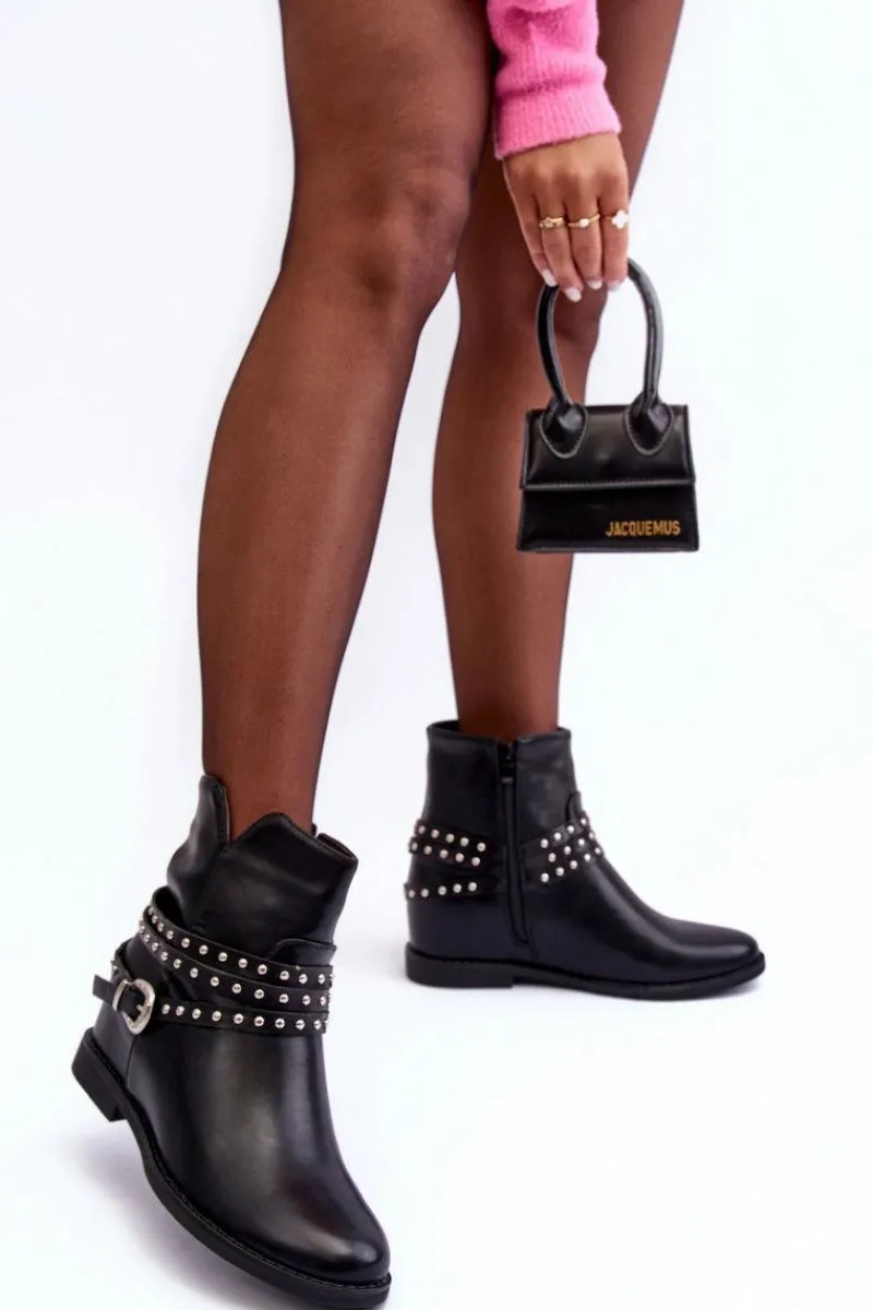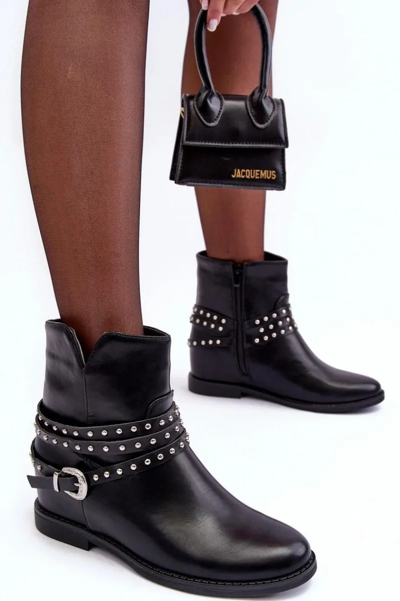 Modne damskie botki wykonane z eko skóry. Cholewka ozdobiona paskami oraz klamrą. Model ten osadzony jest na płaskim obcasie oraz ukrytym koturnie(7cm). Zapinanie na suwak z boku. Noski zaokrąglone. Miękka wkładka zapewni komfort podczas użytkowania. Przy wyborze rozmiaru prosimy sugerować się tabelą rozmiarów.