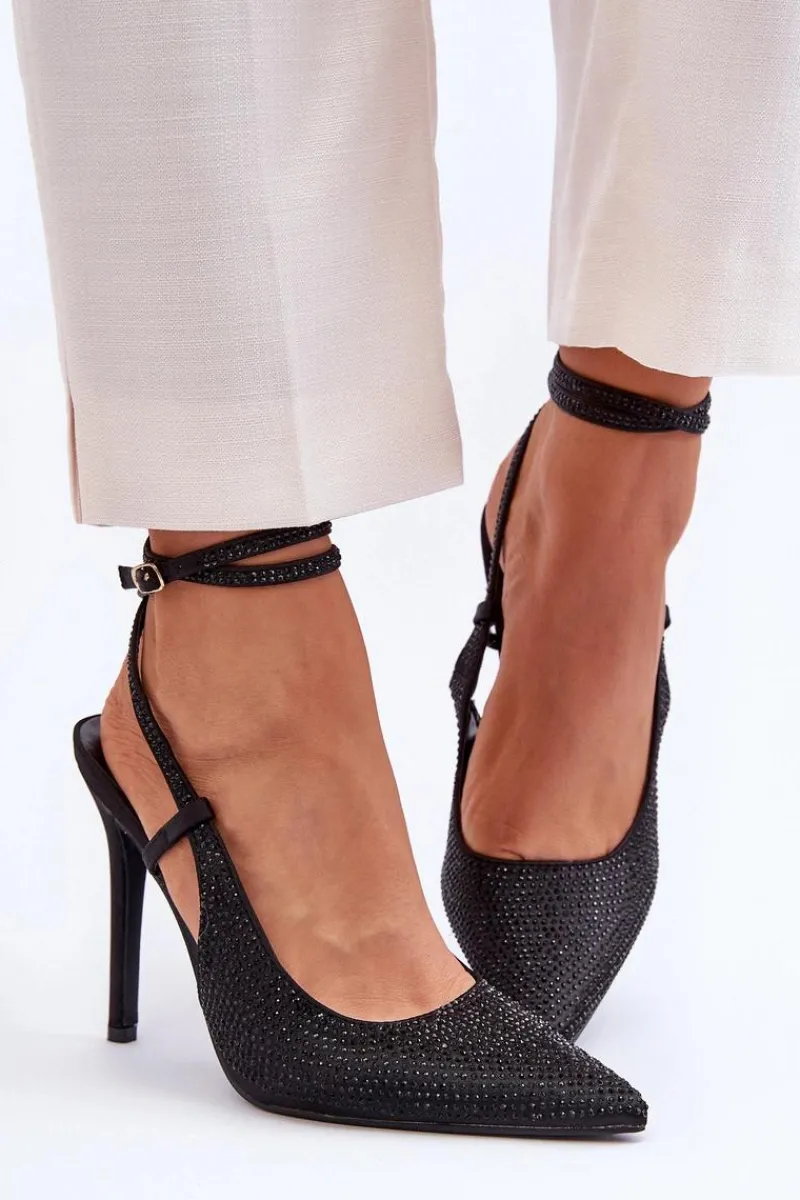 Szpilki powinny znaleźć się w szafie każdej kobiety. Model ten świetnie sprawdzi się zarówno do sukienek, jak i szerokich, eleganckich spodni. Szpilki z noskiem w szpic optycznie wysmuklą nogi. Model ten jest wsuwany i zapinany na sprzączkę osadzoną na pasku wokół łydki. Buty posiadają zdobienia w postaci małych cyrkonii. Przy wyborze rozmiaru prosimy sugerować się tabelą rozmiarów.