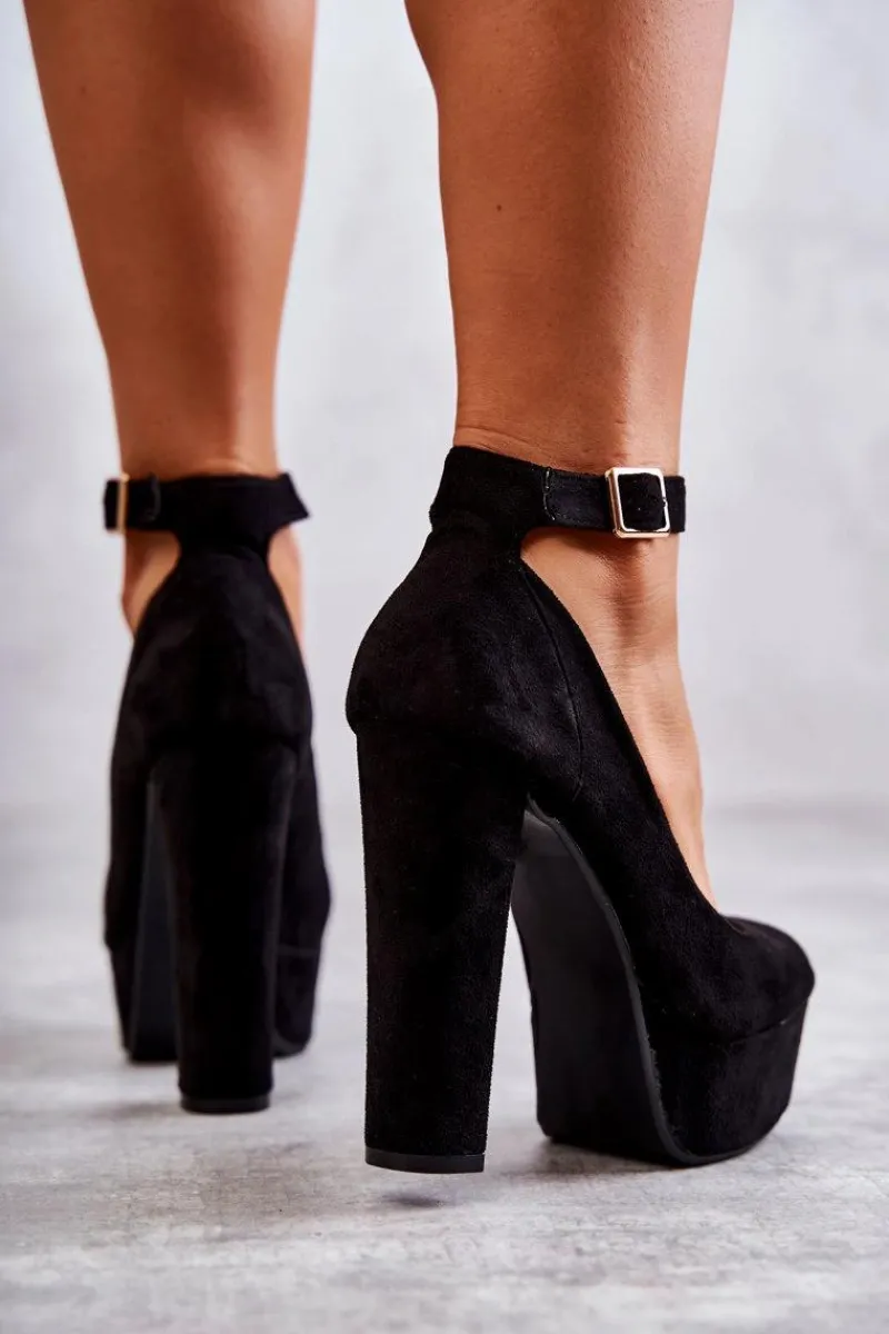 Modne czółenka zostały wykonane z eko zamszu. Model osadzony na wysokim słupku oraz masywnej platformie, który optycznie wydłuży i wysmukli nogi. Wkładka wykonana z eko skóry, która jest miękka i wygodna podczas użytkowania. Nosek delikatnie zaokrąglony. Czółenka zapinane na regulowany pasek ze sprzączką wokół kostki. Dodatkowo zapiętek jest usztywniany. Przy wyborze rozmiaru prosimy kierować się tabelą rozmiarów