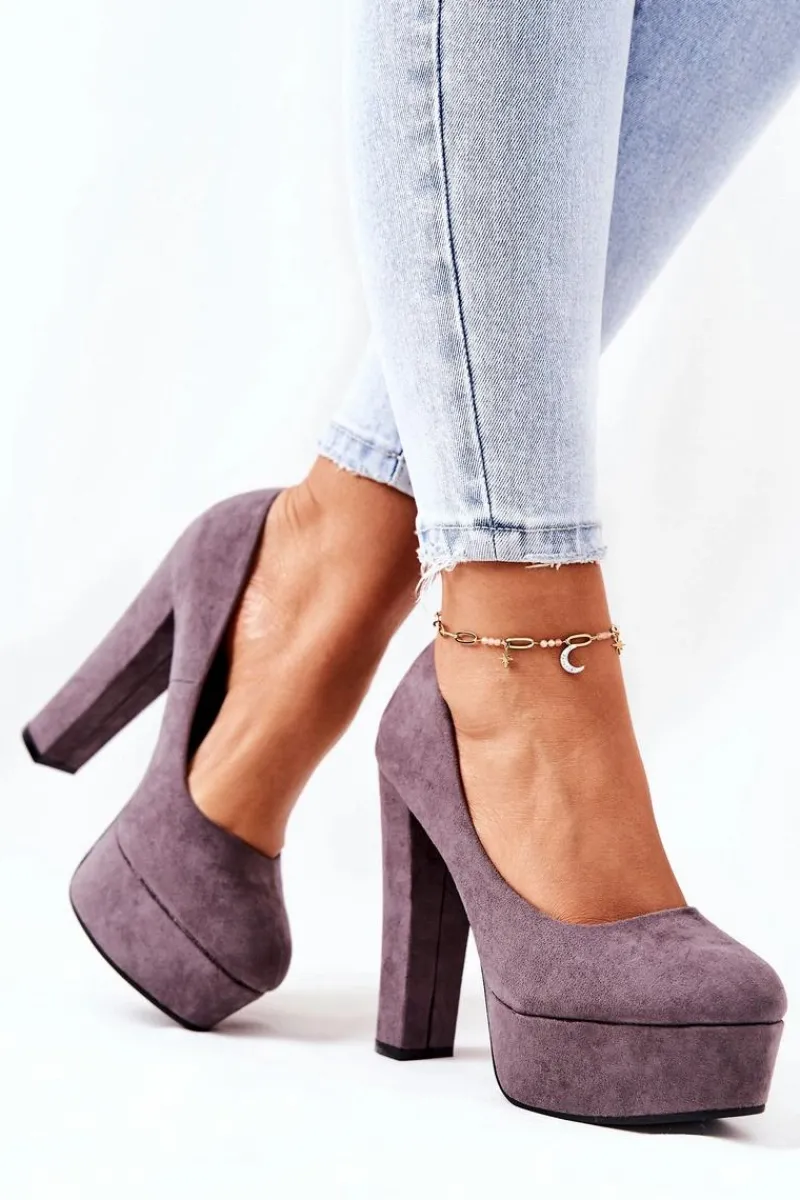 Świetne czółenka zostały wykonane z eko zamszowej skóry. Model na wysokim słupku oraz platformie, który uniesie sylwetkę i wysmukli nogi. Wkładka wykonana z eko skóry. Delikatny nosek w postaci migdała. Klasyczny wzór powinien znaleźć się w garderobie każdej kobiety! Przy wyborze rozmiaru prosimy kierować się tabelą rozmiarów