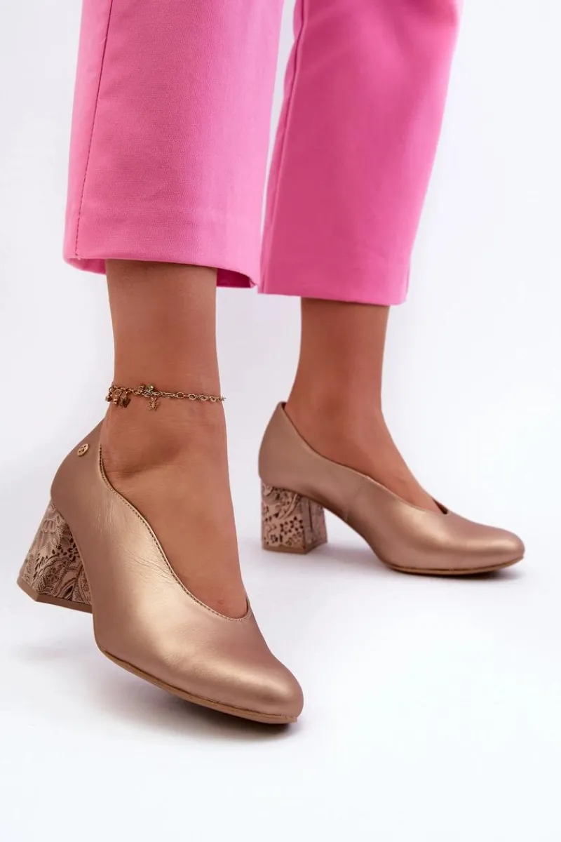 Eleganckie czółenka damskie od marki Maciejka. Wykonane ze skóry naturalnej, zapewniają trwałość i komfort noszenia. Zaokrąglone noski nadają im klasyczny wygląd, który pasuje do wielu stylizacji. Dodatkowo obcas w formie słupka z kwiatowym wzorem dodaje im subtelności i uroku. Te czółenka to idealny wybór dla kobiet ceniących sobie zarówno wygodę, jak i modny wygląd. Przy wyborze rozmiaru prosimy sugerować się tabelą rozmiarów.