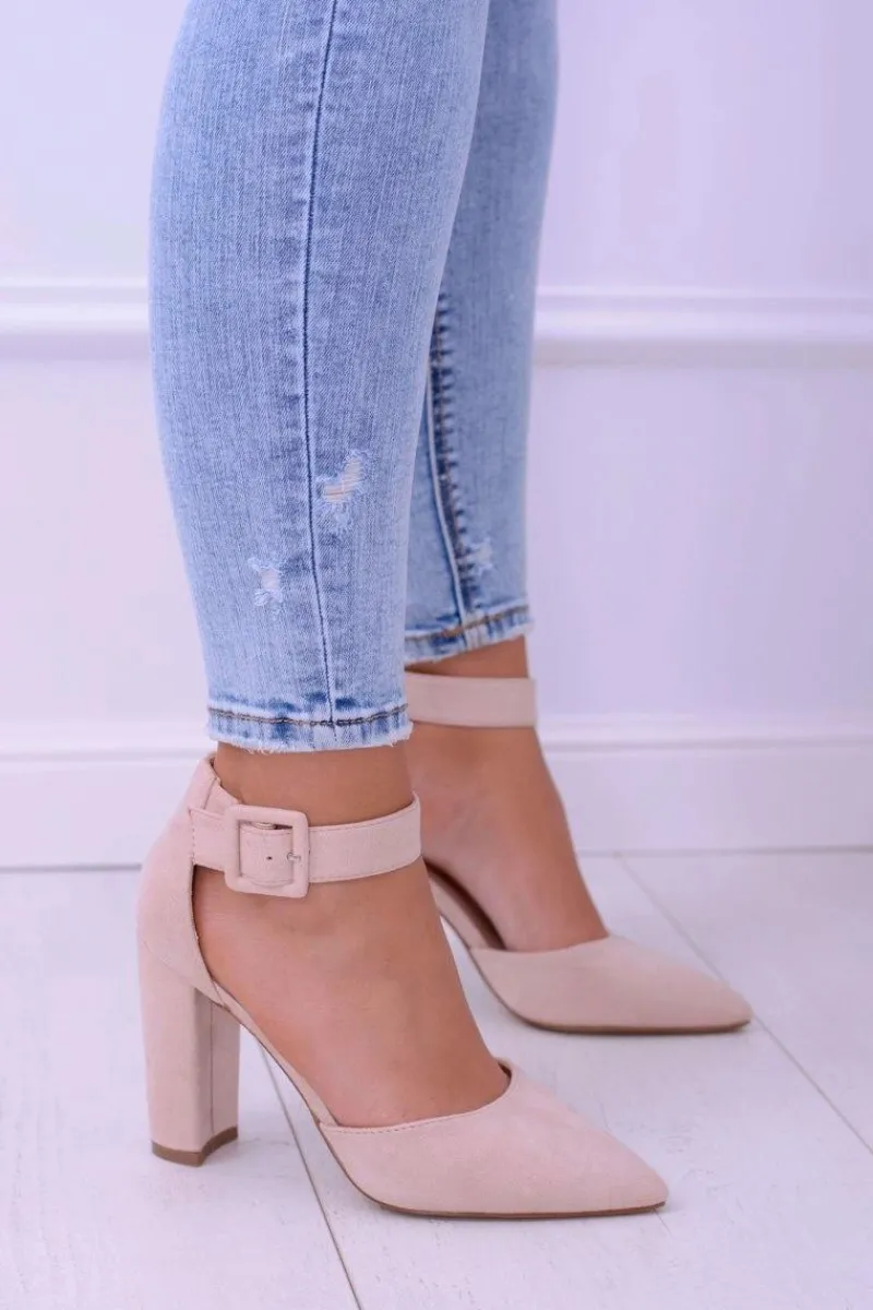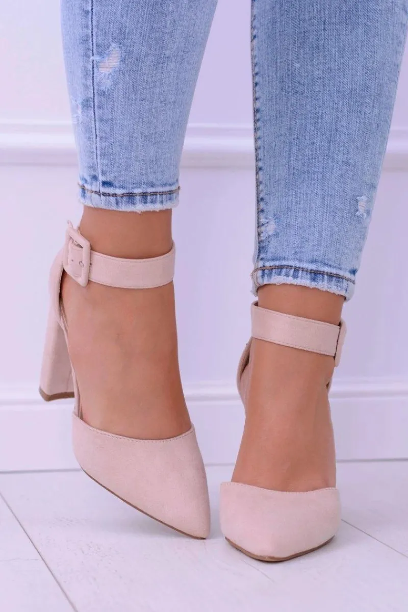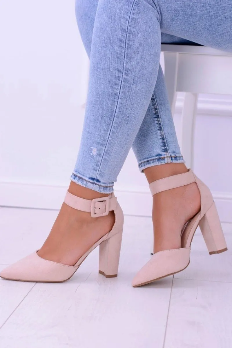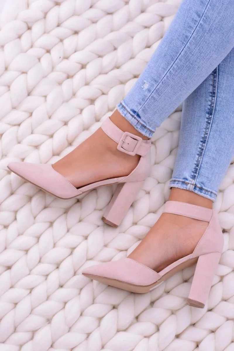 Elegancki i klasyczny model czółenek. Zamszowy materiał oraz wysoki słupek to podstawa dobrego obuwia. Wysokość obcasa wynosi 10 cm. Wkładka wykonana ze skóry ekologicznej w celu zapewnienia większego komfortu. Zapinane na pasek wokół kostki. Idealne na wszelkie okazje.