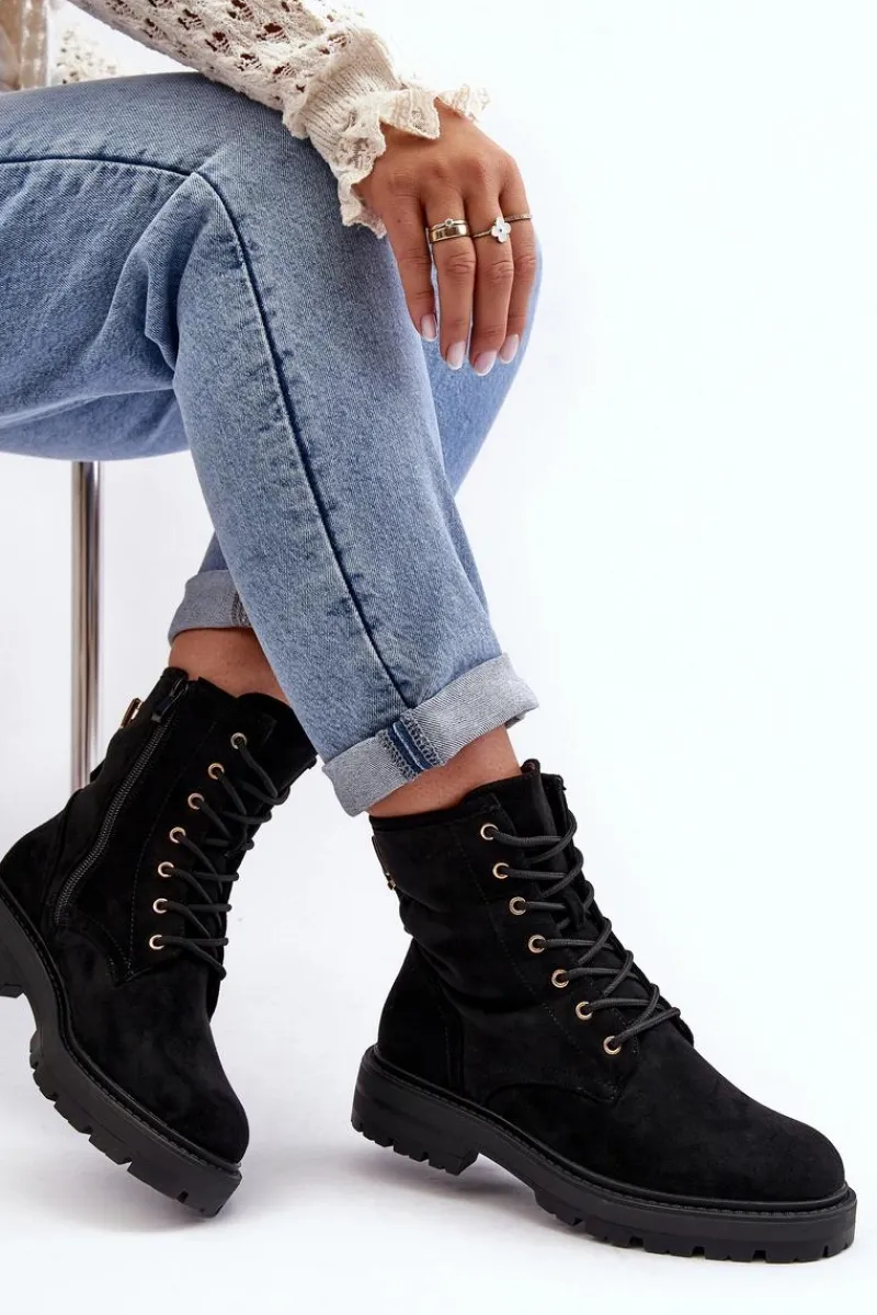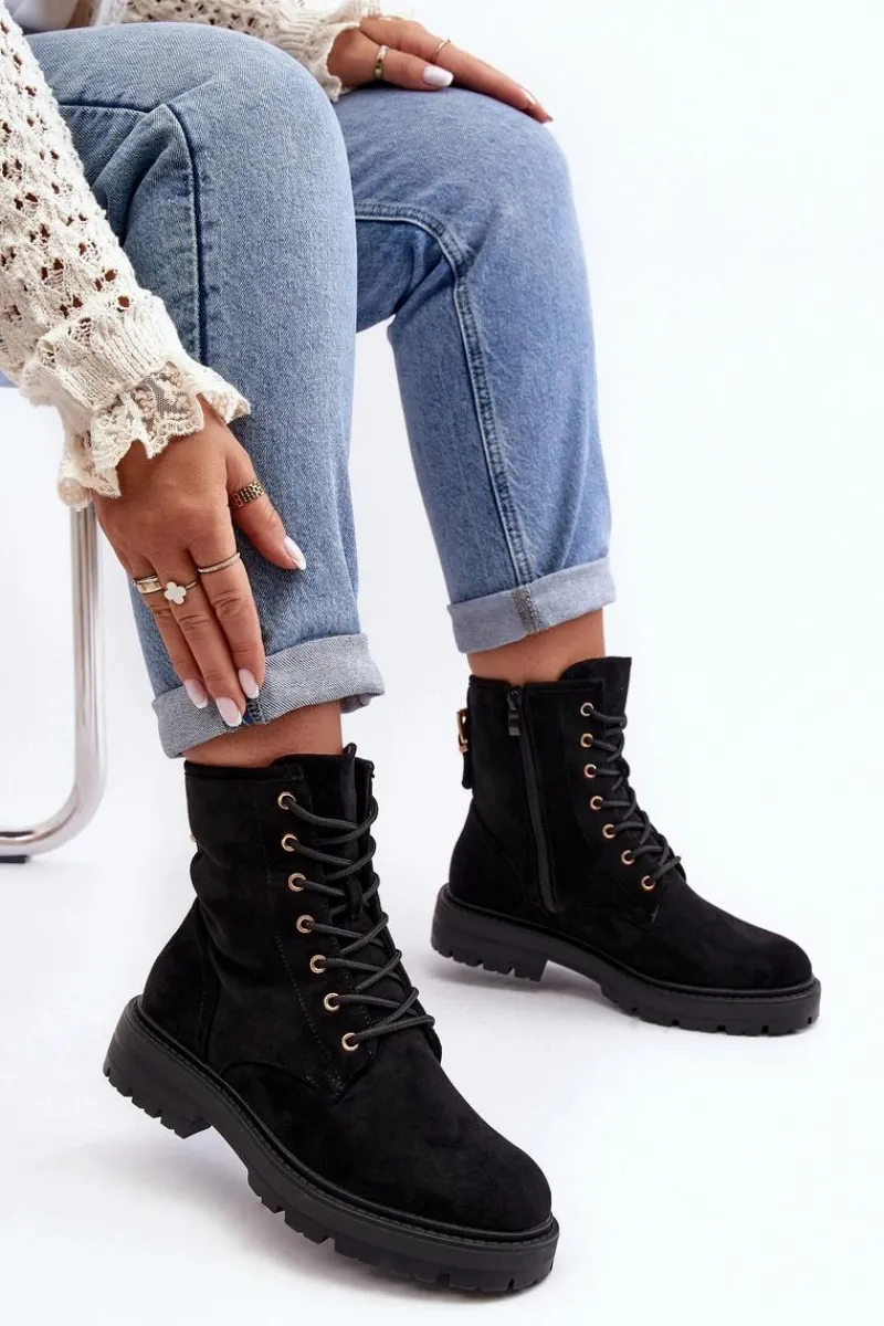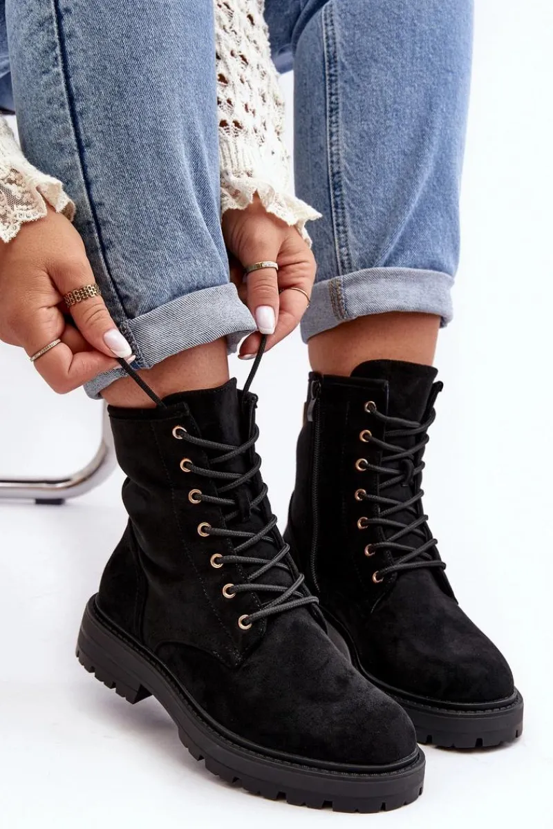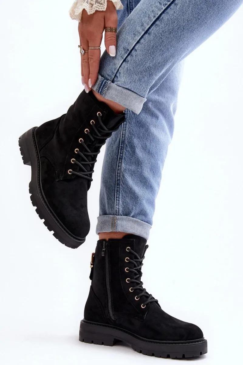 Klasyczne botki damskie wykonane z eko zamszu. Osadzone na platformie oraz płaskim obcasie. Model ten zapinany jest na suwak oraz dodatkowo posiada sznurowanie. Noski zaokrąglone. Zapiętek usztywniany pozwoli na odpowiednią stabilizację stopy. Z tyłu cholewki krótki pasek z klamrą. Koniecznie powinnaś je mieć! Przy wyborze rozmiaru prosimy sugerować się tabelą rozmiarów.