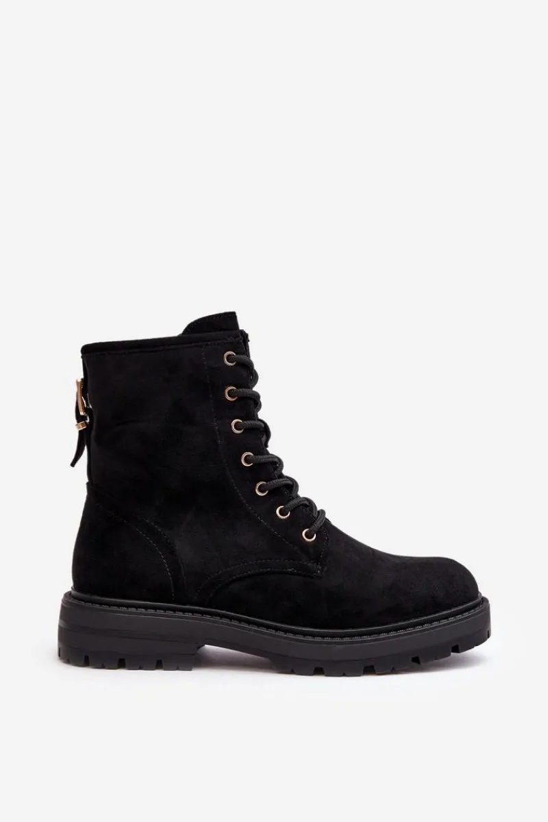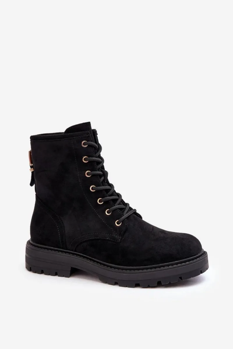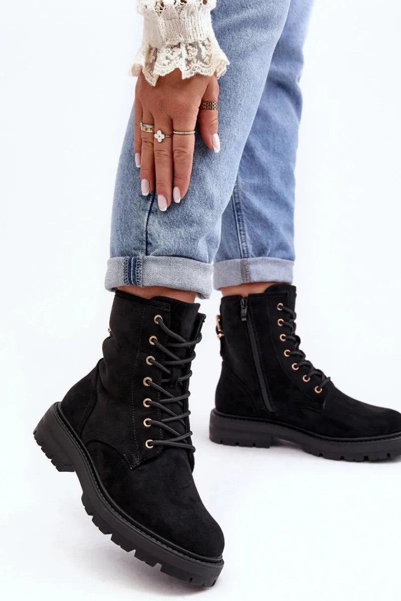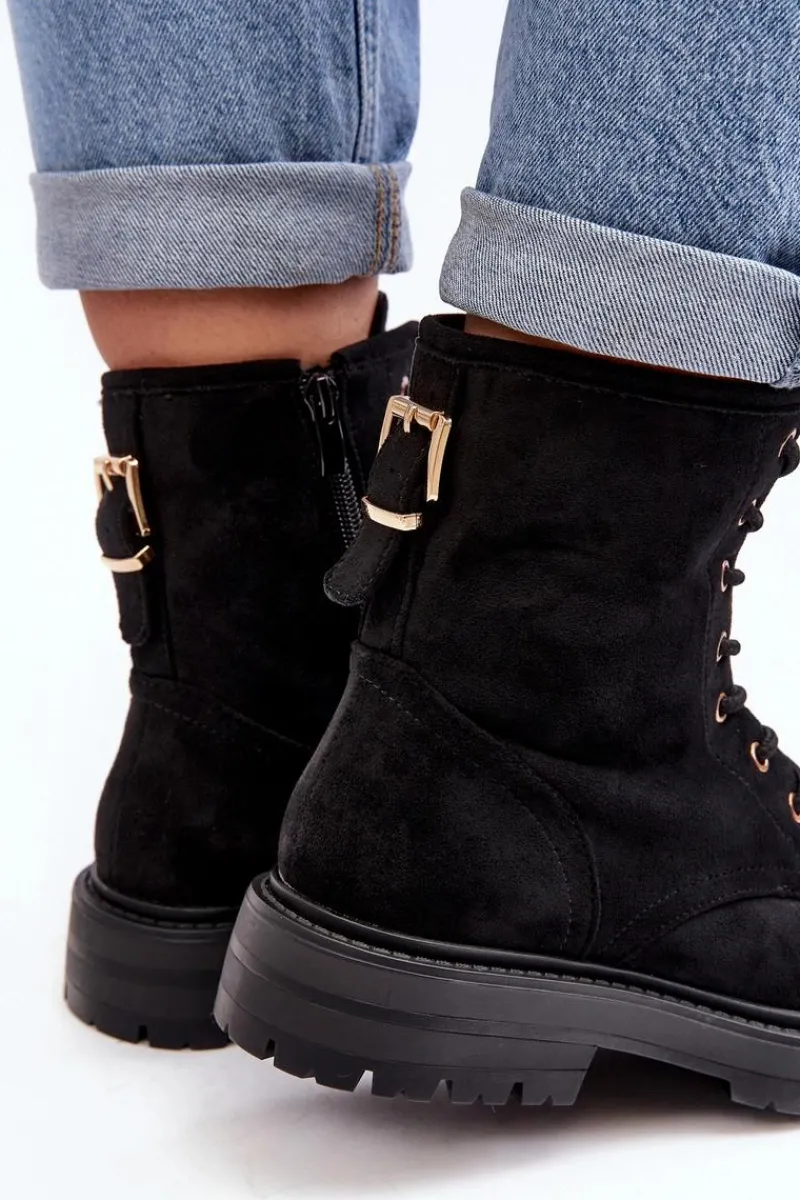 Klasyczne botki damskie wykonane z eko zamszu. Osadzone na platformie oraz płaskim obcasie. Model ten zapinany jest na suwak oraz dodatkowo posiada sznurowanie. Noski zaokrąglone. Zapiętek usztywniany pozwoli na odpowiednią stabilizację stopy. Z tyłu cholewki krótki pasek z klamrą. Koniecznie powinnaś je mieć! Przy wyborze rozmiaru prosimy sugerować się tabelą rozmiarów.