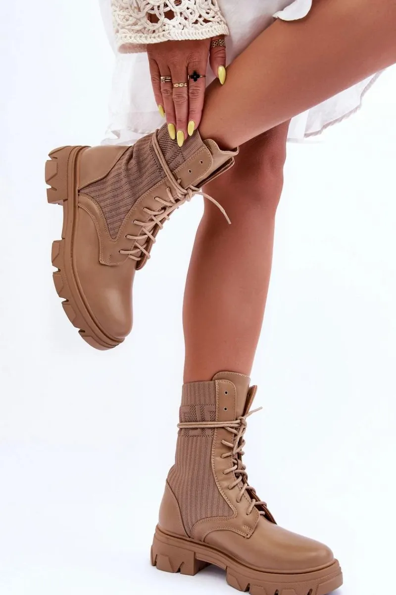 Damskie botki na płaskim, masywnym obcasie i platformie świetnie sprawdzą się do wielu stylizacji! Wykonane z połączenia elastycznej tkaniny oraz eko skóry. Model klasycznie sznurowany pozwoli na odpowiednie dopasowanie obuwia do tęgości nogi. Dodatkowo botki te posiadają usztywniany zapiętek. Materiałowa wkładka zapewni komfort podczas użytkowania. Przy wyborze rozmiaru prosimy sugerować się tabelą rozmiarów.