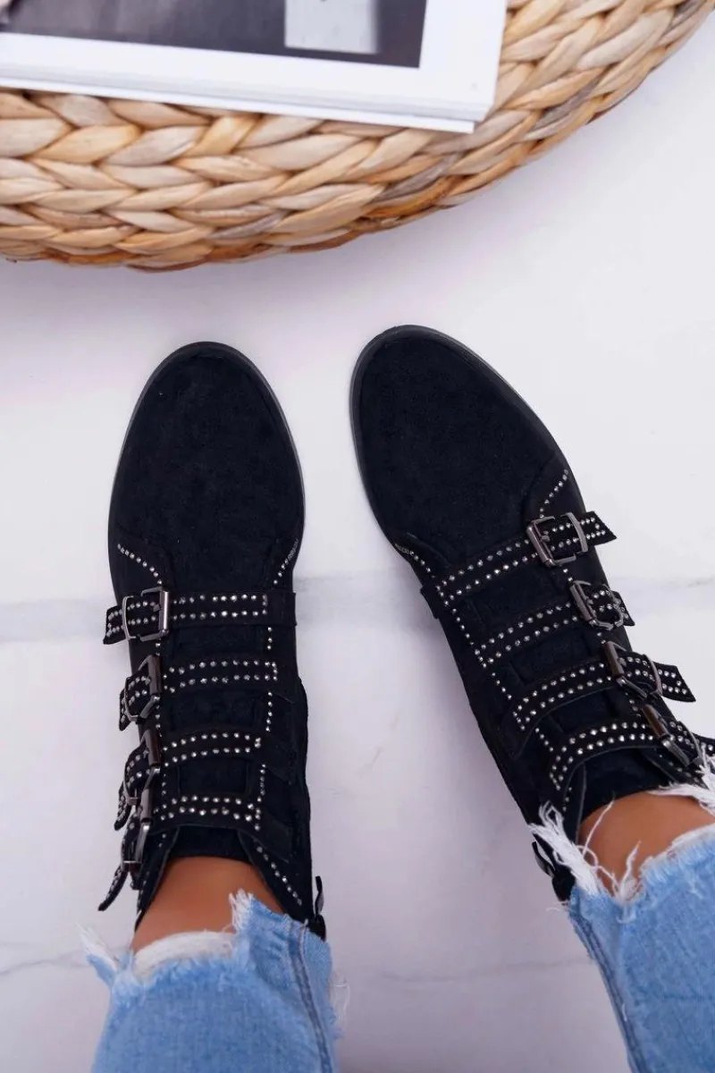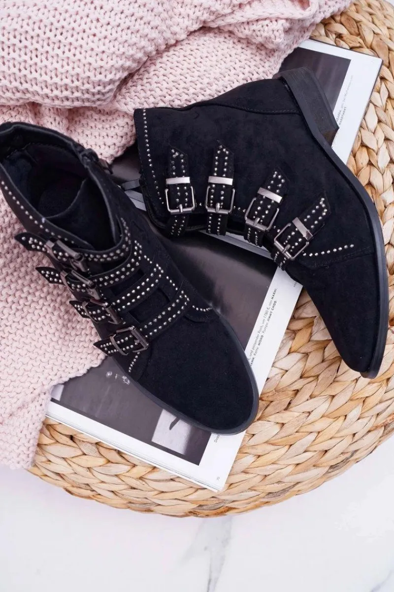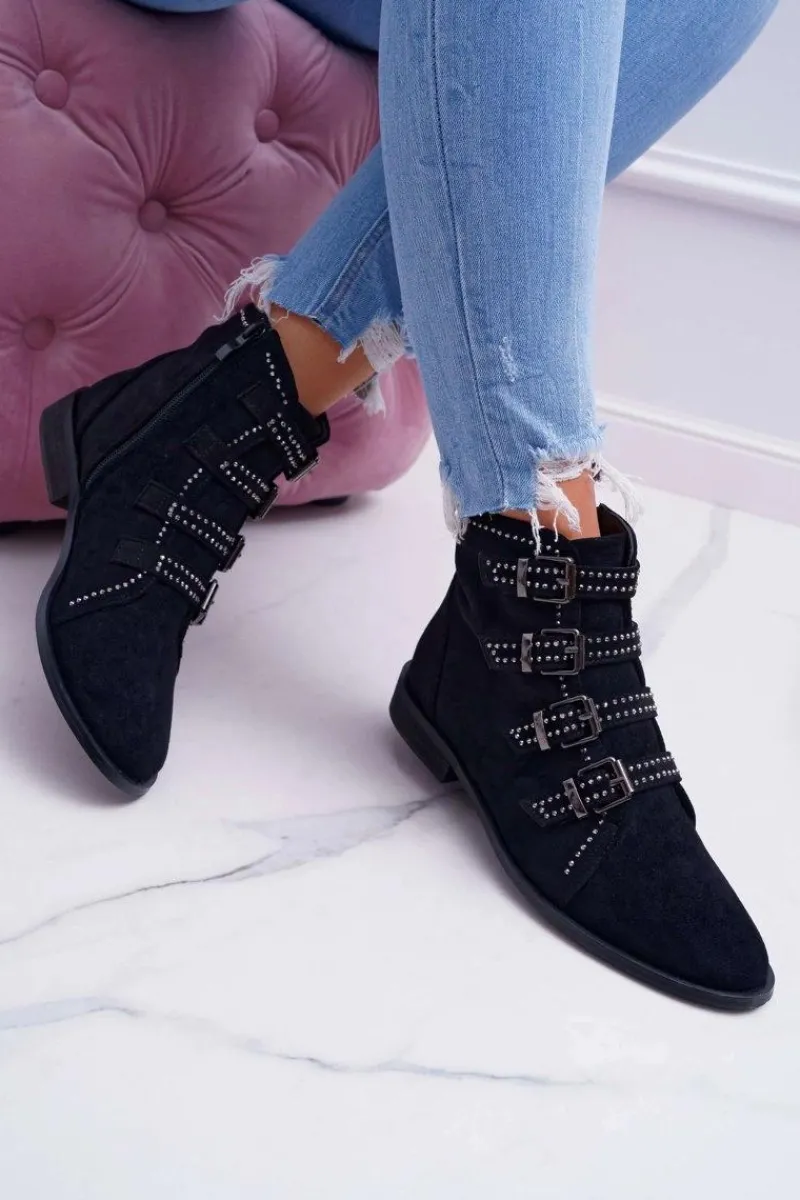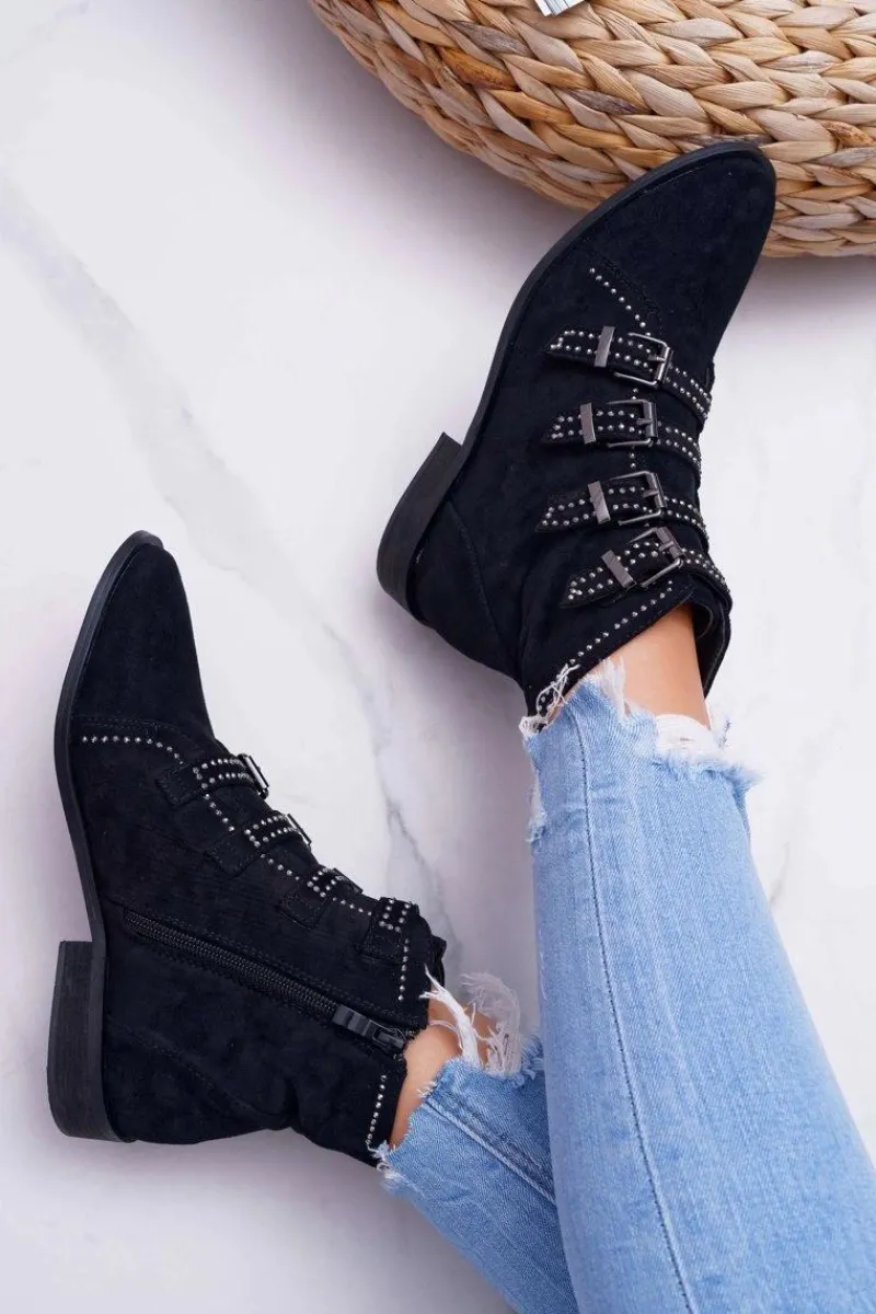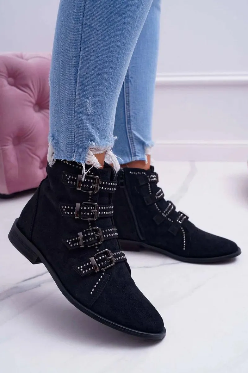 Damskie Botki Zamszowe Nity Klamry Czarne Berugio Damskie Botki Zamszowe|Botki Płaskie