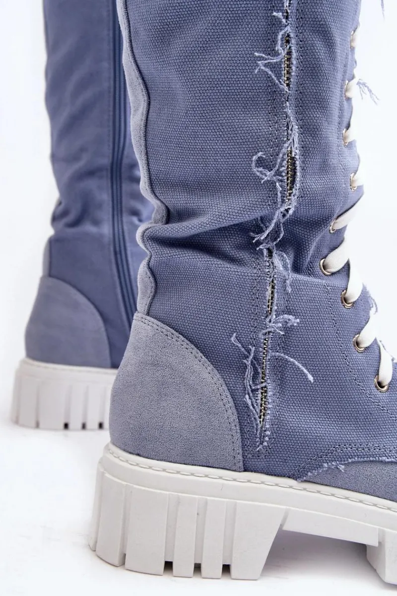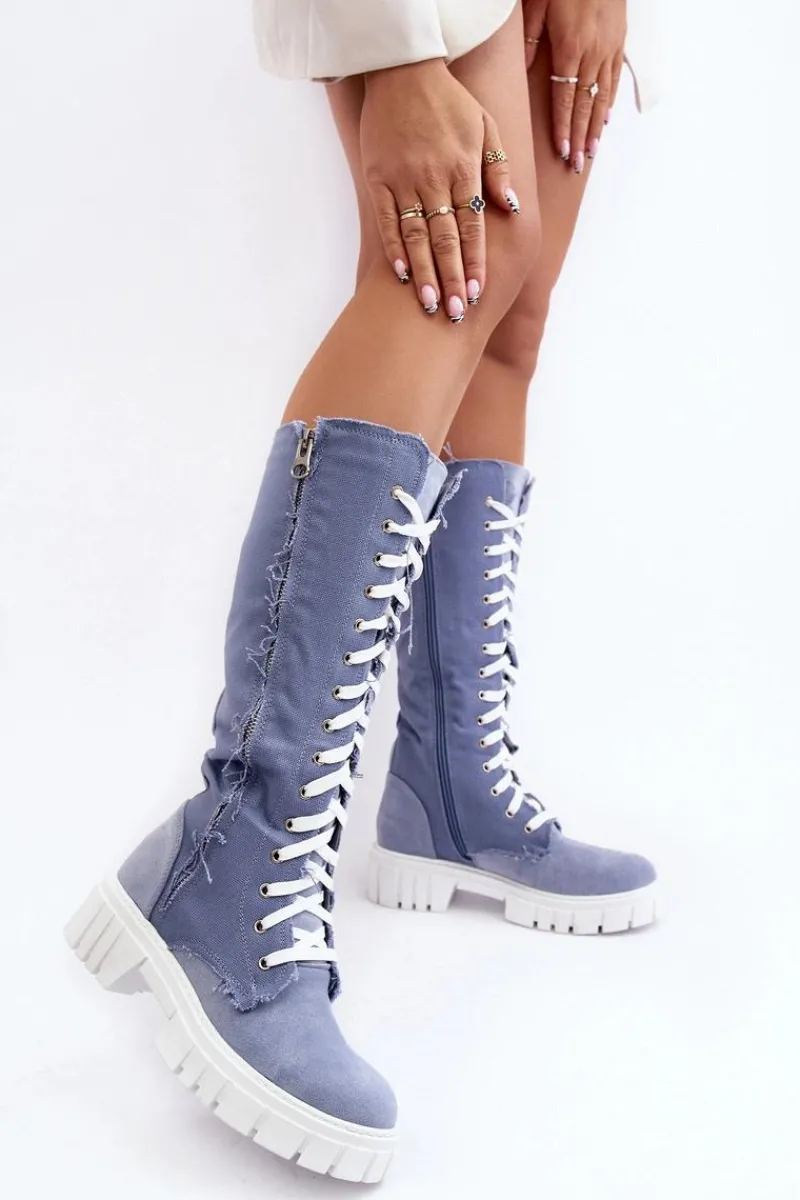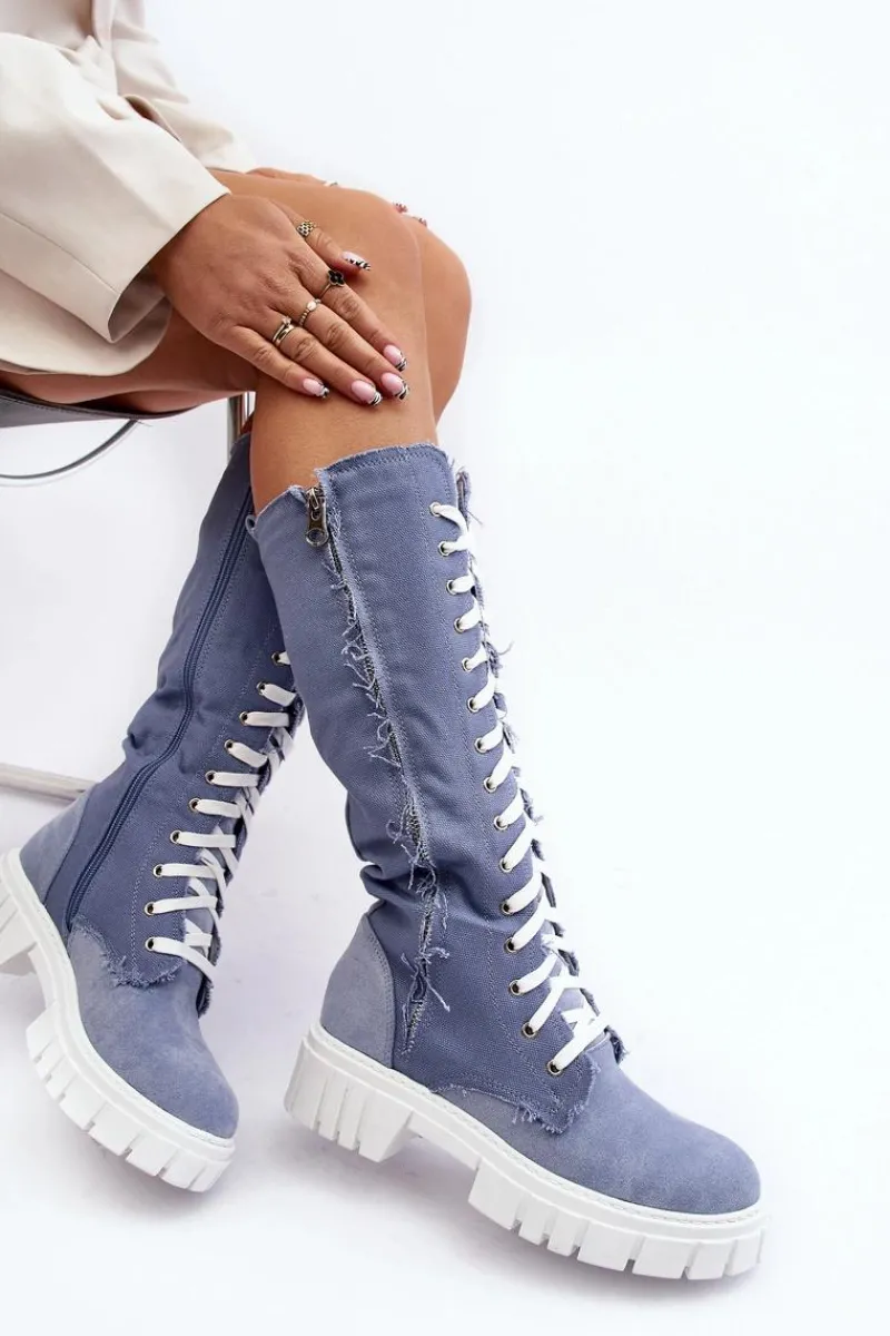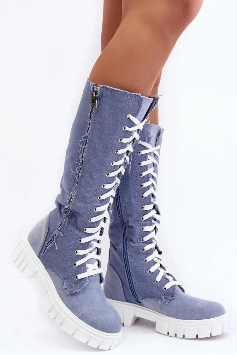 Kozaki damskie z cholewką przed kolano. Wykonane z materiału tekstylnego. Osadzone na płaskim, stabilnym obcasie. Model sznurowany oraz dodatkowo posiada dwa suwaki. Noski zaokrąglone. Usztywniony zapiętek. Środek ocieplony kocem obuwniczym. Modny fason, który powinnaś mieć! Przy wyborze rozmiaru prosimy kierować tabelą rozmiarów.