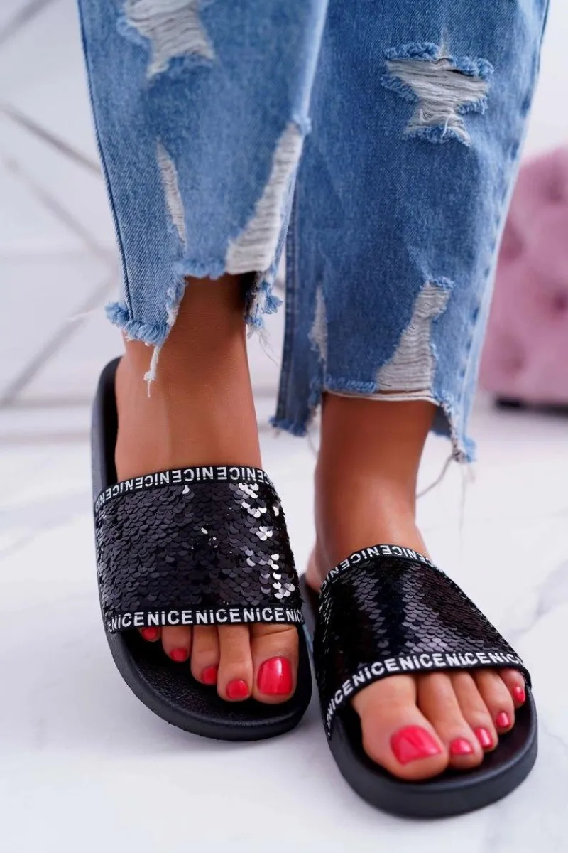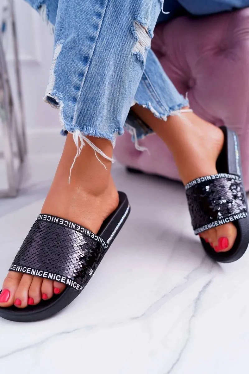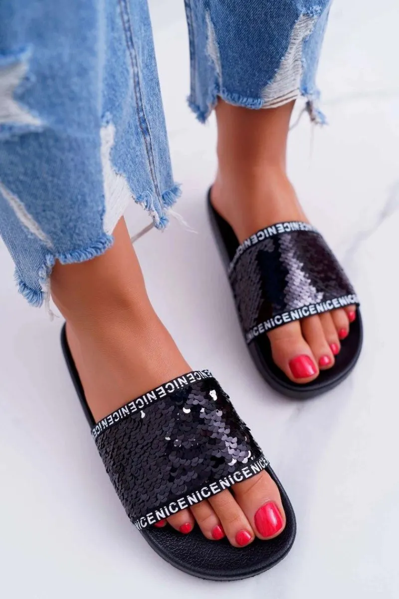 Damskie Klapki Czarne Opalizujące Nice Damskie Klapki Damskie Klasyczne
