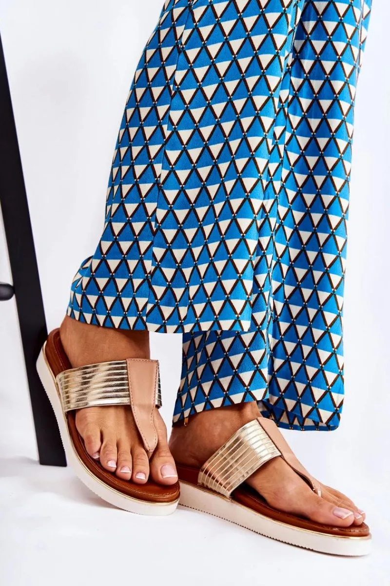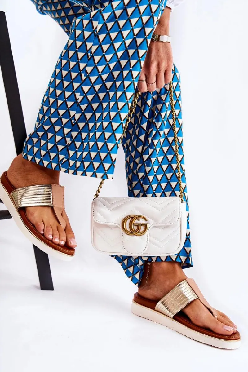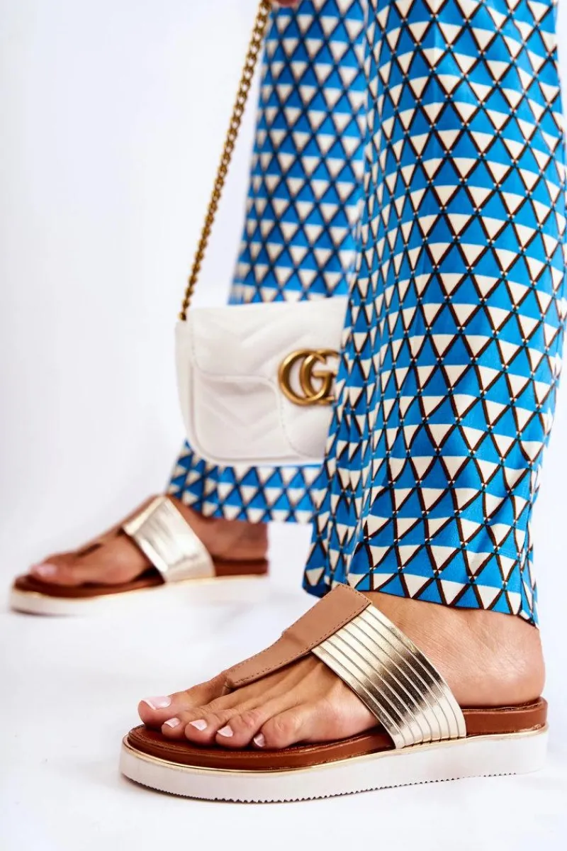 Klasyczne klapki o fasonie japonek. Wykonane z wierzchu z eko skóry. Japonki osadzone na niewysokiej platformie. Podeszwa wykonana z tworzywa sztucznego. Nosek odkryty, zaokrąglony. Miękka wkładka wykonana z eko skóry zapewni komfort oraz wygodę w użytkowaniu. Świetny model na co dzień.