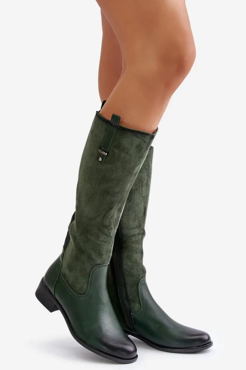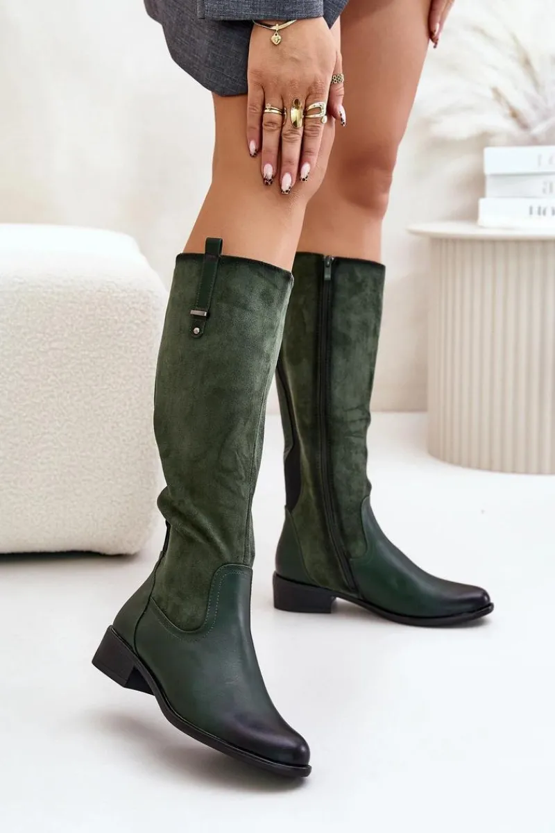 Damskie kozaki marki Jezzi. Cholewka przed kolano. Osadzone na płaskim obcasie, co zapewnia wygodę noszenia przez cały dzień. Posiadają zaokrąglone noski oraz ocieplane wnętrze kocem obuwniczym, co gwarantuje ciepło i komfort. Klasyczny fason sprawia, że będą doskonałym uzupełnieniem każdej stylizacji. Przy wyborze rozmiaru prosimy sugerować się tabelą rozmiarów.