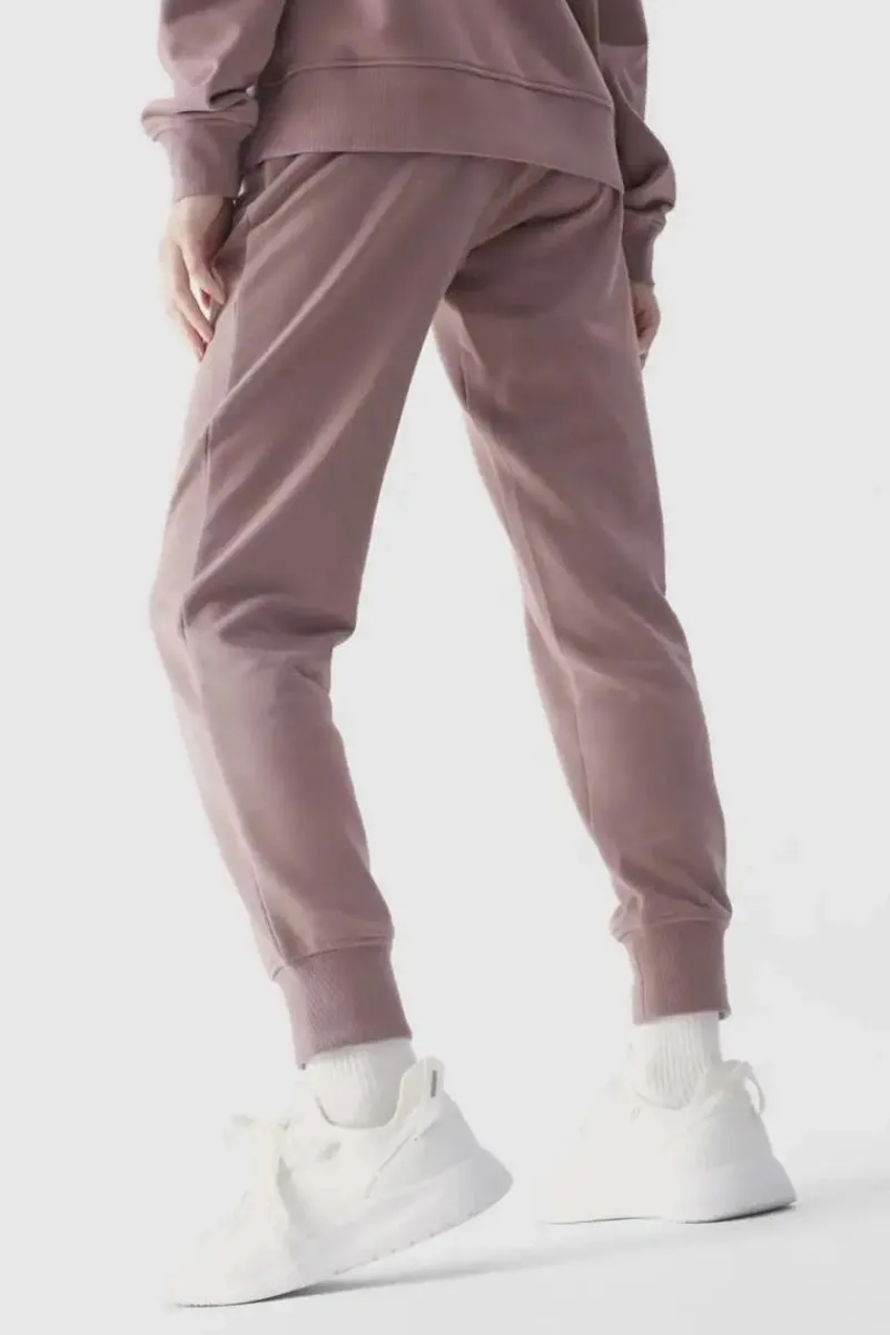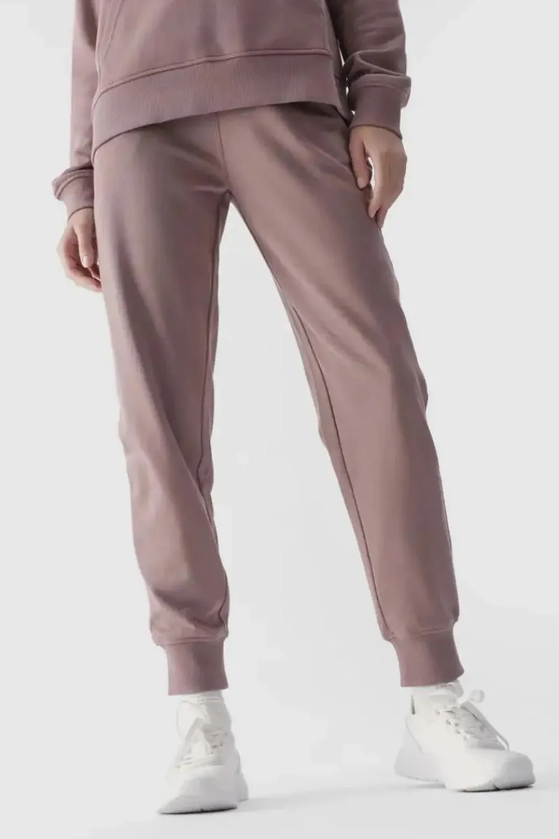 Spodnie dresowe joggery damskie idealnie sprawdzą się jako element zarówno casualowych, jak i sportowych stylizacji na co dzień. Posiadają krój regular, który wygodnie dopasowuje się do sylwetki oraz zwężane nogawki zakończone elastycznym ściągaczem. Dzianina dresowa french terry z jednej strony jest gładka, natomiast z drugiej posiada widoczny splot w postaci pętelki. Dzianina w tym splocie jest miękka, bardziej lejąca i cieńsza w dotyku. Spodnie nie posiadają podszycia, dzięki czemu są lżejsze i odpowiednie na cieplejsze dni. Po bokach znajdują się 2 kieszenie otwarte. Elastyczny pas z wewnętrzną regulacją na troki. Dresy 4F dla kobiety są wykonane w 79% z bawełny, dzięki czemu są miękkie, trwałe i przyjemne w dotyku. Dodatek poliestru (21%) sprawia, że materiał utrzymuje fason i jest odporny na zużycie nawet przez wiele sezonów.