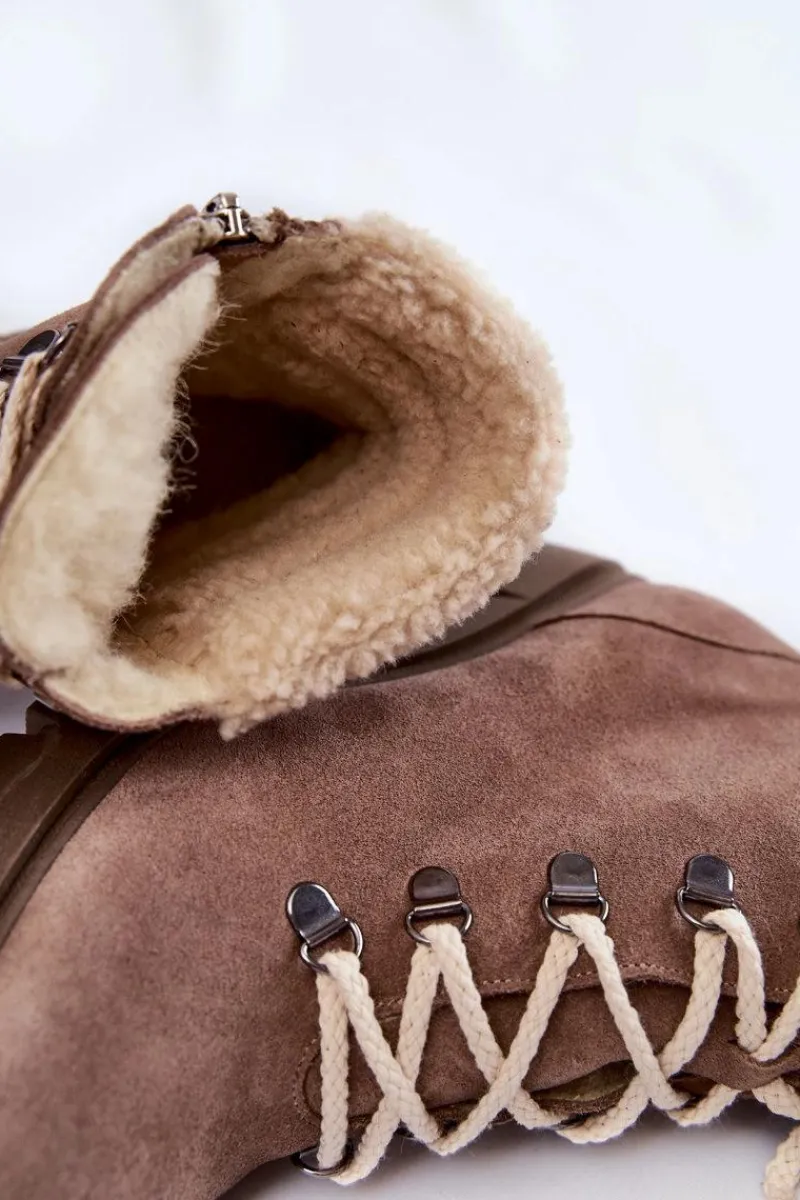Wyjątkowe, damskie botki zostały wykonane z wysokiej jakości naturalnych skór. Model posiada ocieplenie w postaci naturalnej wełny. Dodatkowo botki zostały przyozdobione kożuszkiem z zewnątrz. Zapiętek jest usztywniany. Model ten posiada sznurowanie oraz suwak z boku cholewki. Osadzone na masywnym obcasie w postaci słupka oraz platformie ze żłobieniami. Przy wyborze rozmiaru prosimy kierować się tabelą rozmiarów