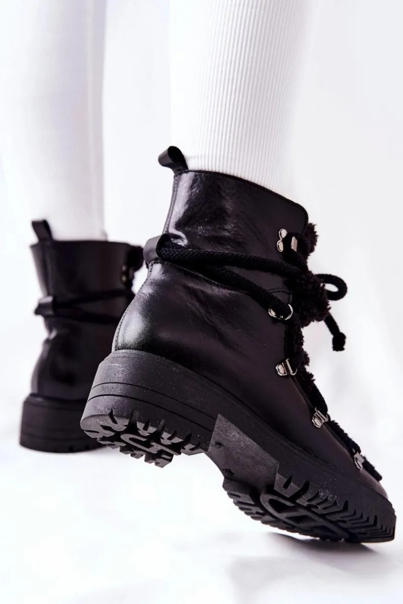 Ten model wprawia w zachwyt każdego, kto uwielbia wyróżniać się z tłumu! Ocieplany język botków, który został wykonany z przyjemnego w dotyku kożuszka sprawia, że trapery są niezwykle wyjątkowe! Zostały wykonane z naturalnej licowej skóry. Wkładka jest także skórzana. Posiadają wiązanie, które można dopasować do tęgości nogi. Buty osadzone są na płaskim obcasie i delikatnej platformie. Koniecznie musisz je mieć! Przy wyborze rozmiaru prosimy sugerować się tabelą rozmiarów.