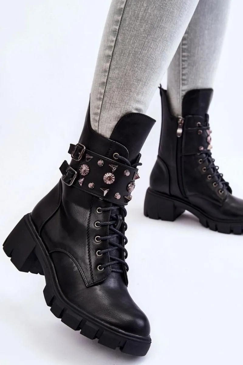 Damskie botki zostały wykonane z eko skóry. Buty zapinane na suwak oraz sznurowane. Klasyczny model został osadzony na płaskim obcasie i platformie. Botki te nie posiadają ocieplenia. Dodatkowo zostały ozdobione ćwiekami na pasku z klamrami. Zapiętek jest usztywniany. Koniecznie powinnaś je mieć w swojej szafie! Przy wyborze rozmiaru prosimy sugerować się tabelą rozmiarów.
