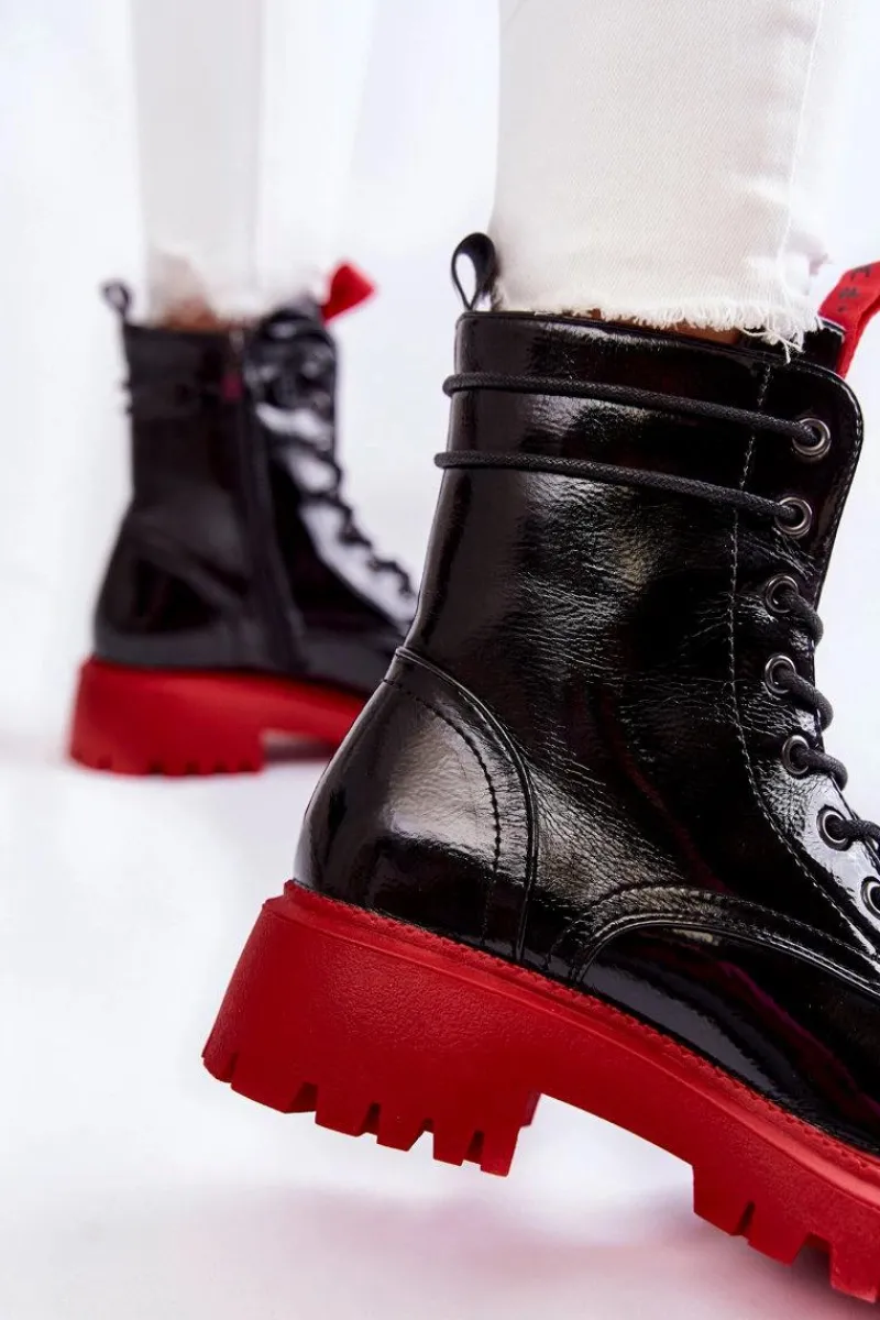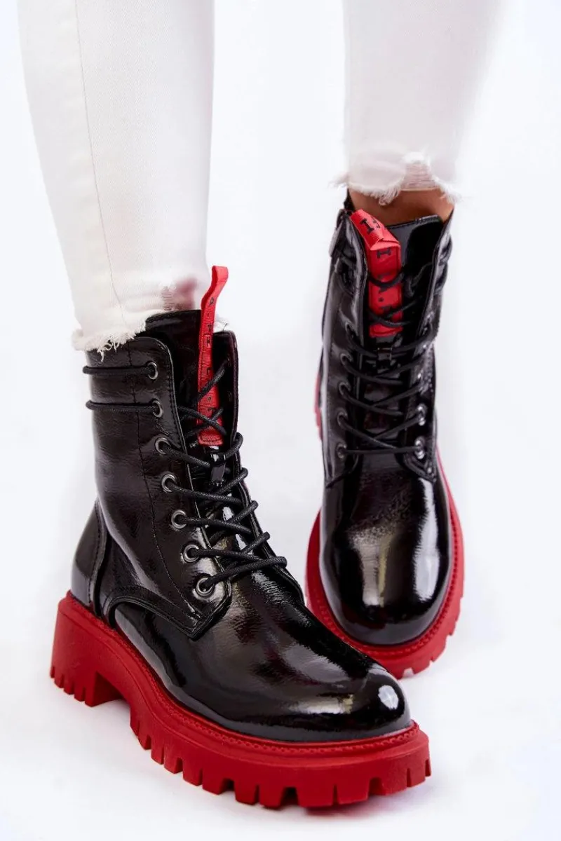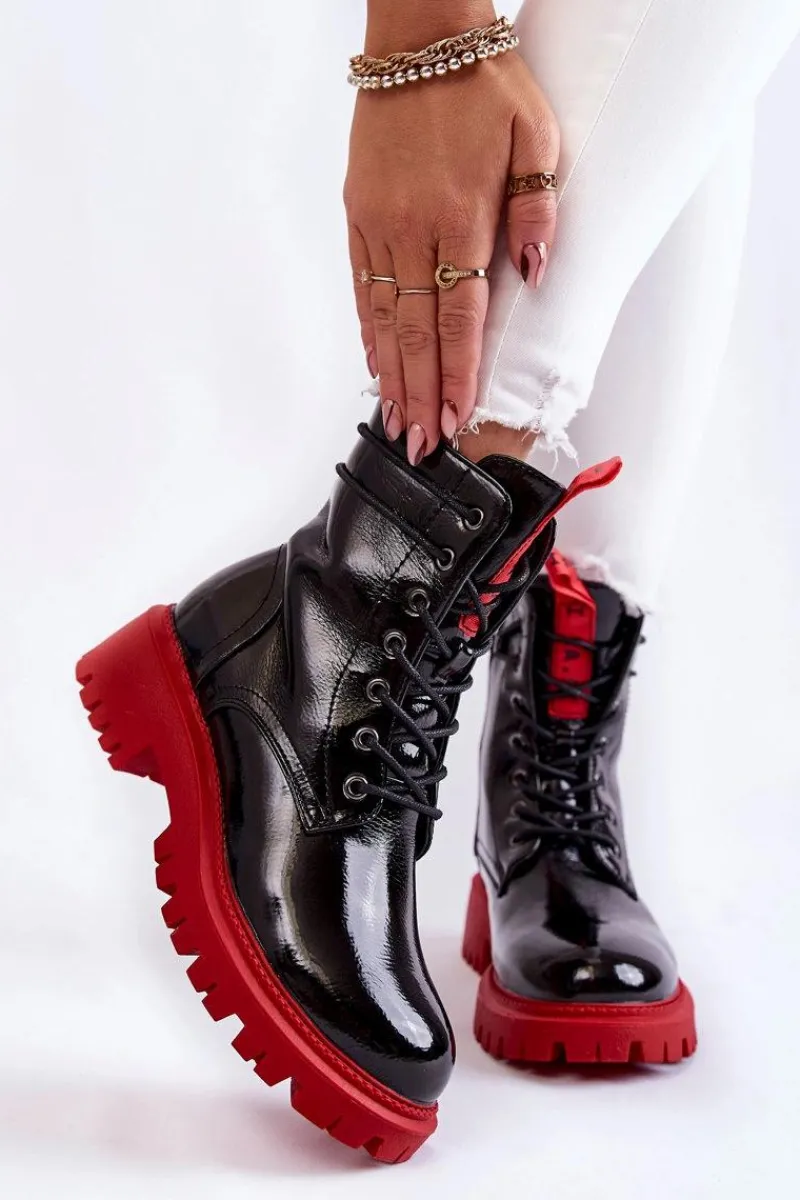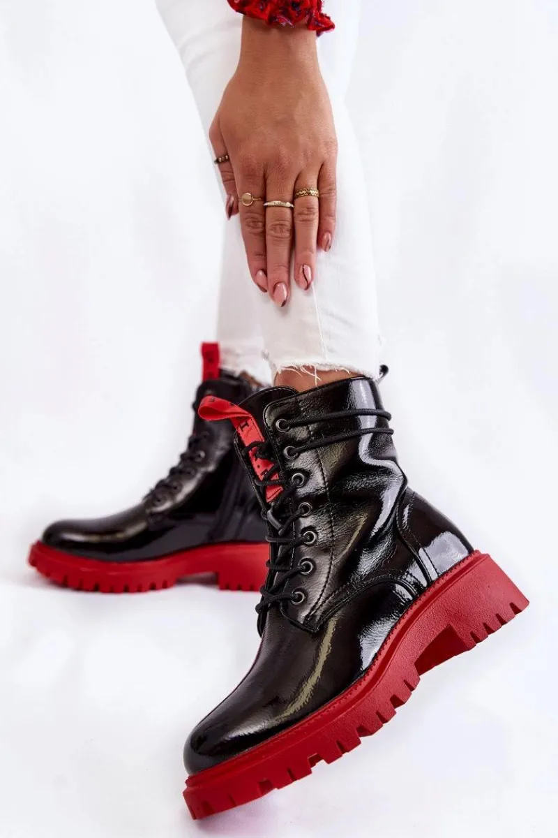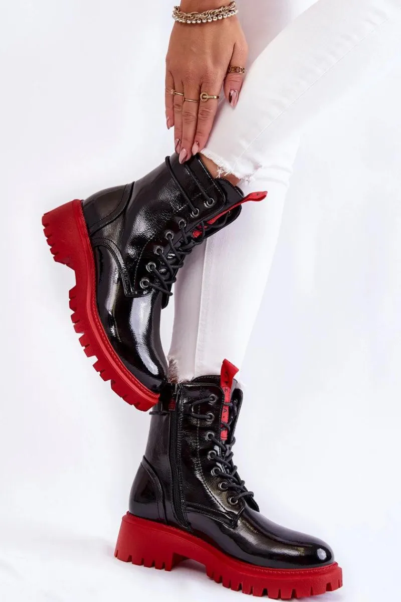 Klasyczne botki zostały wykonane z wysokiej jakości eko skórzanych materiałów. Posiadają klasyczne sznurowanie oraz suwak z boku cholewki ułatwiający zakładanie obuwia. Dodatkowo zapiętek jest usztywniany. Osadzone na płaskim obcasie i platformie z traperową podeszwą. Ocieplone wewnątrz delikatnym futerkiem. Ten model dopełni Twoje stylizacje! Przy wyborze rozmiaru prosimy sugerować się tabelą rozmiarów.