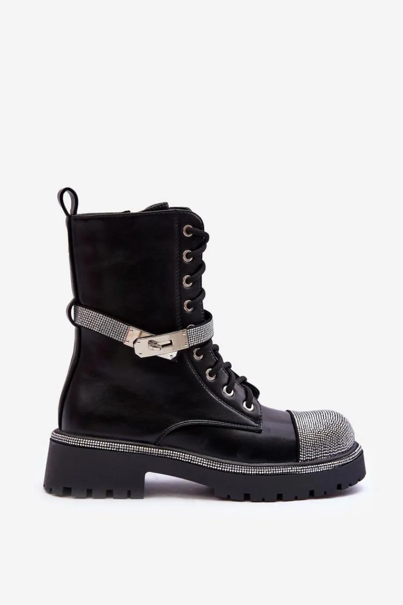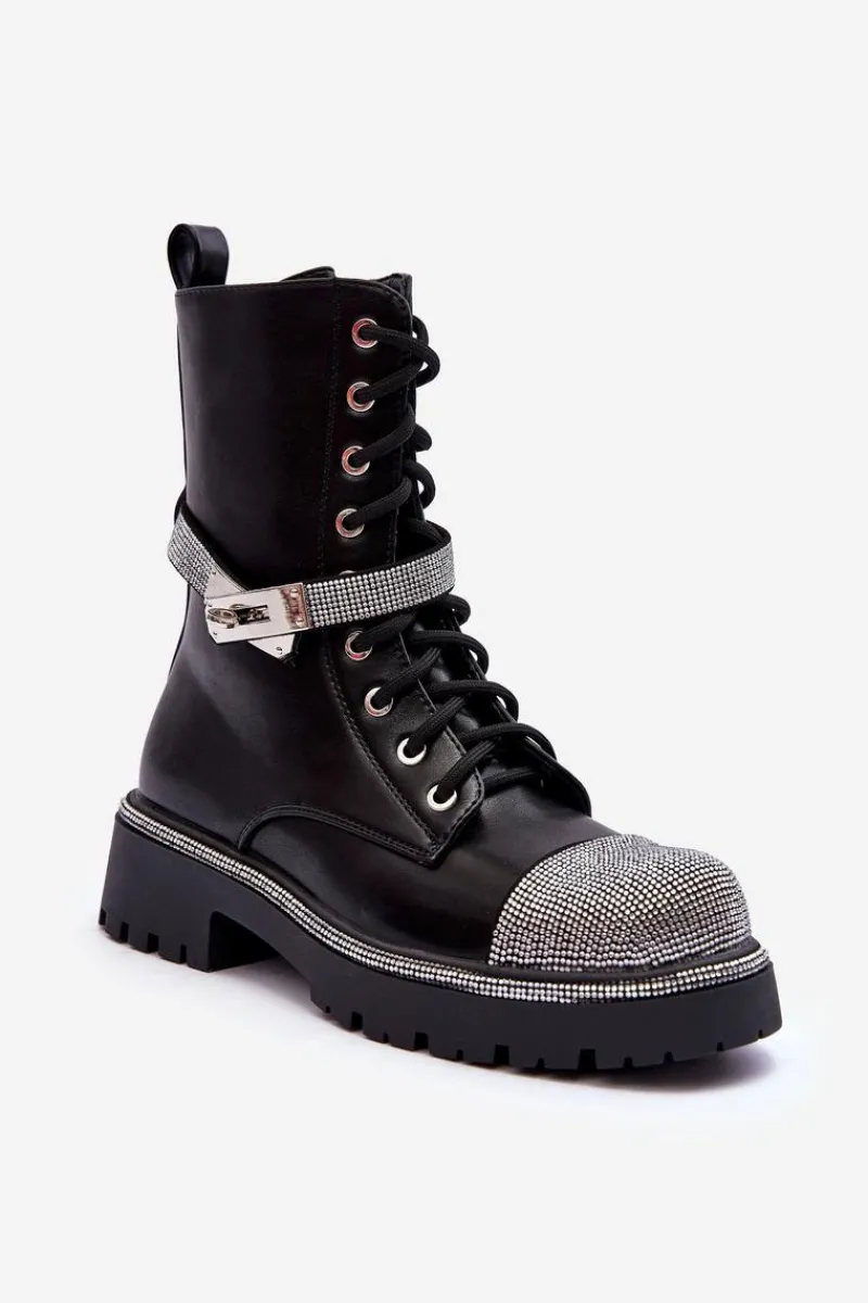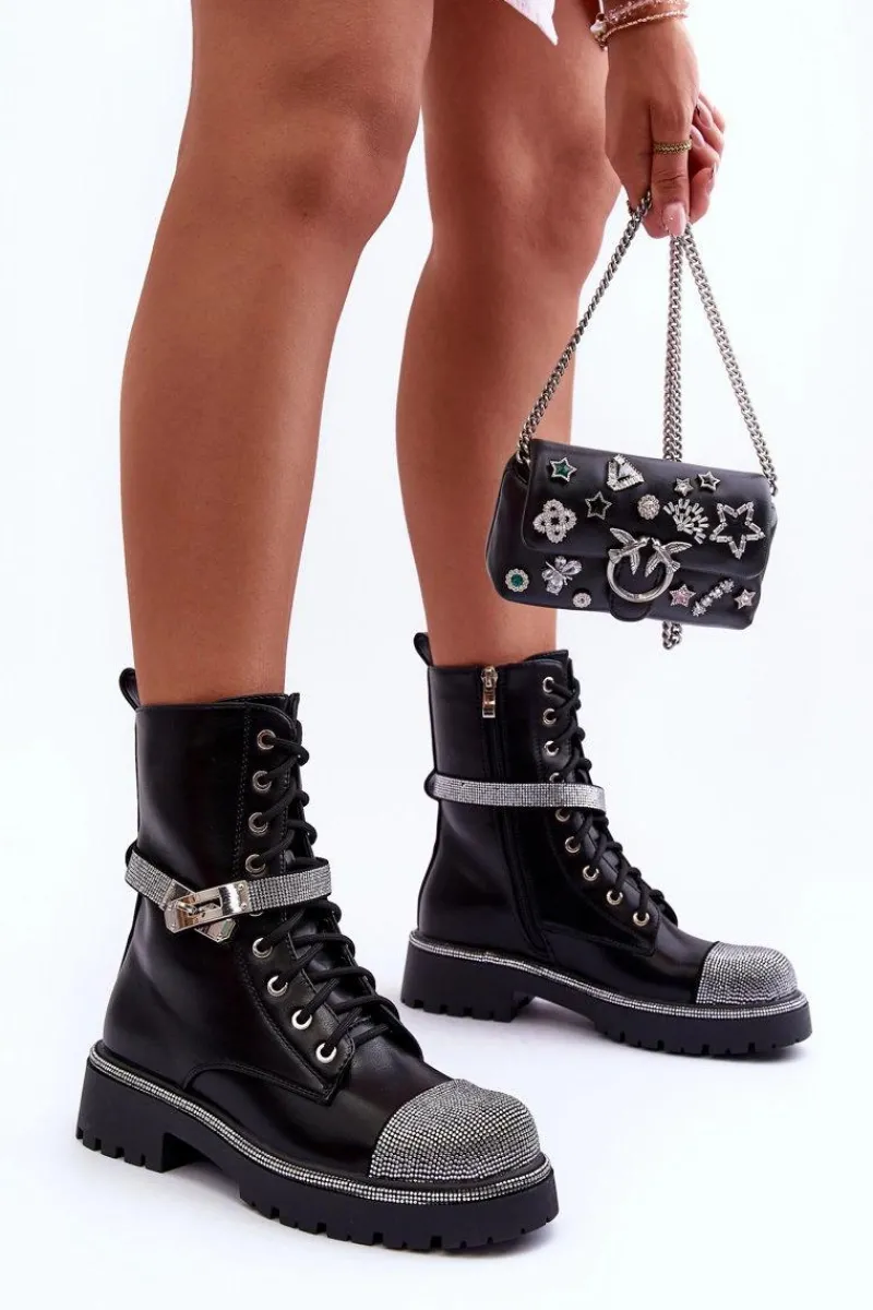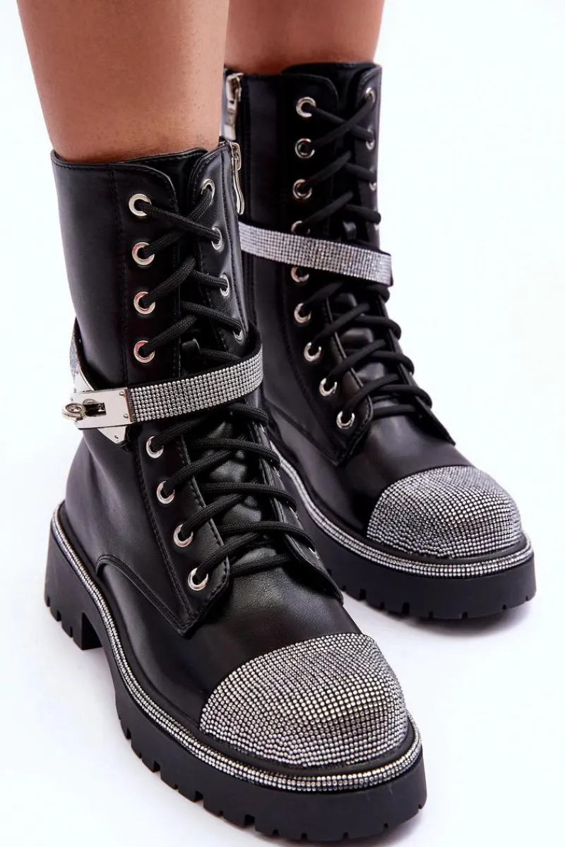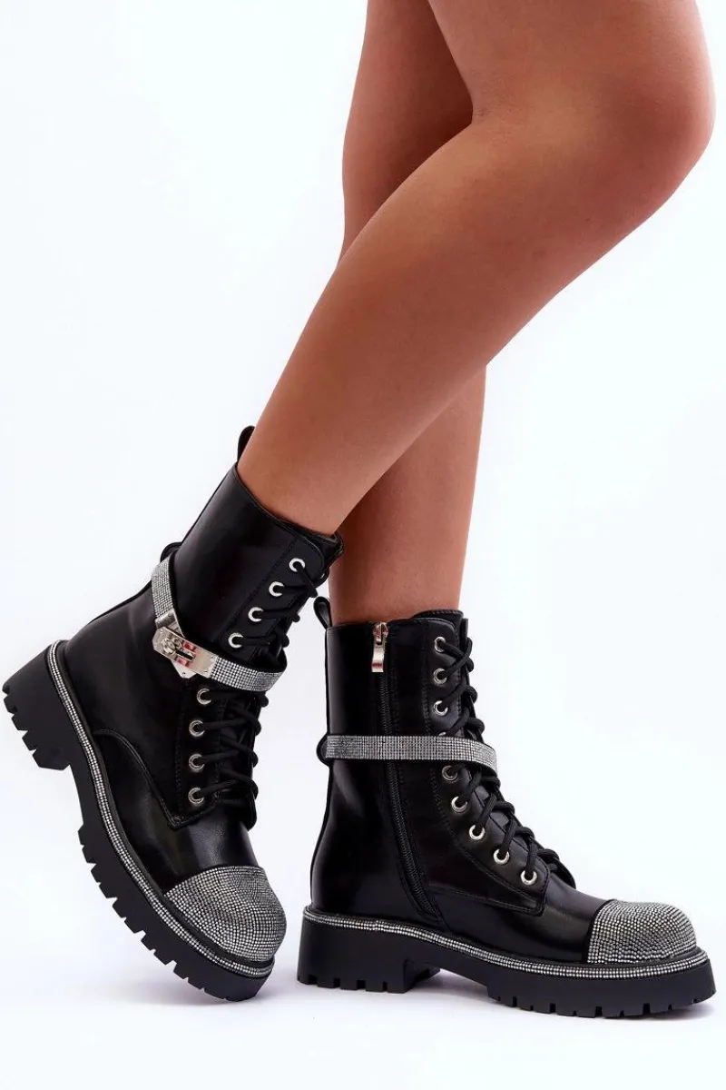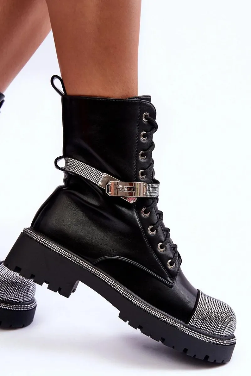 Modne botki damskie zostały wykonane z eko skóry. Botki te posiadają w środku ocieplenie w postaci miłego w dotyku koca obuwniczego. Model ten ozdobiony został małymi, błyszczącymi dżetami. Pasek na cholewce jest odpinany. Zapinane na suwak oraz dodatkowo posiadają sznurowanie. Płaski obcas i platforma ze żłobieniami. Zapiętek jest usztywniany. Idealne do wielu stylizacji. Przy wyborze rozmiaru prosimy sugerować się tabelą rozmiarów.