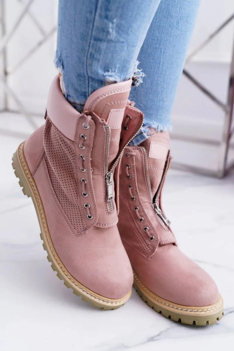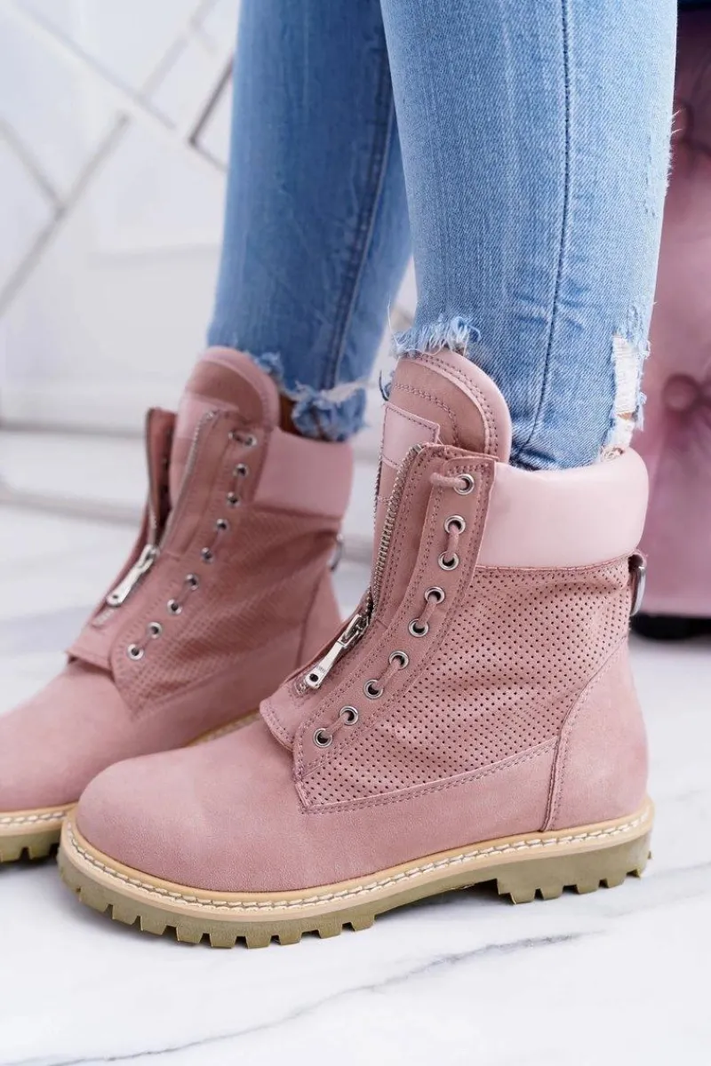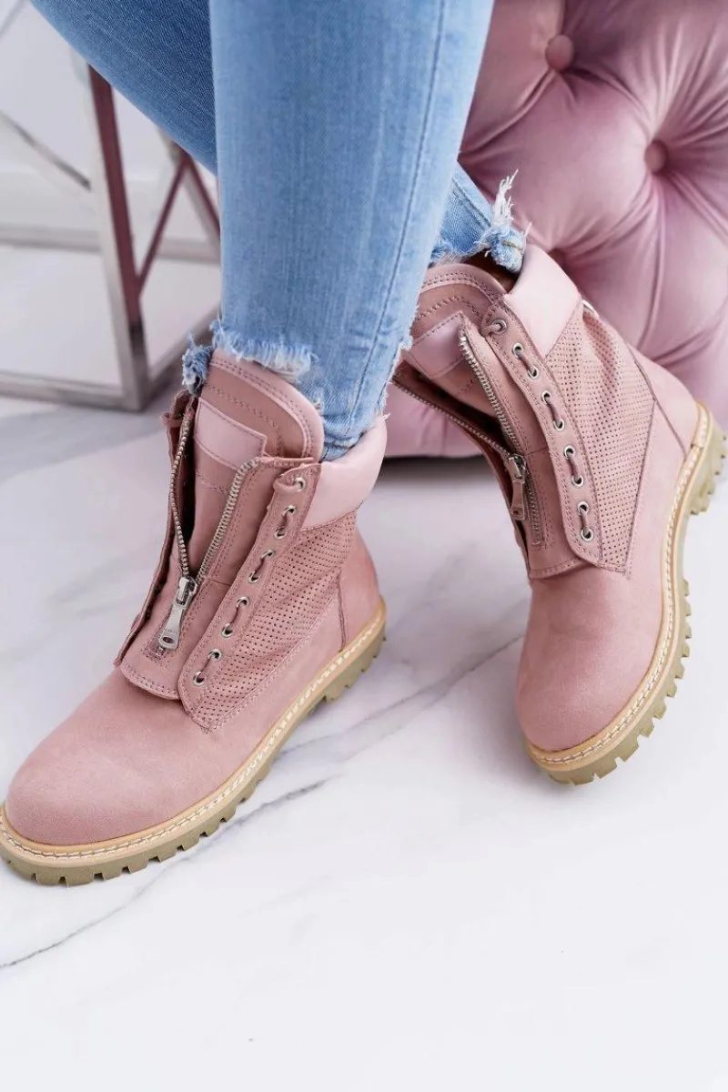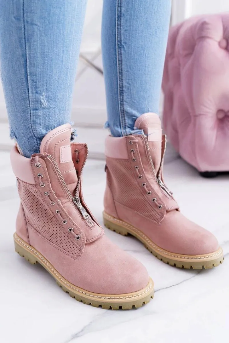Damskie Trapery|Czarne Botki>Boto Lu Boo Damskie Zamszowe Timberki Pudrowy Róż Trapery Suwaki Nancy