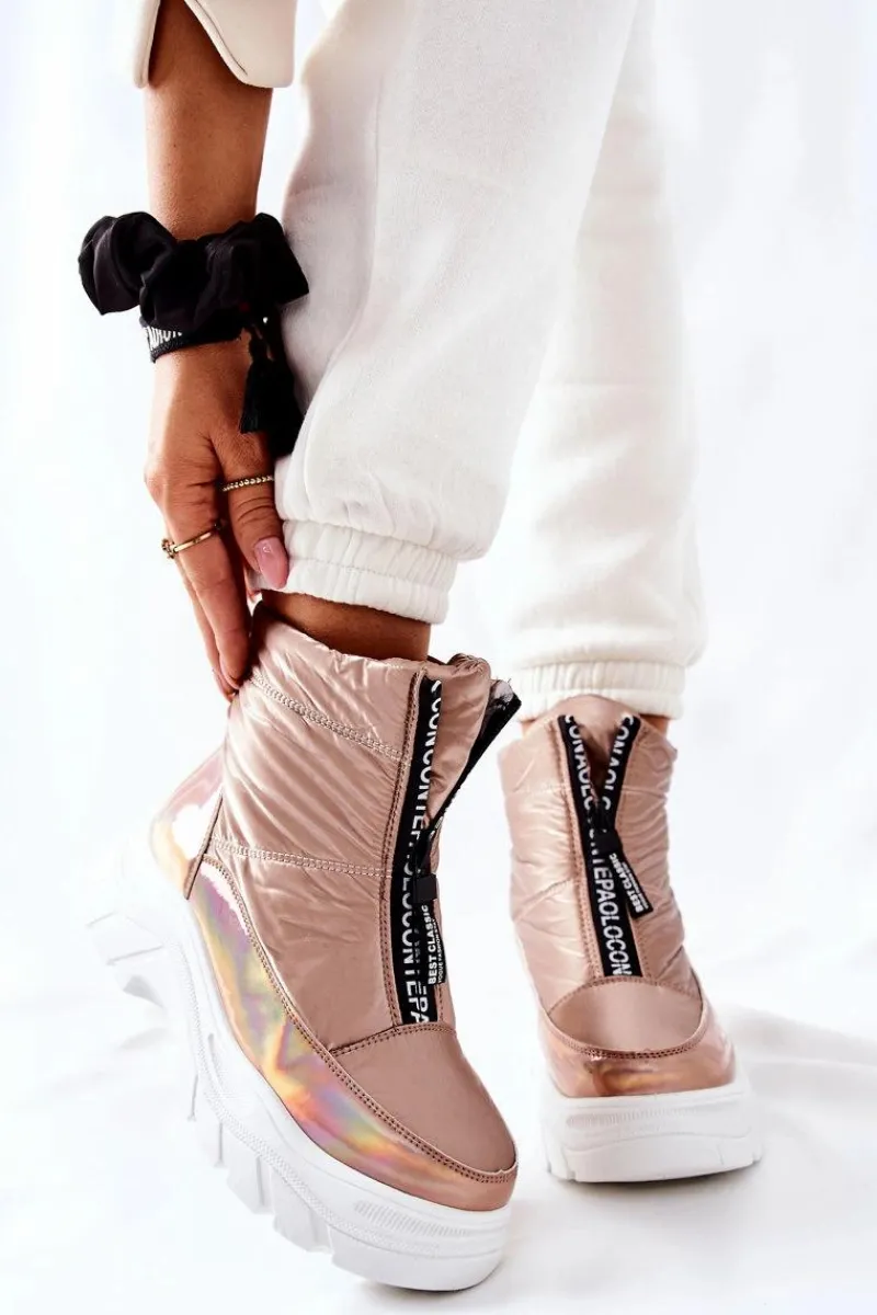 Damskie botki wykonane ze skóry ekologicznej oraz materiału tekstylnego. Zapinane z przodu cholewki na zamek. Ocieplane kocem obuwniczym.