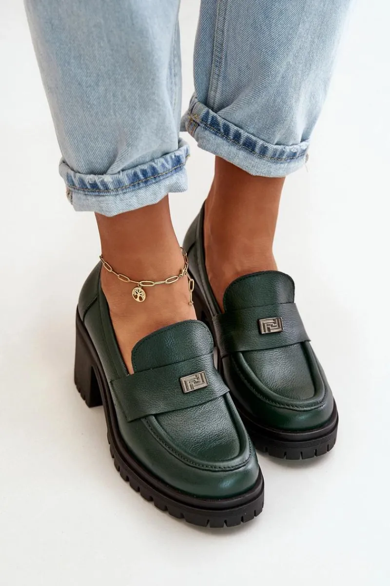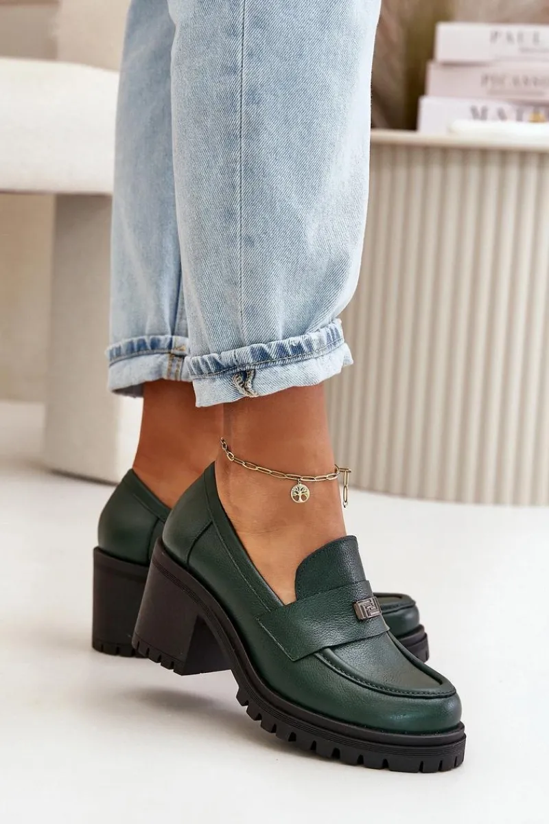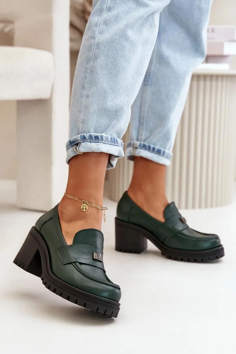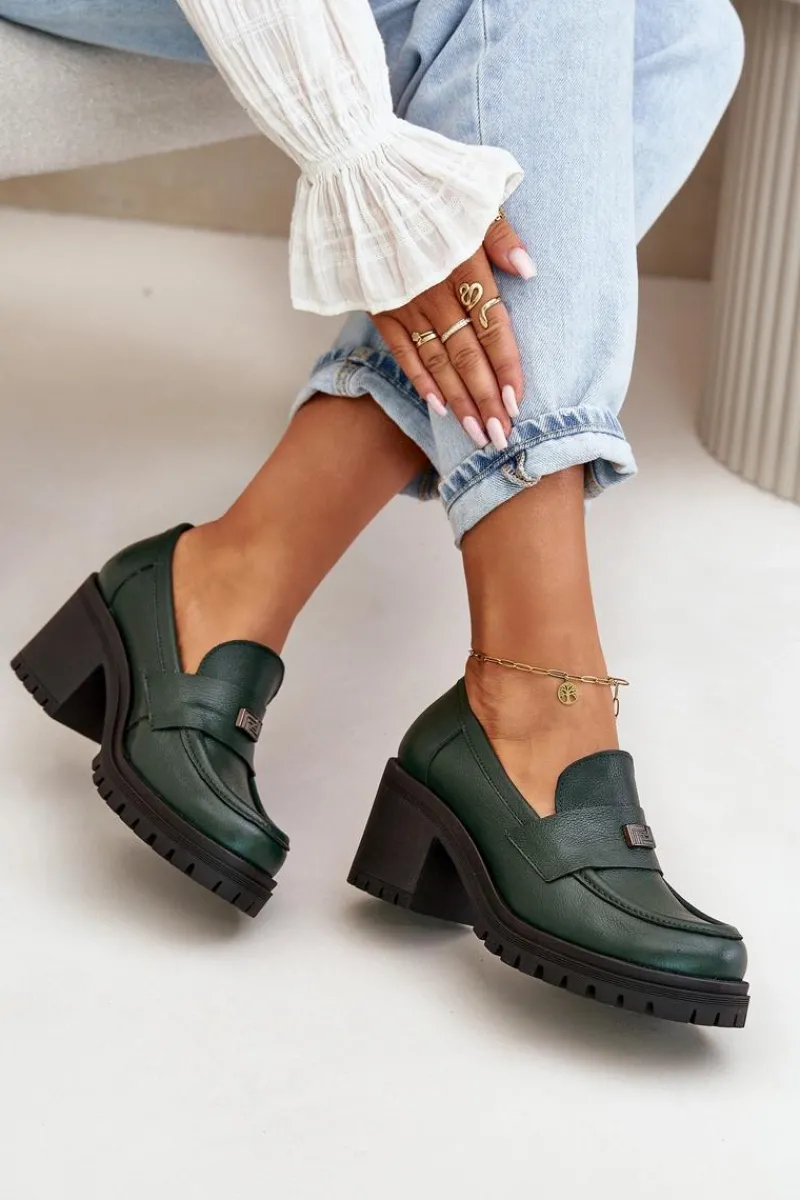 Discount 20168 Eleganckie Półbuty Damskie Na Słupku Skóra Naturalna Ciemnozielone Damskie Półbuty Skórzane