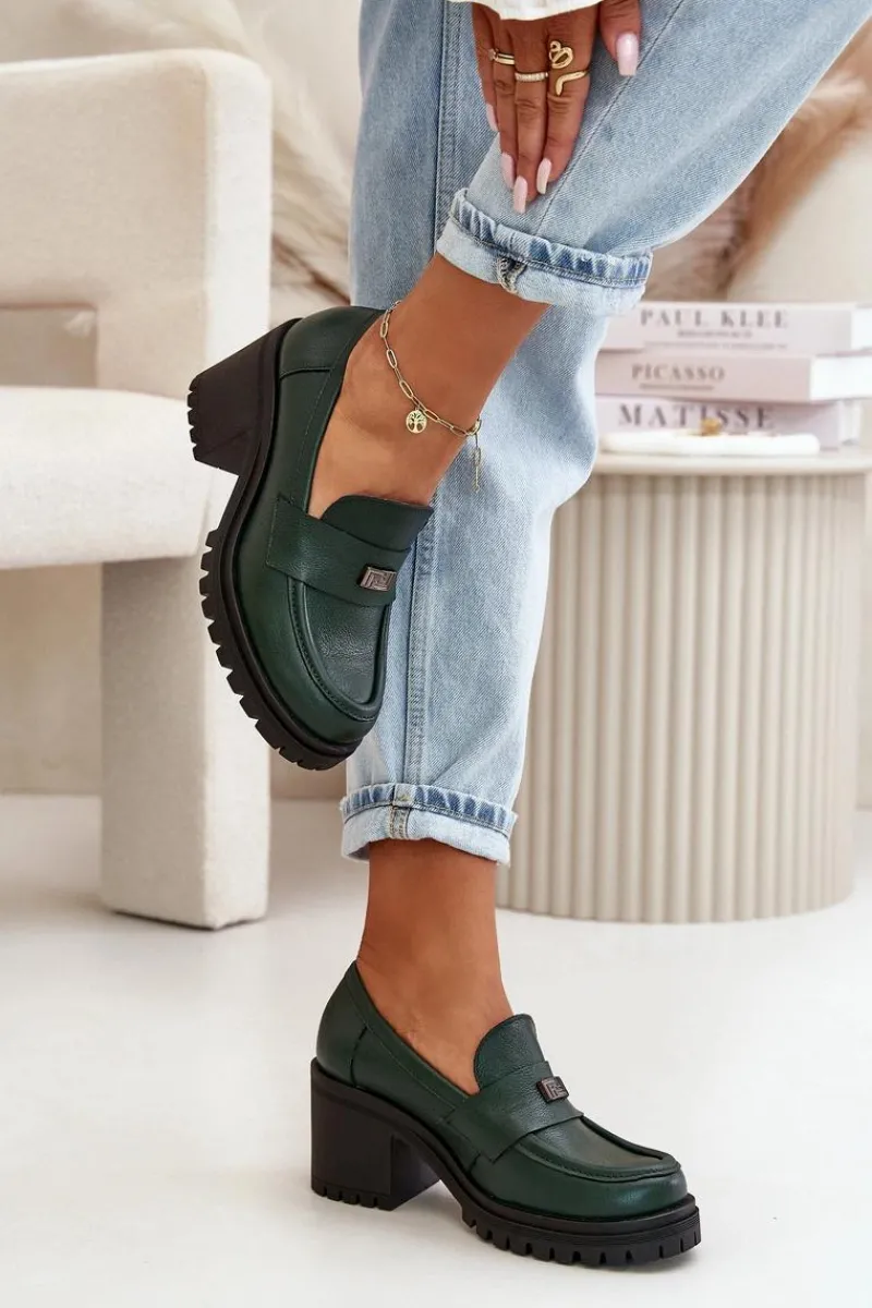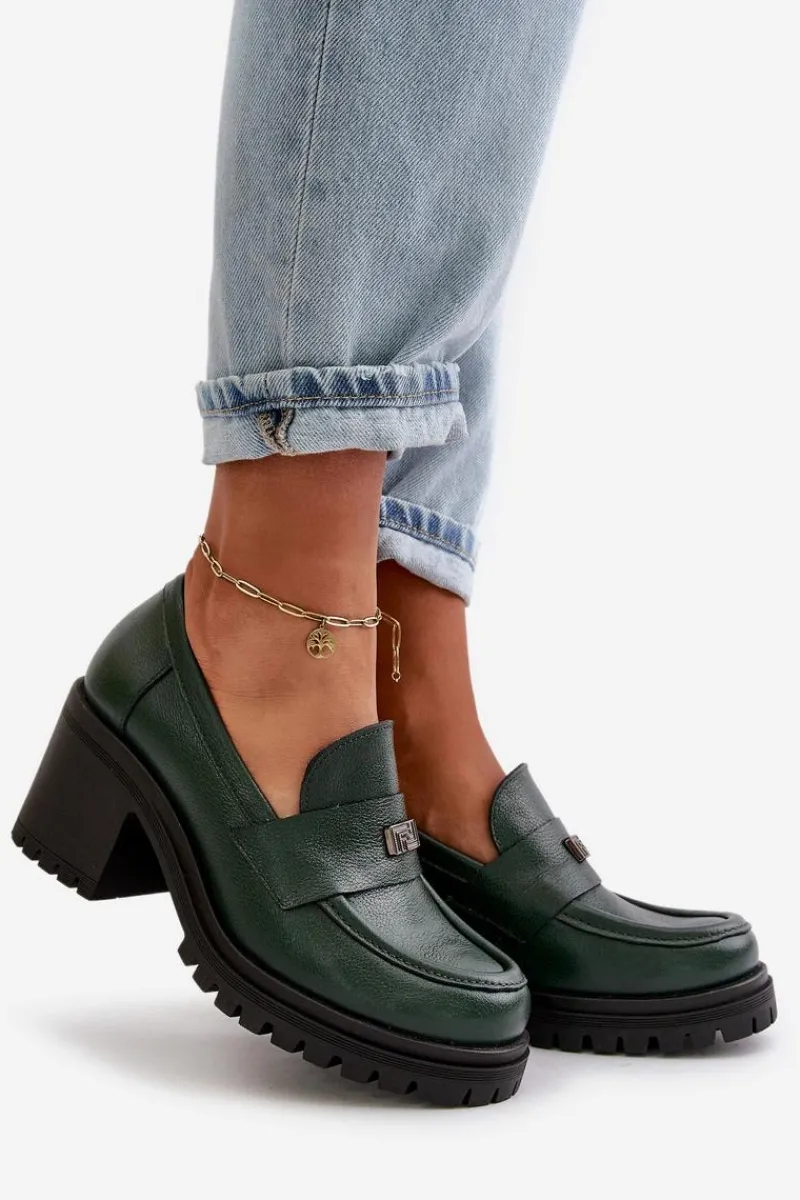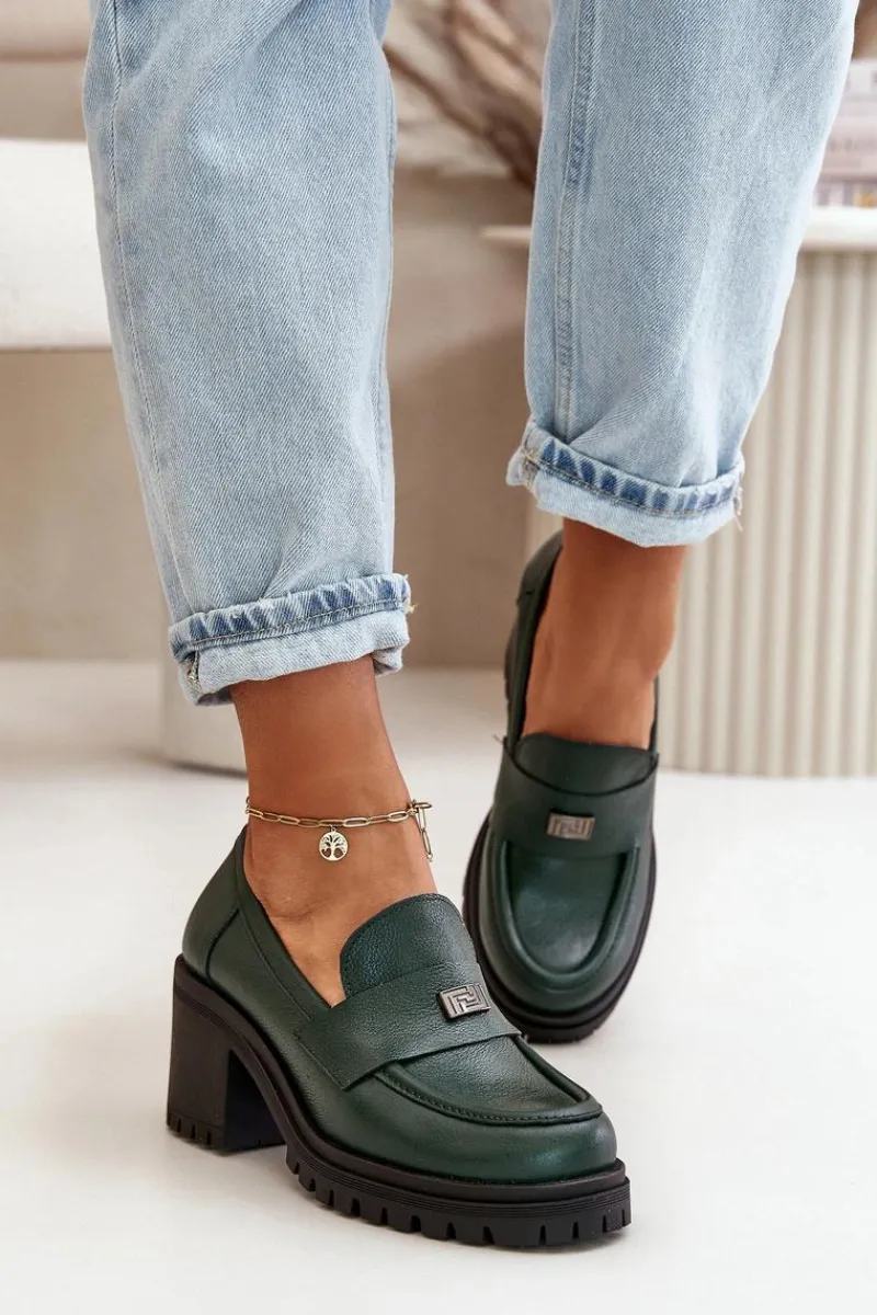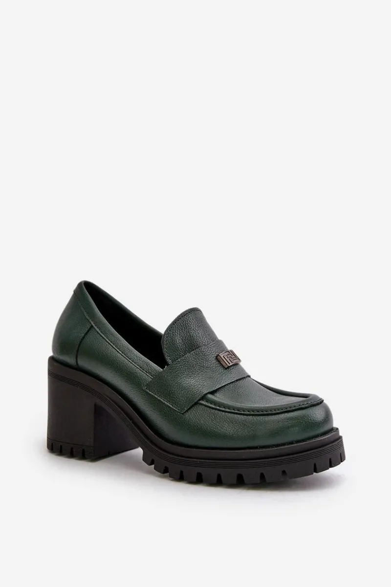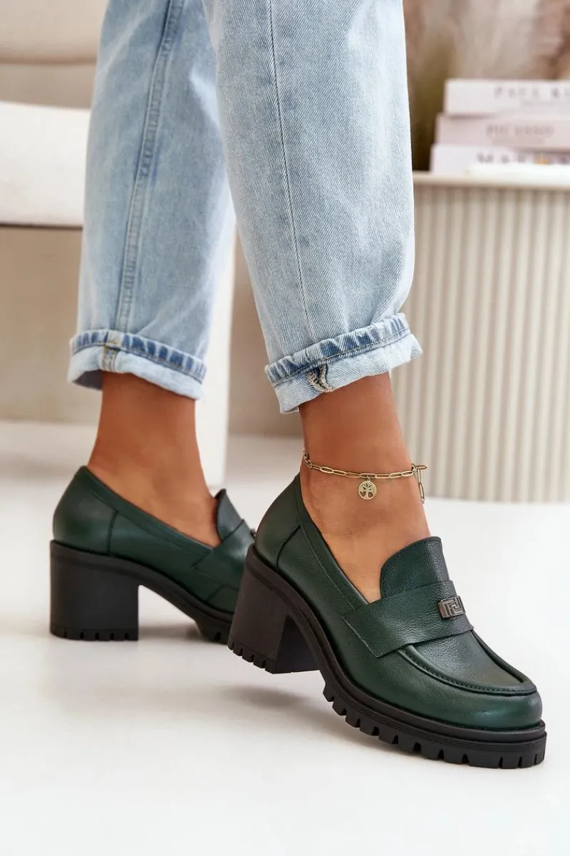 Discount 20168 Eleganckie Półbuty Damskie Na Słupku Skóra Naturalna Ciemnozielone Damskie Półbuty Skórzane