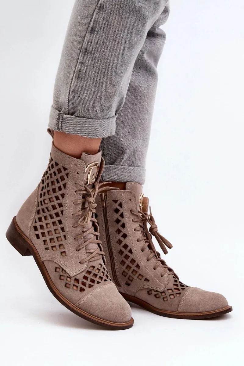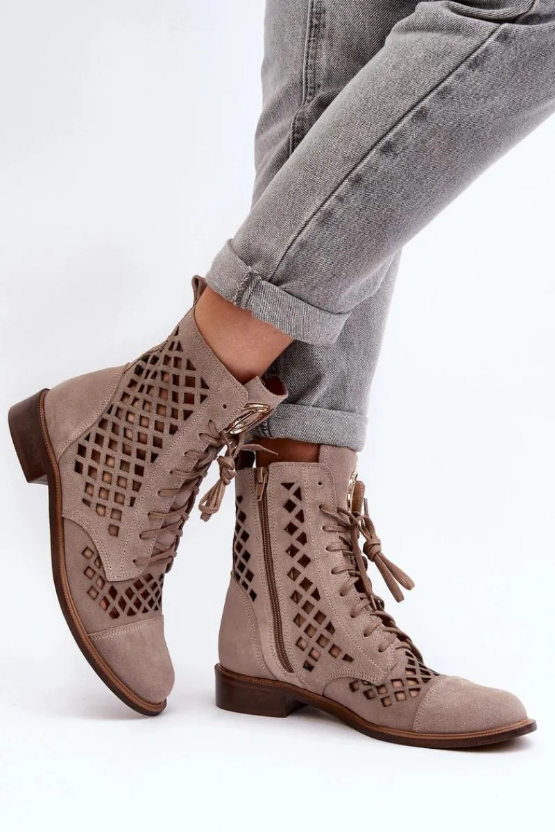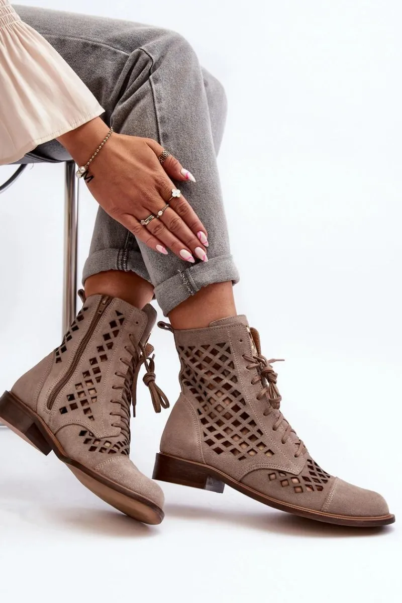 Wyjątkowe, ażurowe botki damskie. Wykonane są w całości ze skóry naturalnej z dbałością o każdy detal. Skórzana wkładka oraz wygodny, płaski obcas zadbają o Twój komfort. Botki dopełnią wiele stylizacji. Zapinane na suwak oraz wiązane. Przy wyborze rozmiaru prosimy sugerować się tabelą rozmiarów.