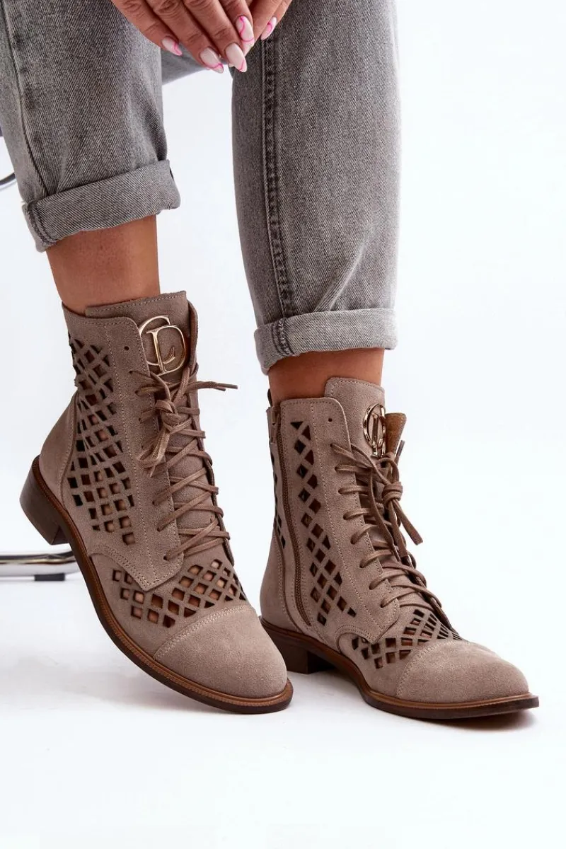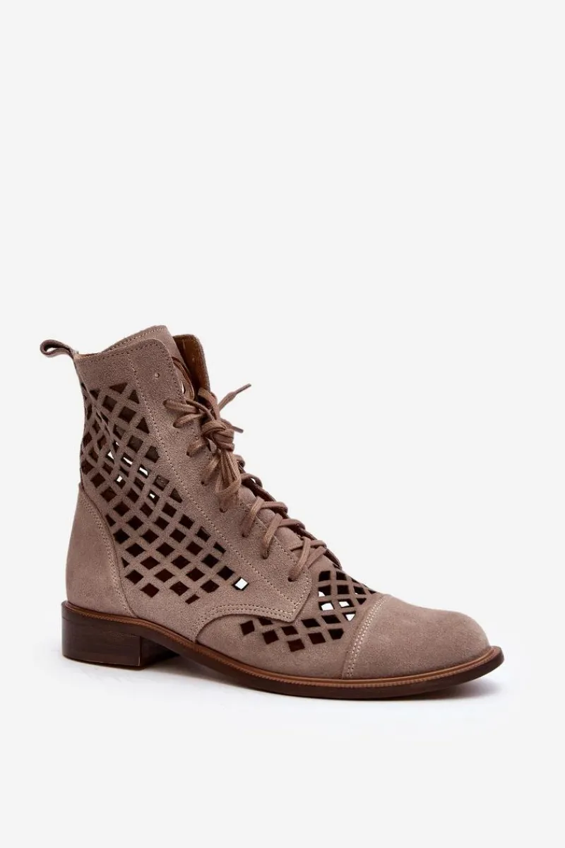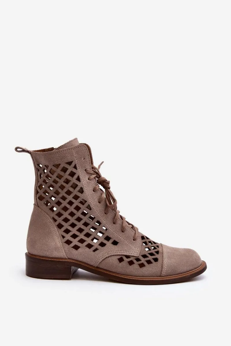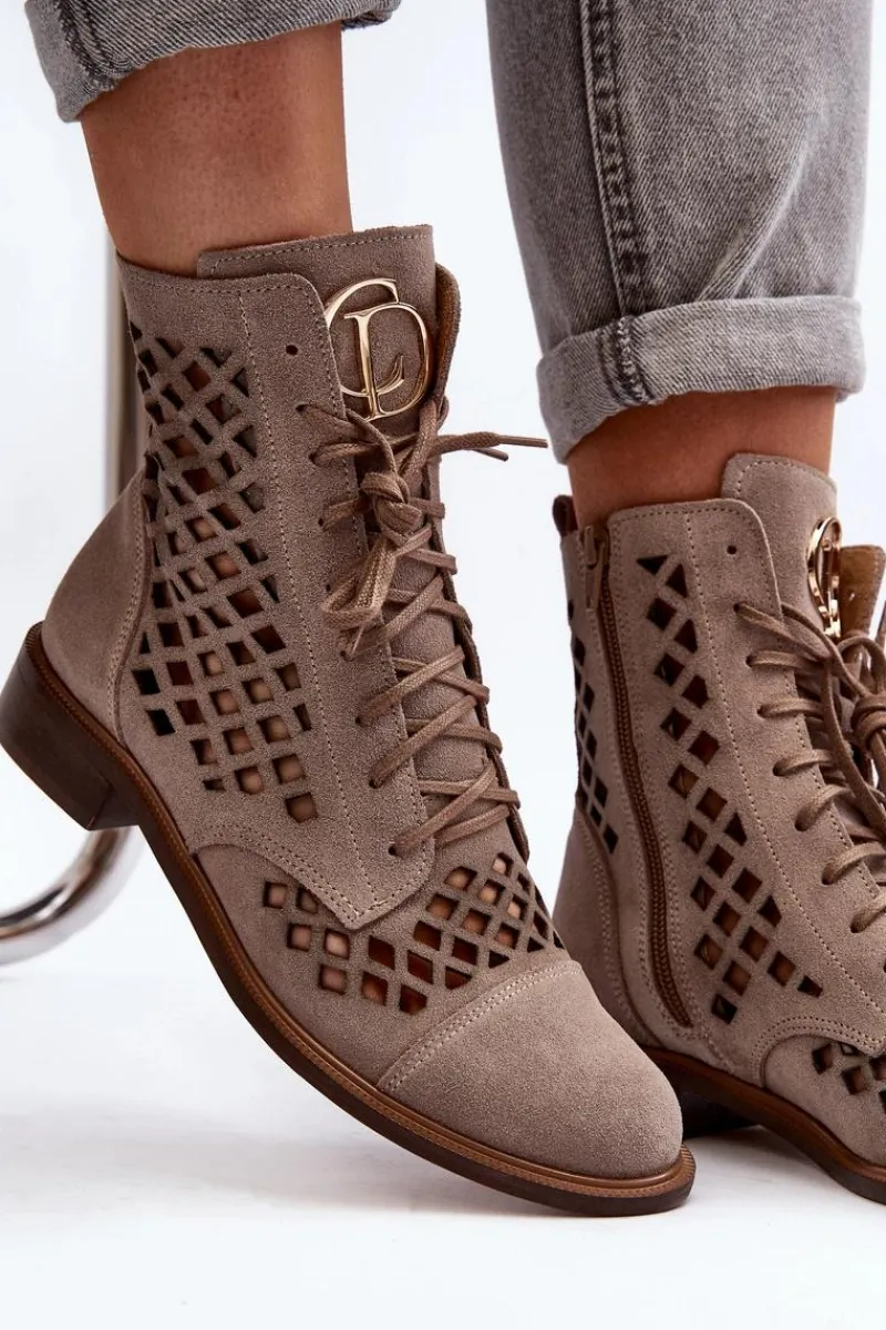 Wyjątkowe, ażurowe botki damskie. Wykonane są w całości ze skóry naturalnej z dbałością o każdy detal. Skórzana wkładka oraz wygodny, płaski obcas zadbają o Twój komfort. Botki dopełnią wiele stylizacji. Zapinane na suwak oraz wiązane. Przy wyborze rozmiaru prosimy sugerować się tabelą rozmiarów.