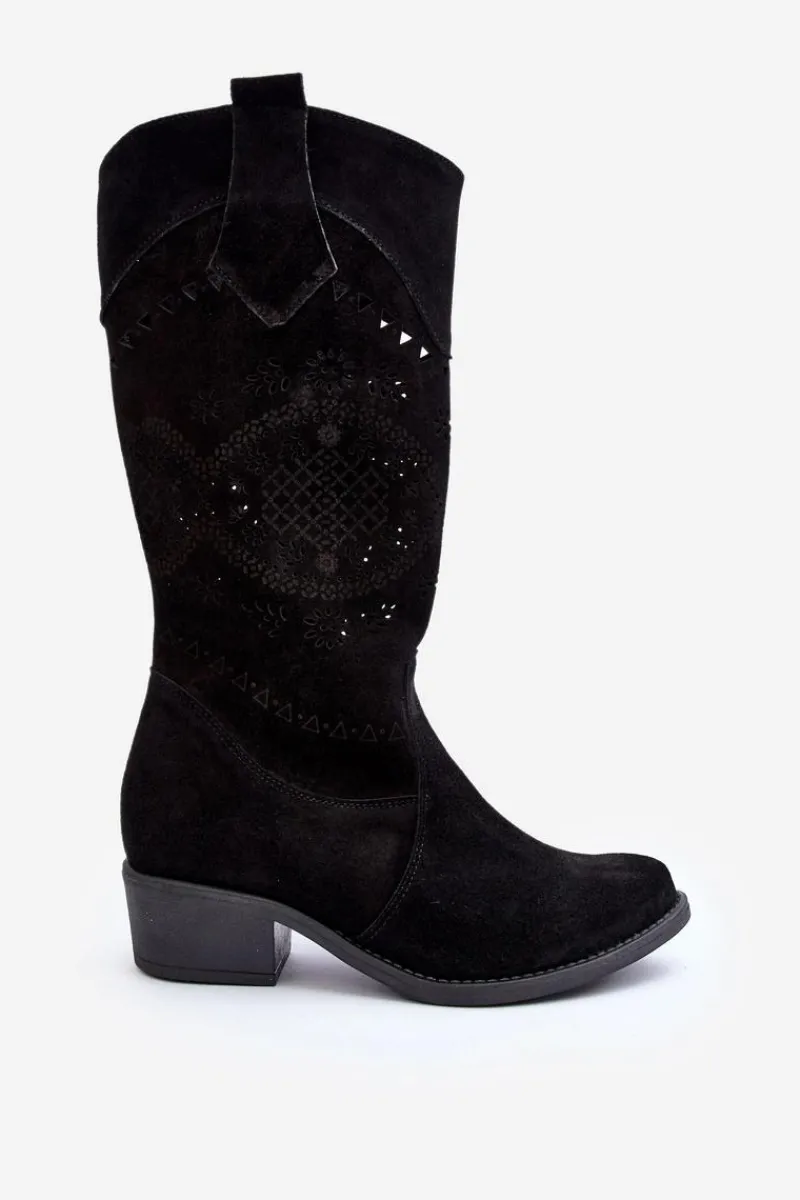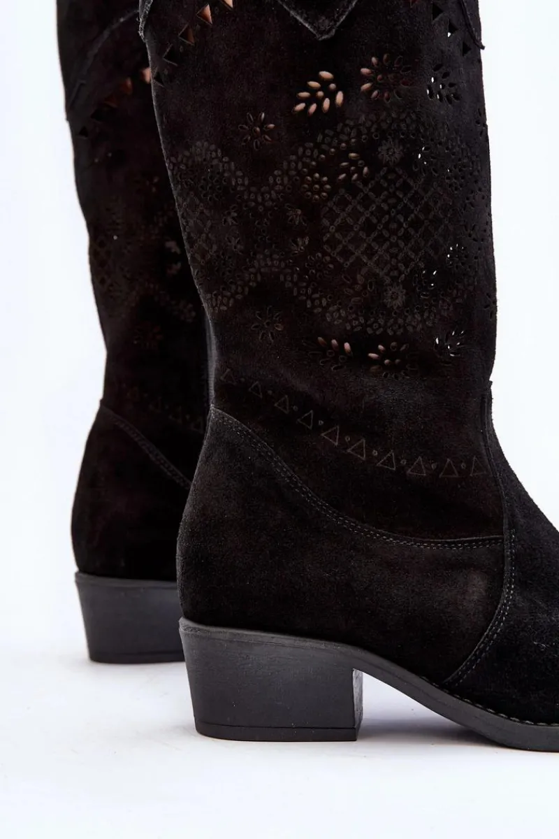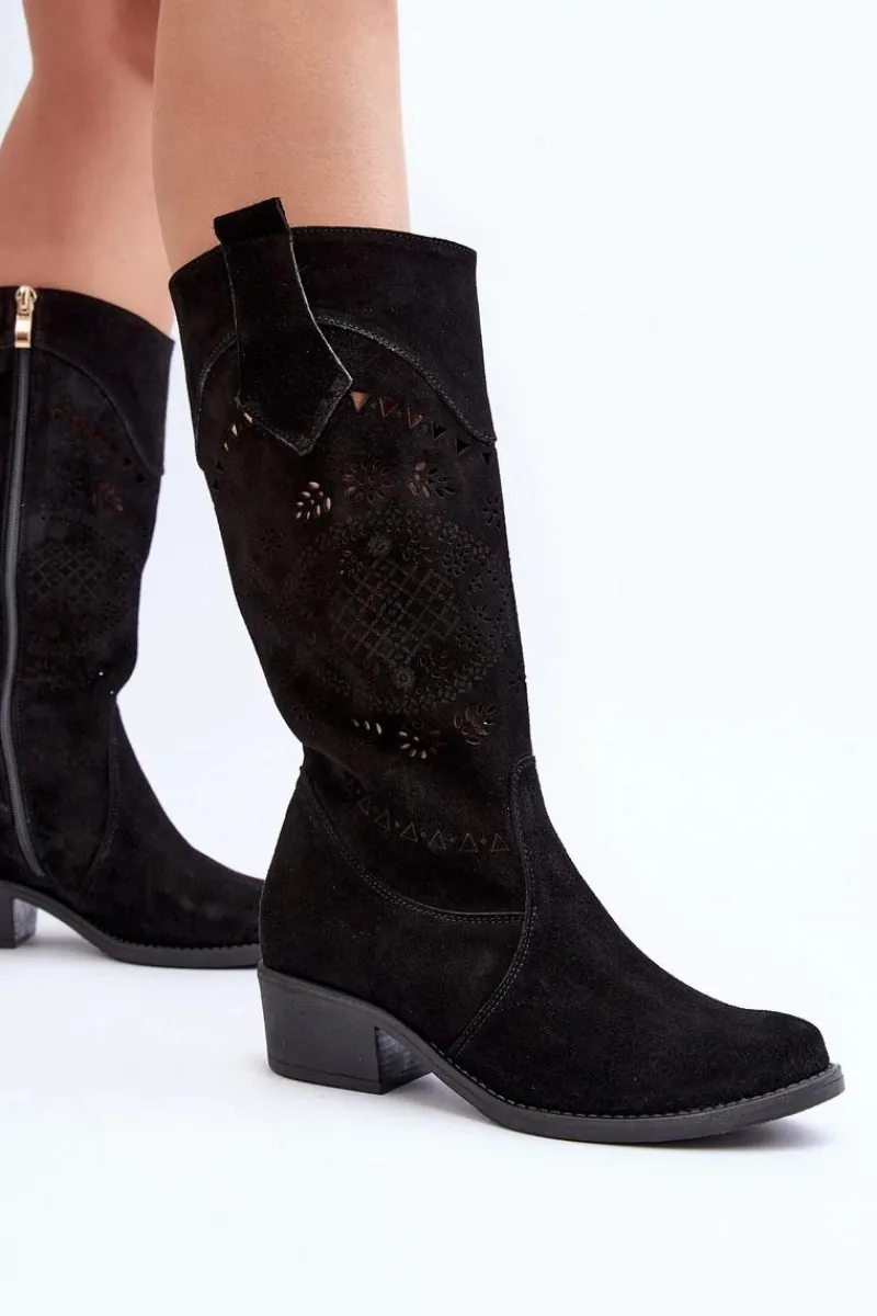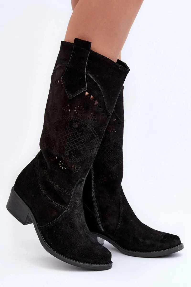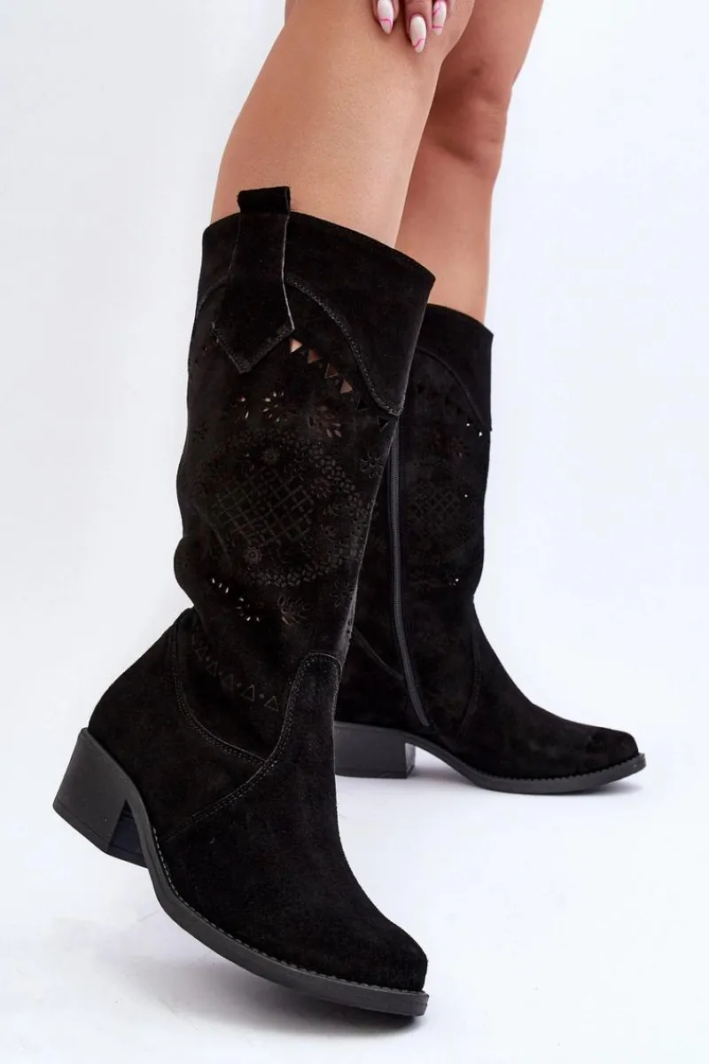 Ażurowe kozaki damskie idealnie dopełnią wiosenne stylizacje. Wykonane ze skóry naturalnej zamszowej. Osadzone na niskim obcasie. Cholewka do połowy łydki zapinana suwakiem. Noski w migdał. Miękka wkładka zapewni wygodę podczas użytkowania. Przy wyborze rozmiaru prosimy sugerować się tabelą rozmiarów.